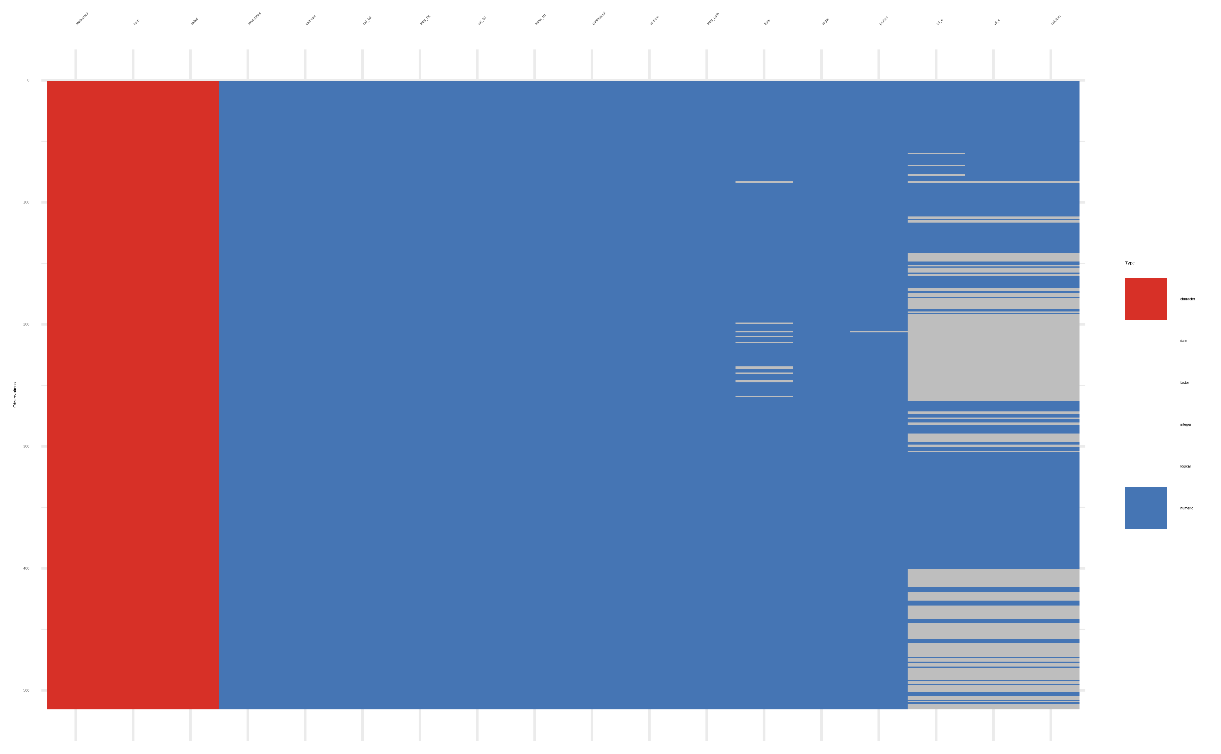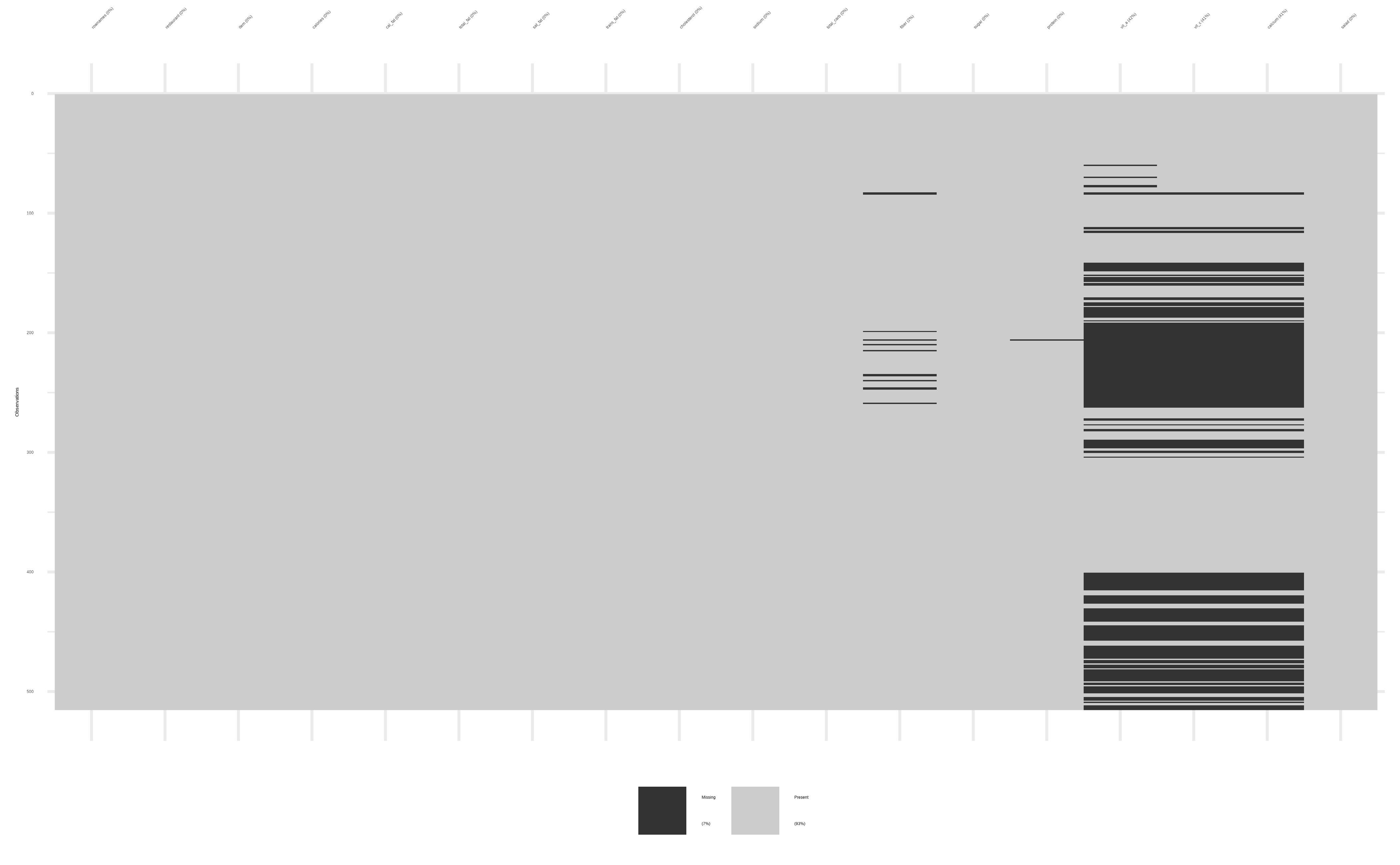stats::setNames(c("Row ID", "Restaurant", "Dish", "Calories", "Calories from fat", "Total Fat (g)", "Saturated Fat (g)", "Trans Fat (g)", "Cholesterol (mg)", "Sodium (mg)", "Carbohydrates (g)", "Fiber (g)", "Sugars (g)", "Protein (g)", "Vitamin A (% DV)", "Vitamin C (% DV)", "Calcium (% DV)", "Iron (% DV)"))| Row ID | Restaurant | Dish | Calories | Calories from fat | Total Fat (g) | Saturated Fat (g) | Trans Fat (g) | Cholesterol (mg) | Sodium (mg) | Carbohydrates (g) | Fiber (g) | Sugars (g) | Protein (g) | Vitamin A (% DV) | Vitamin C (% DV) | Calcium (% DV) | Iron (% DV) |