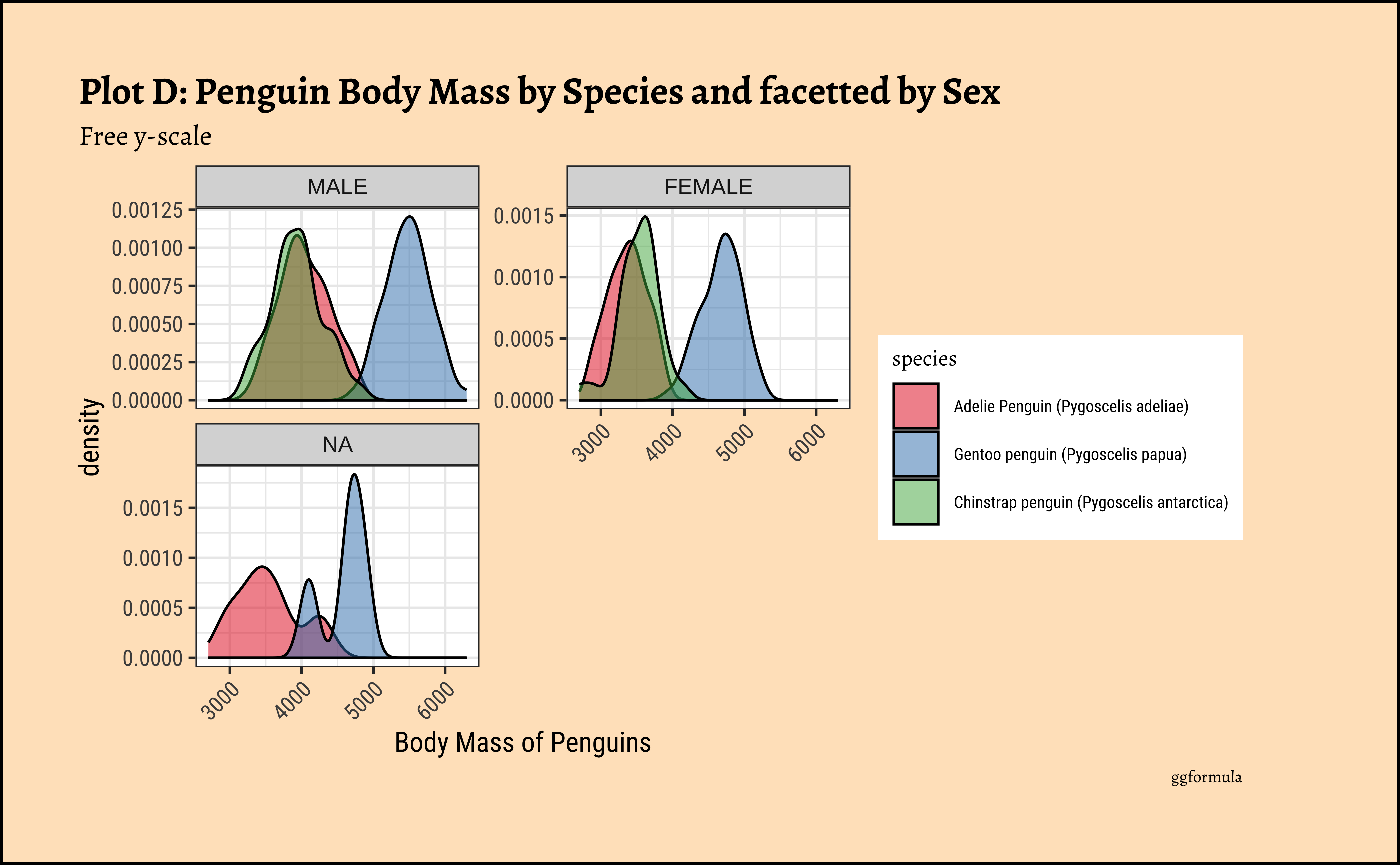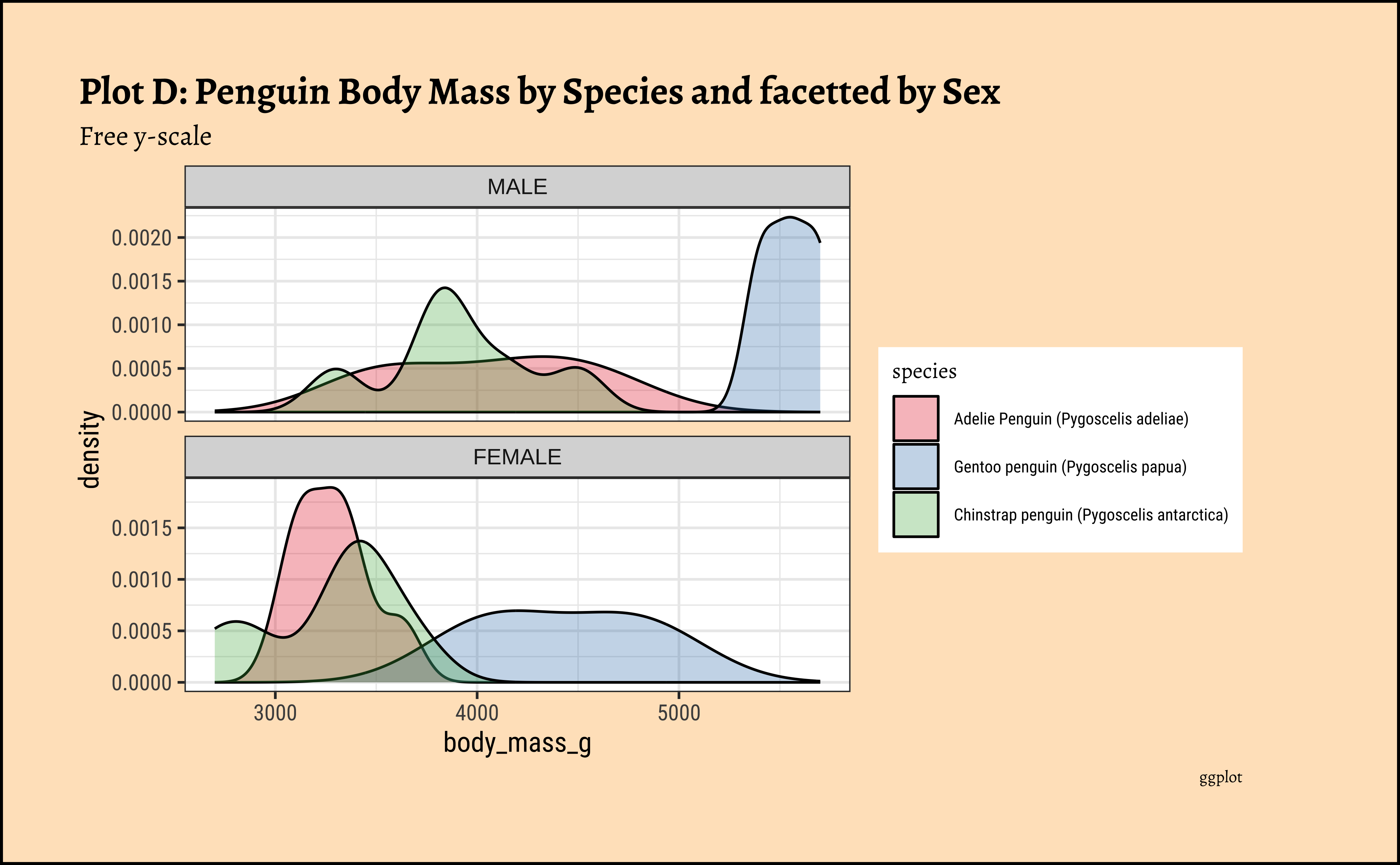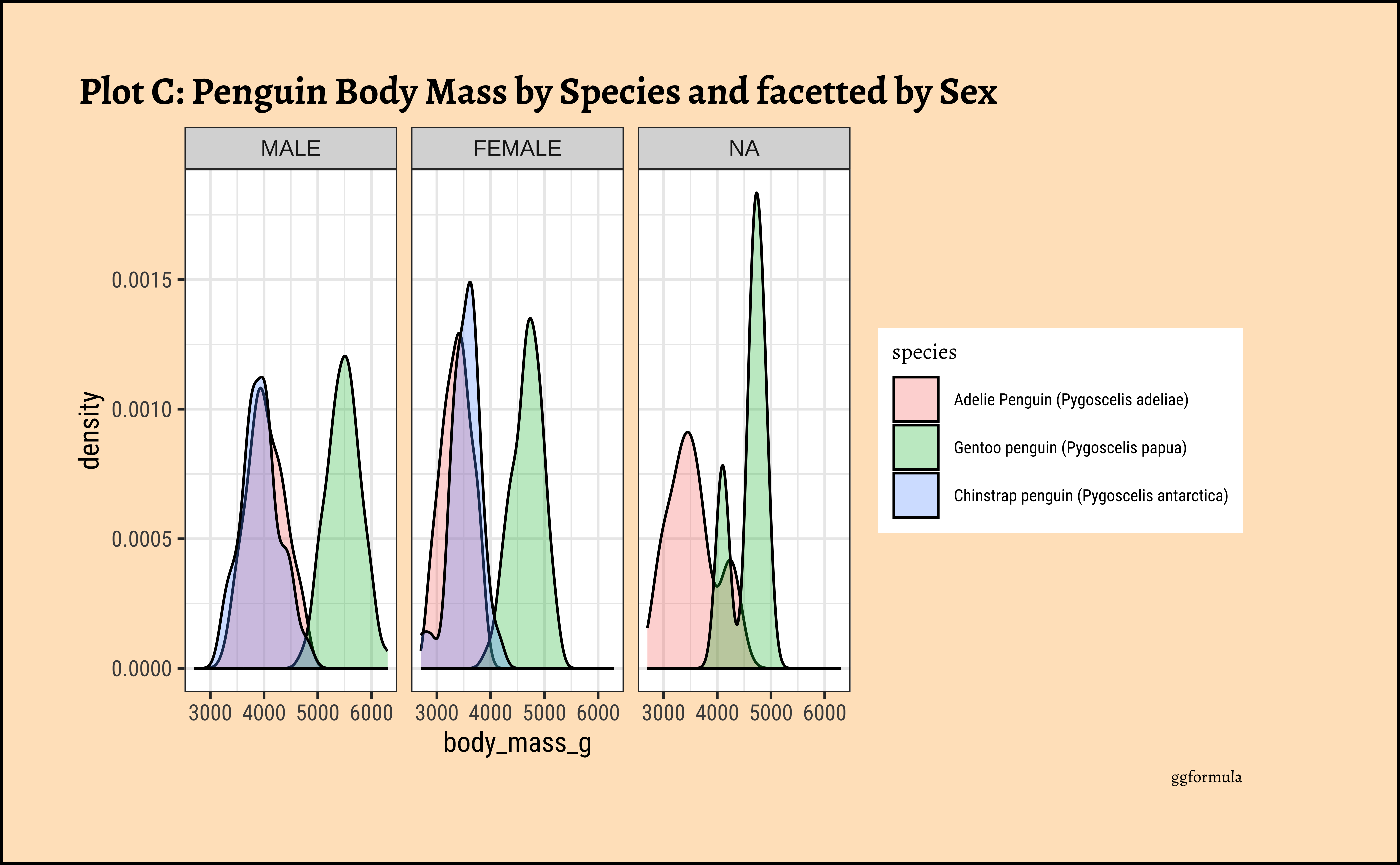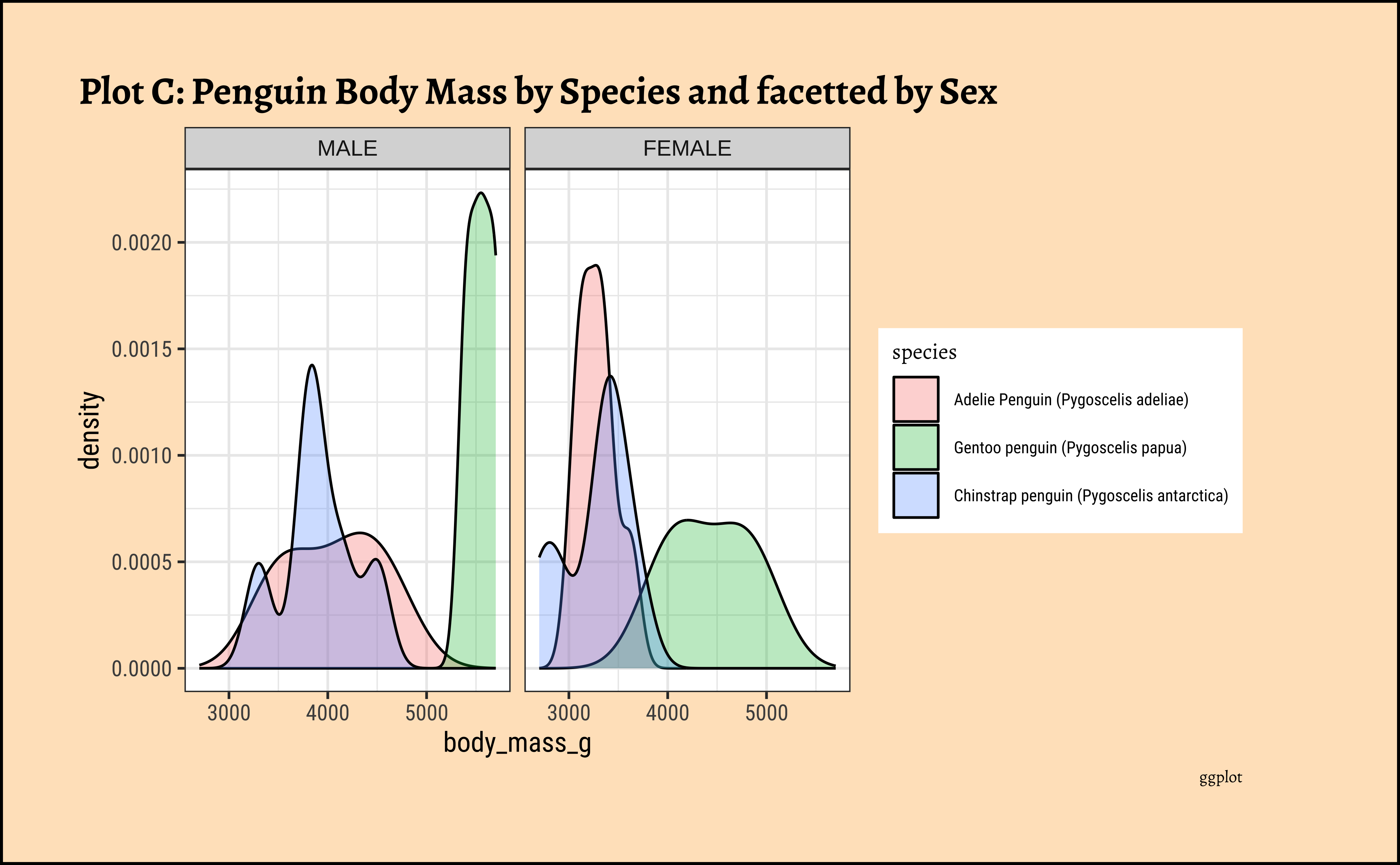labs(title = "Plot C: Penguin Body Mass by Species and facetted by Sex", caption = "ggplot")