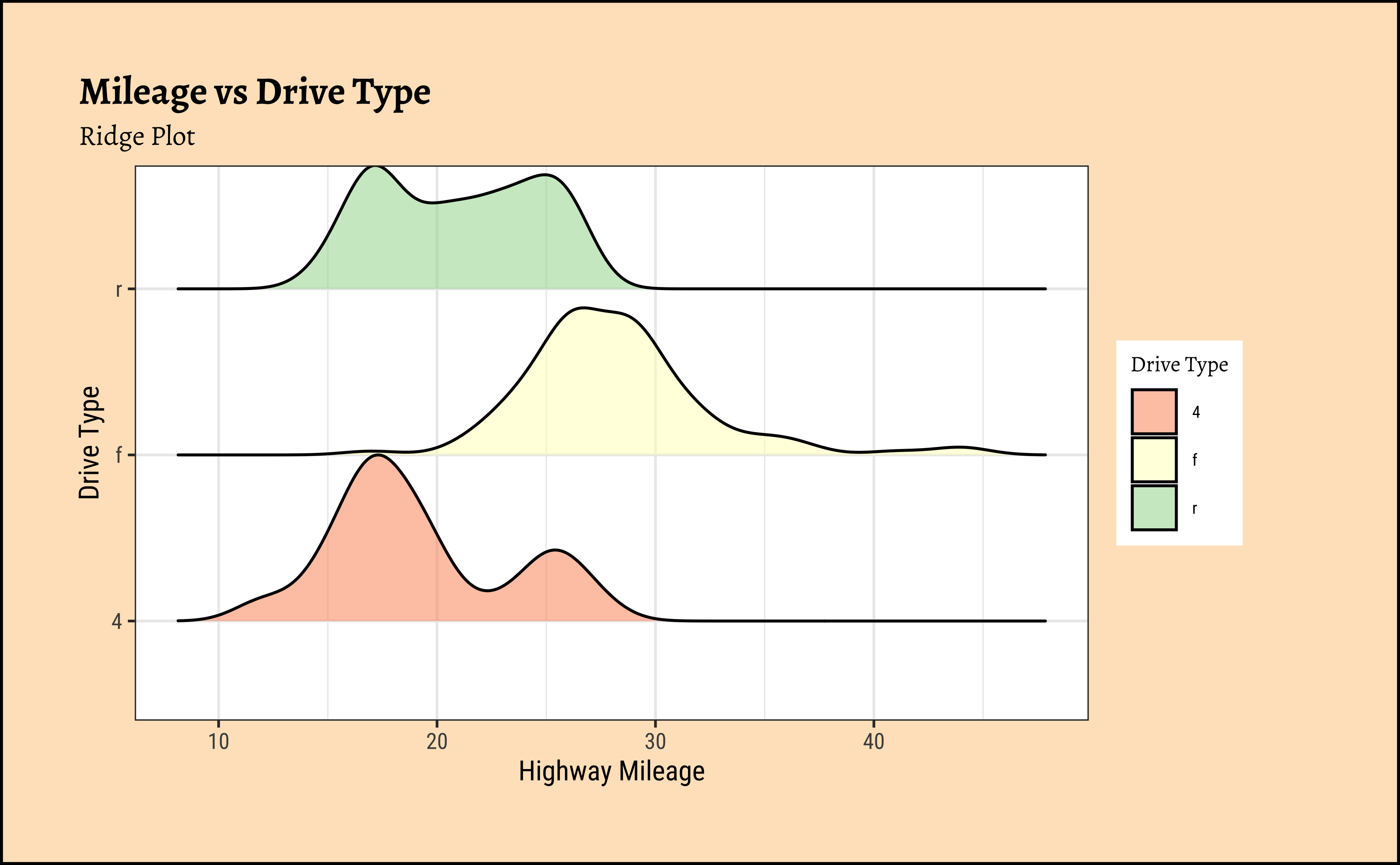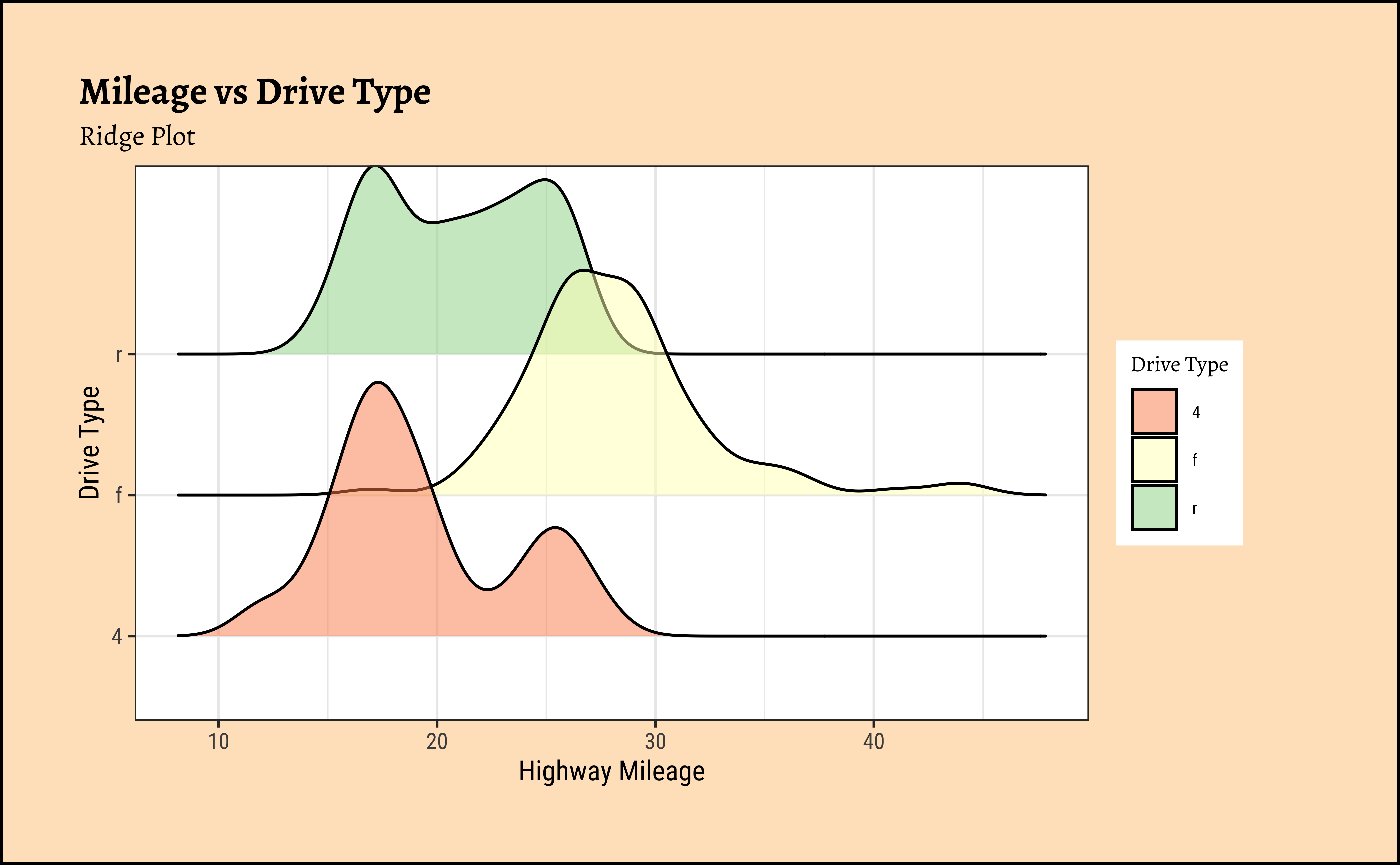 ggplot(data = mpg, mapping = aes(x = hwy, y = drv, fill = drv)) +