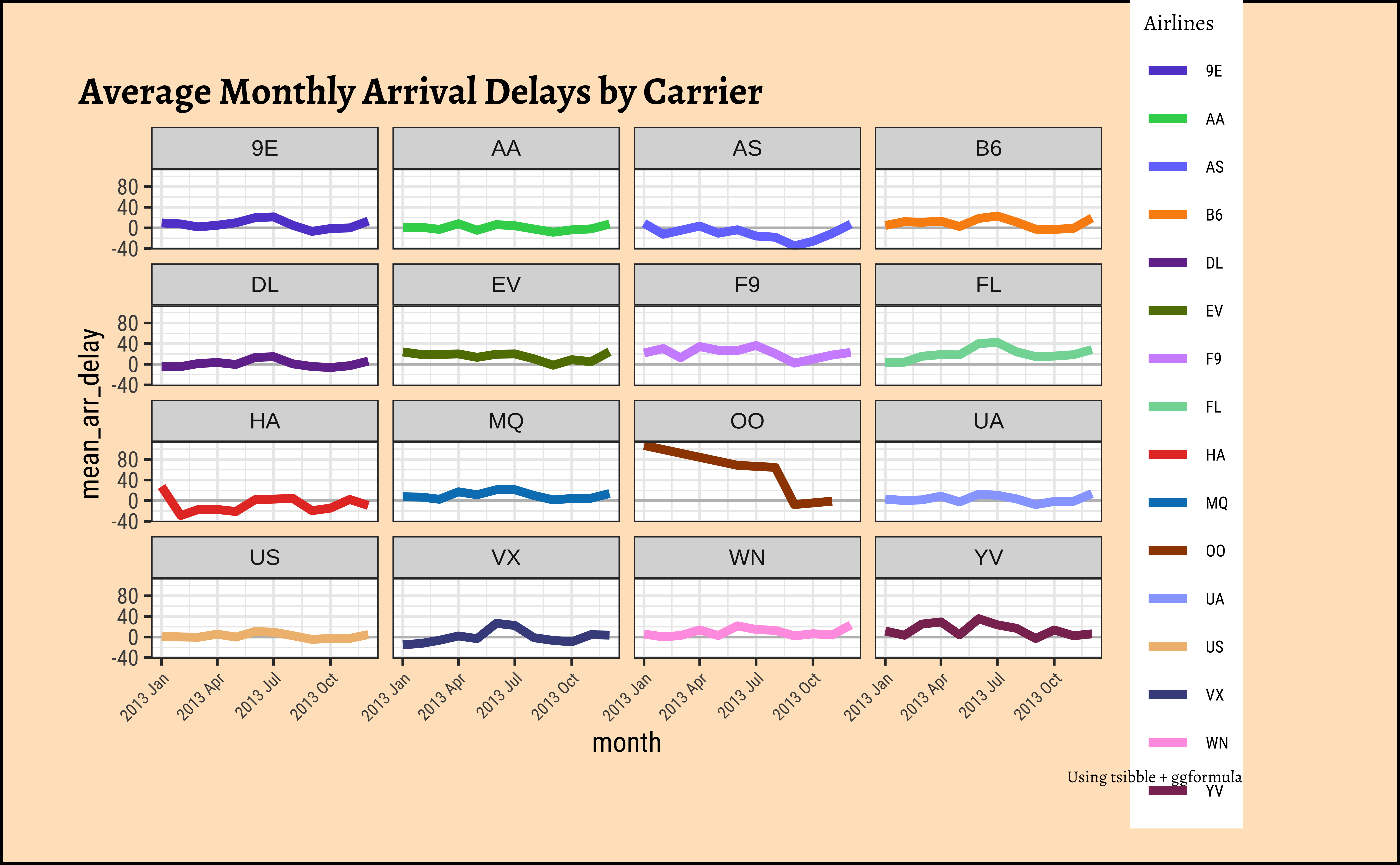 .title = "Average Monthly Arrival Delays by Carrier",