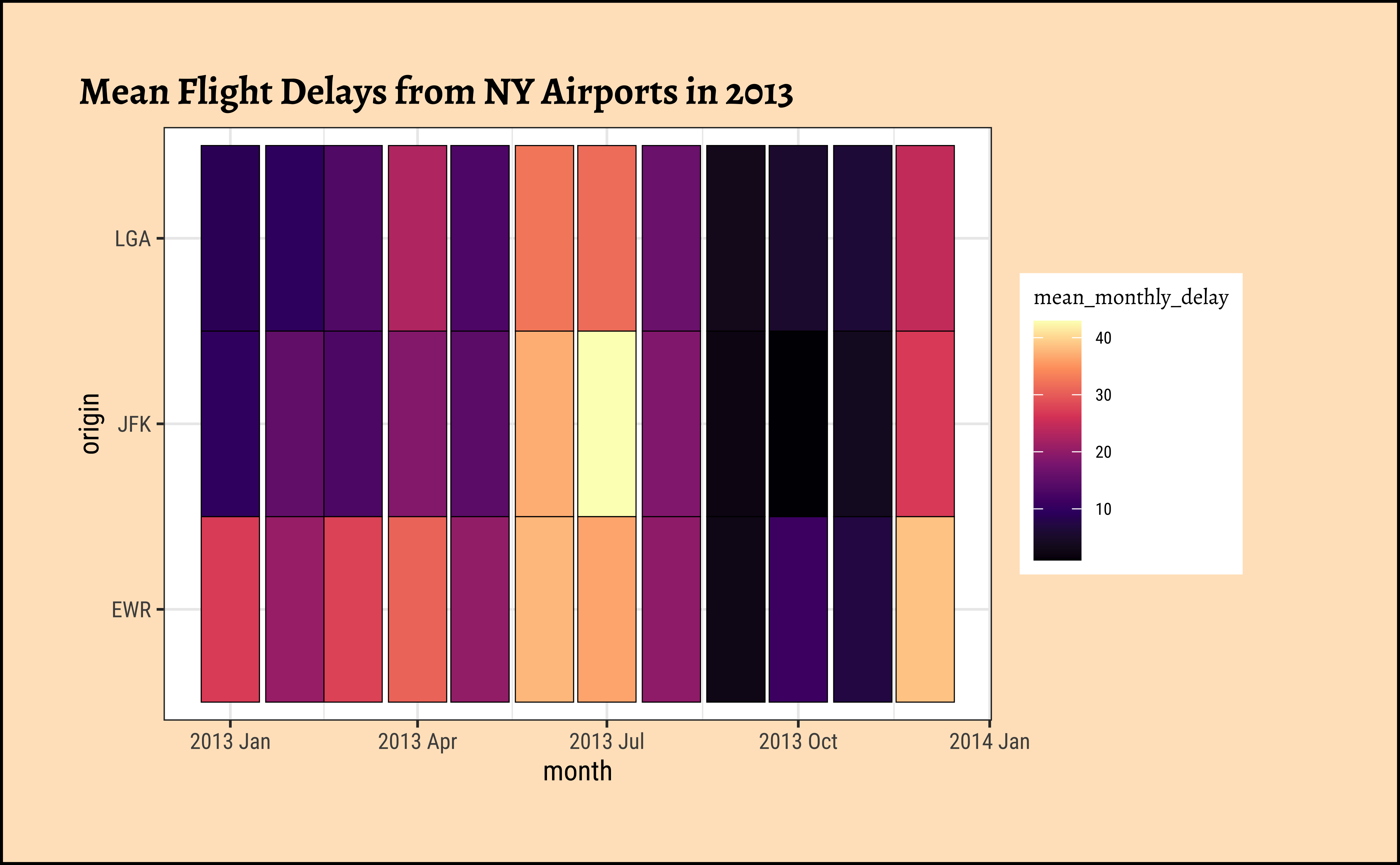 title = "Mean Flight Delays from NY Airports in 2013"