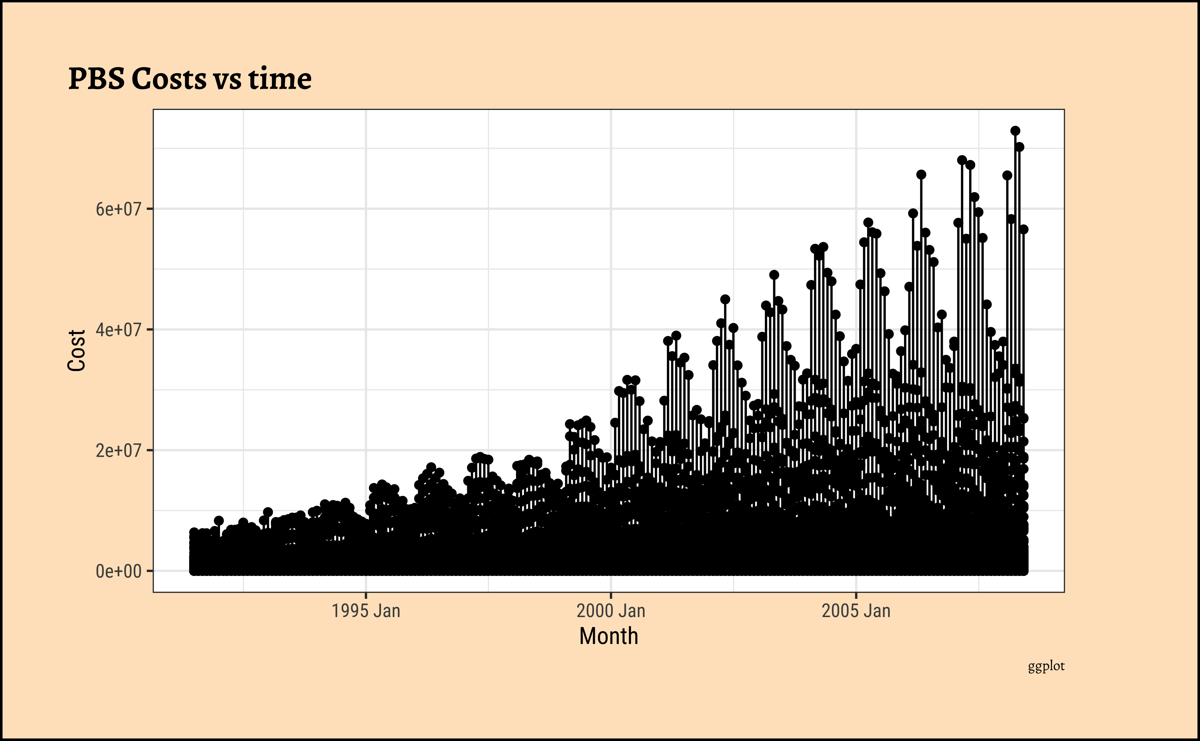 Note that there are multiple Quantitative variables (Scripts,Cost), each sliced into 336 time-series, a feature which is not supported in the ts format, but is supported in a tsibble. The Qualitative Variables are described below. (Type help("PBS") in your Console.)