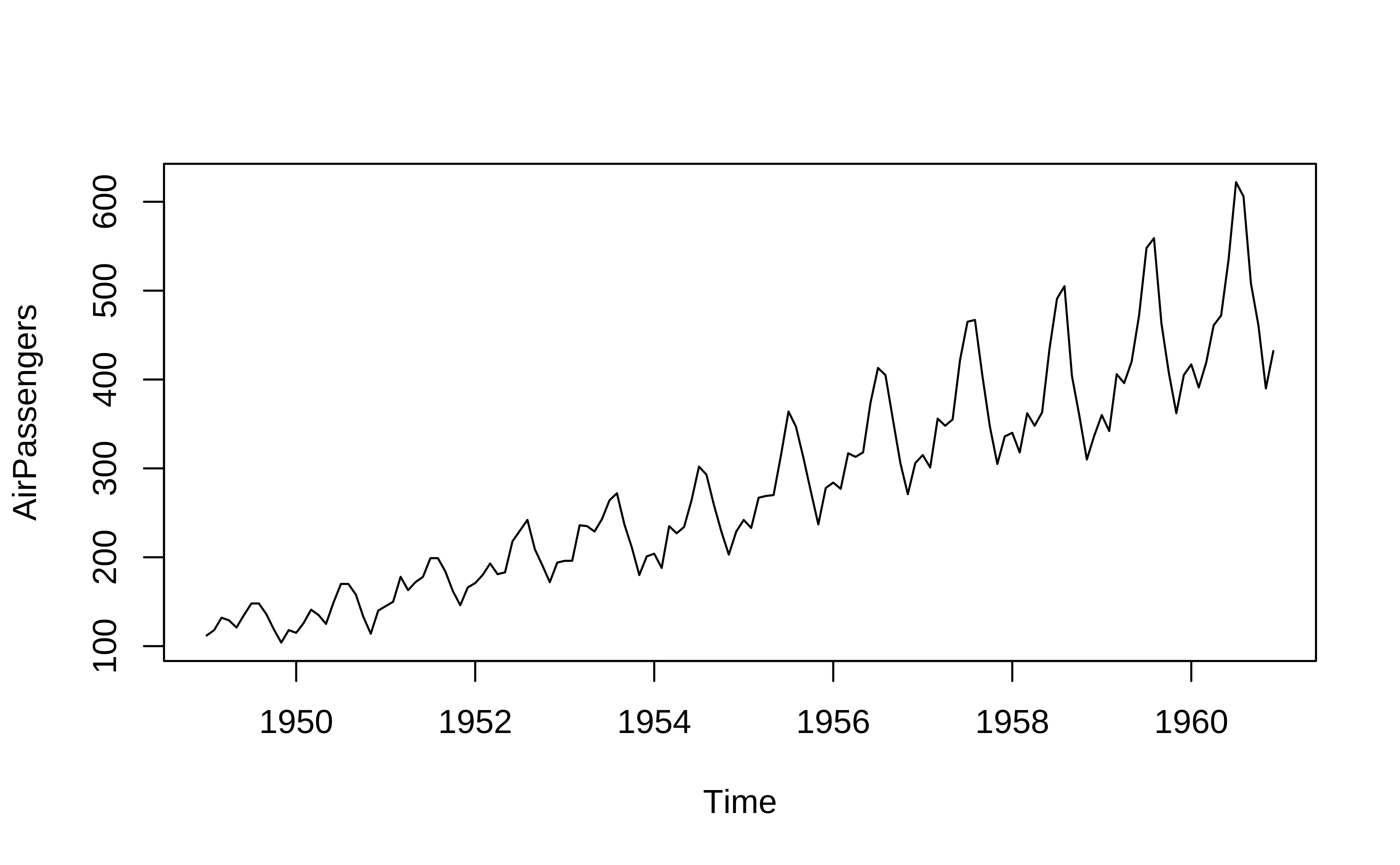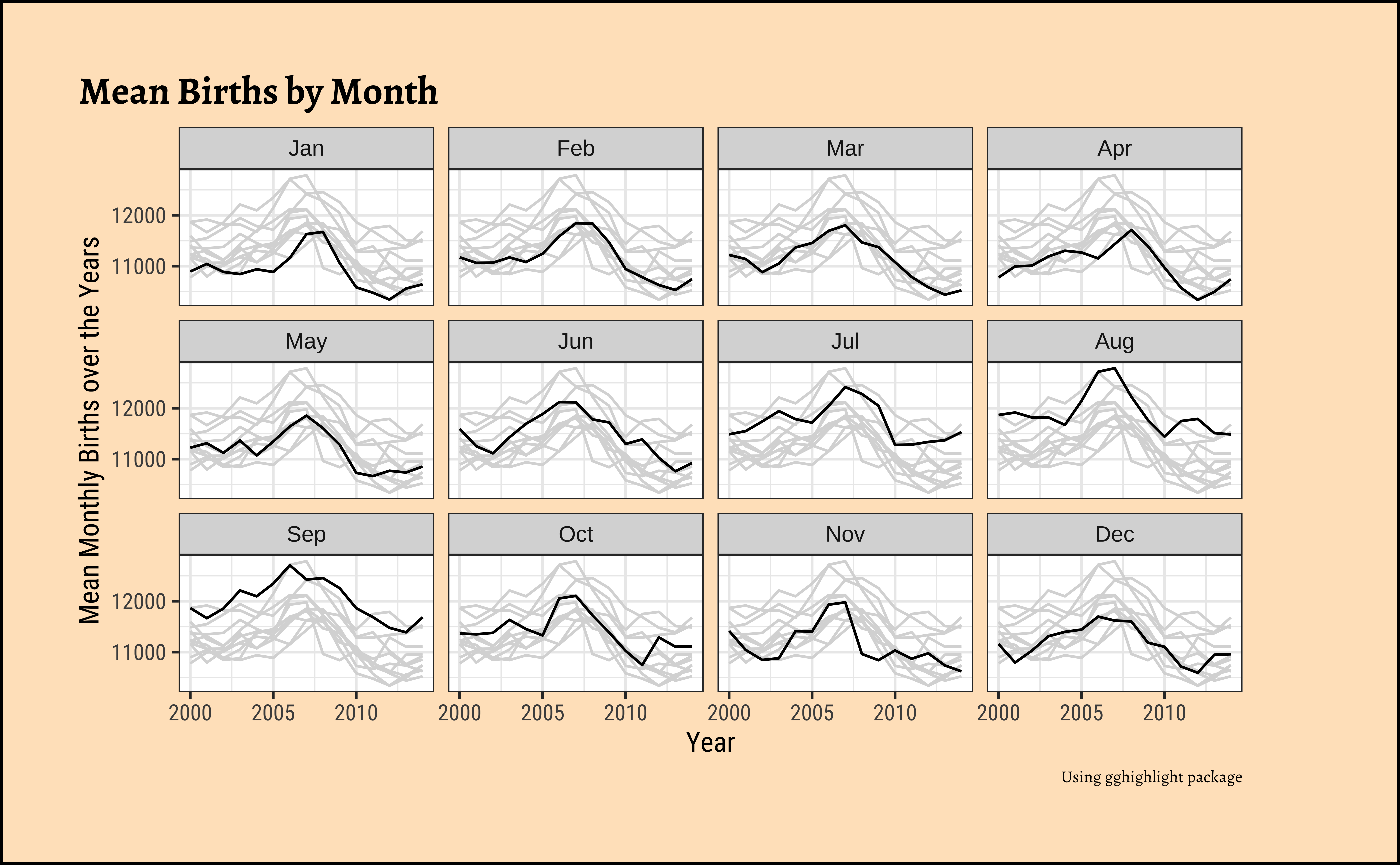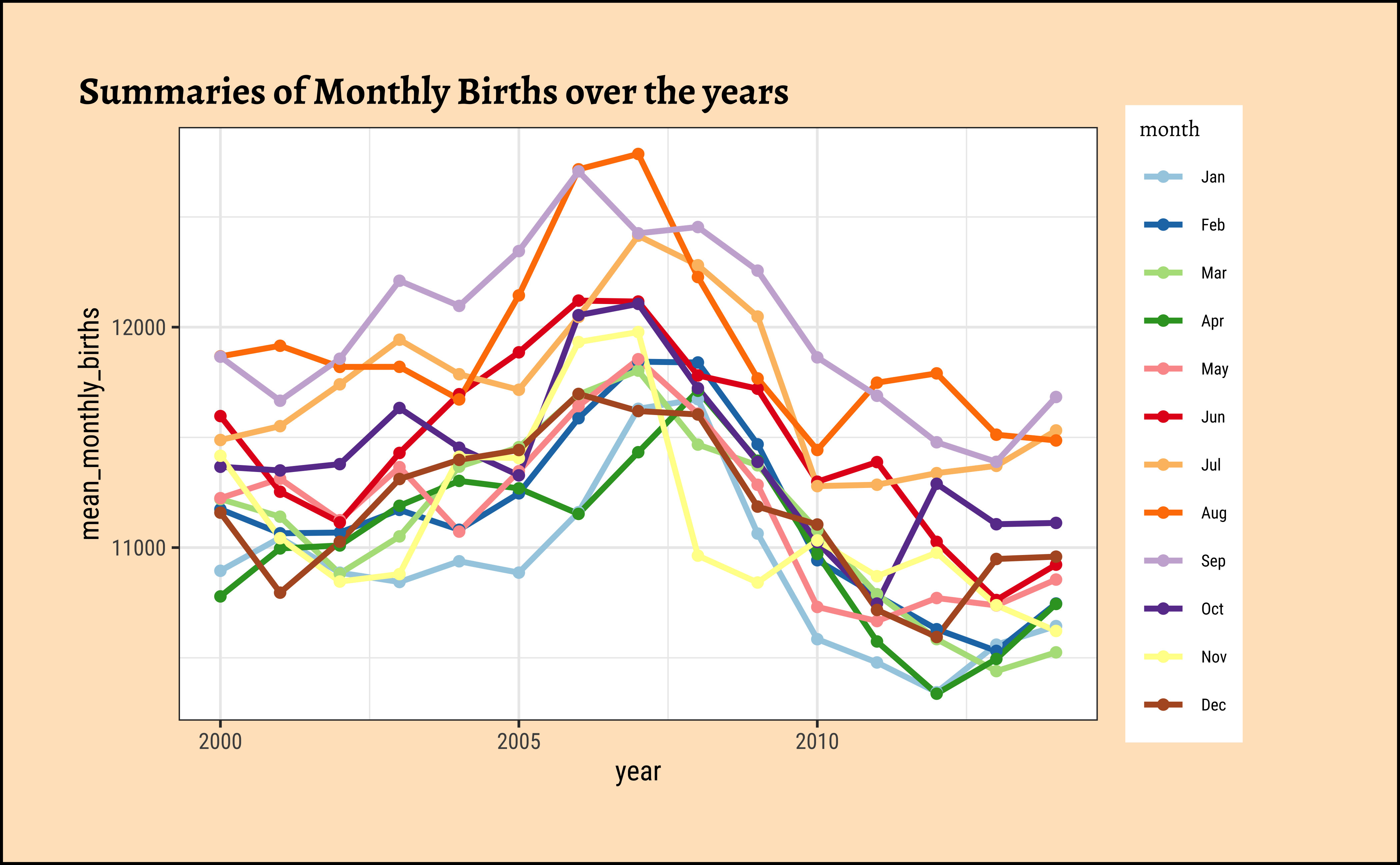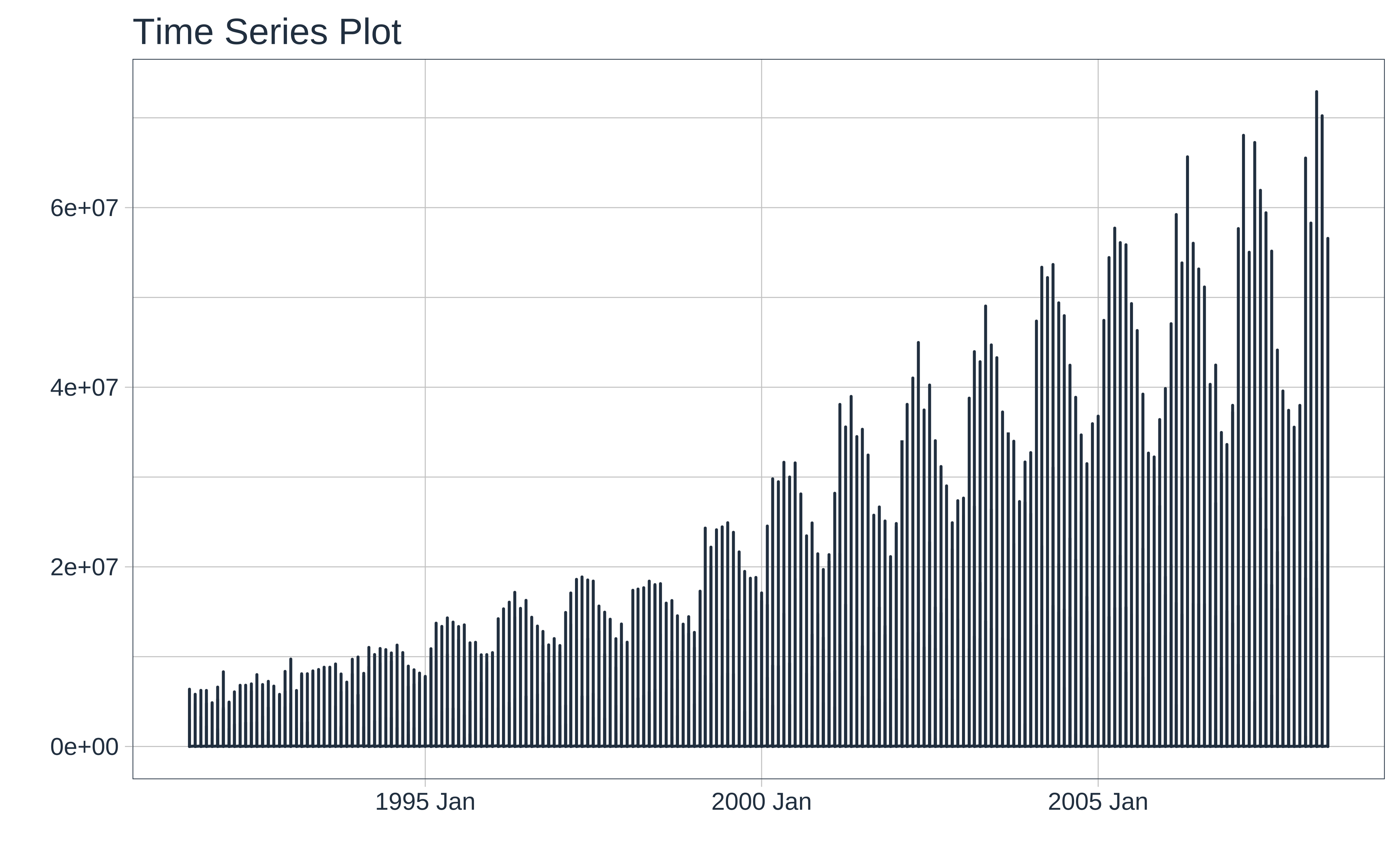 )This basic plot is quite messy. Other than an overall rising trend and more vigorous variations pointing to a multiplicative process, we cannot say more. There is simply too much happening here and it is now time (sic!) for us to look at summaries of the data using dplyr-like verbs.