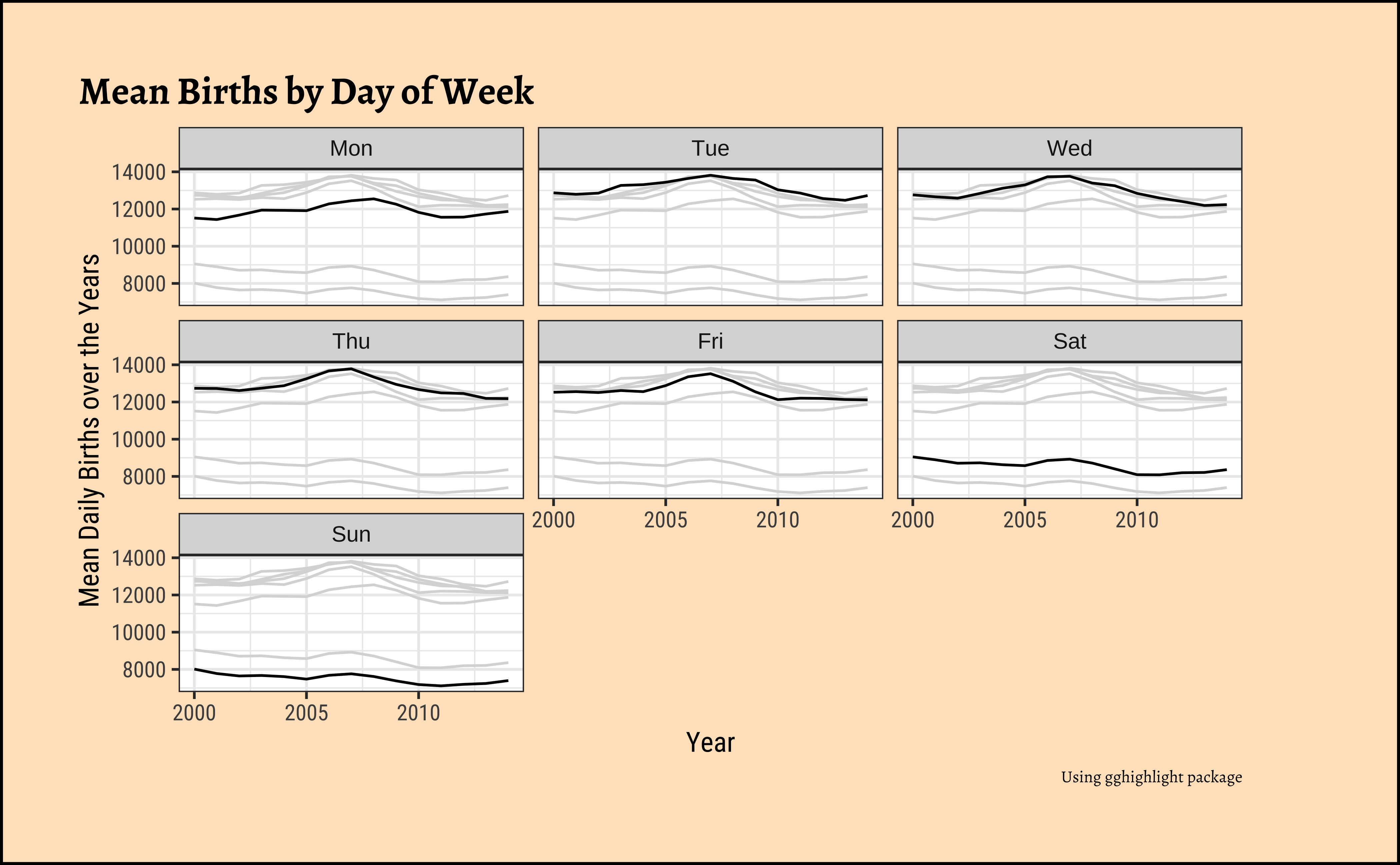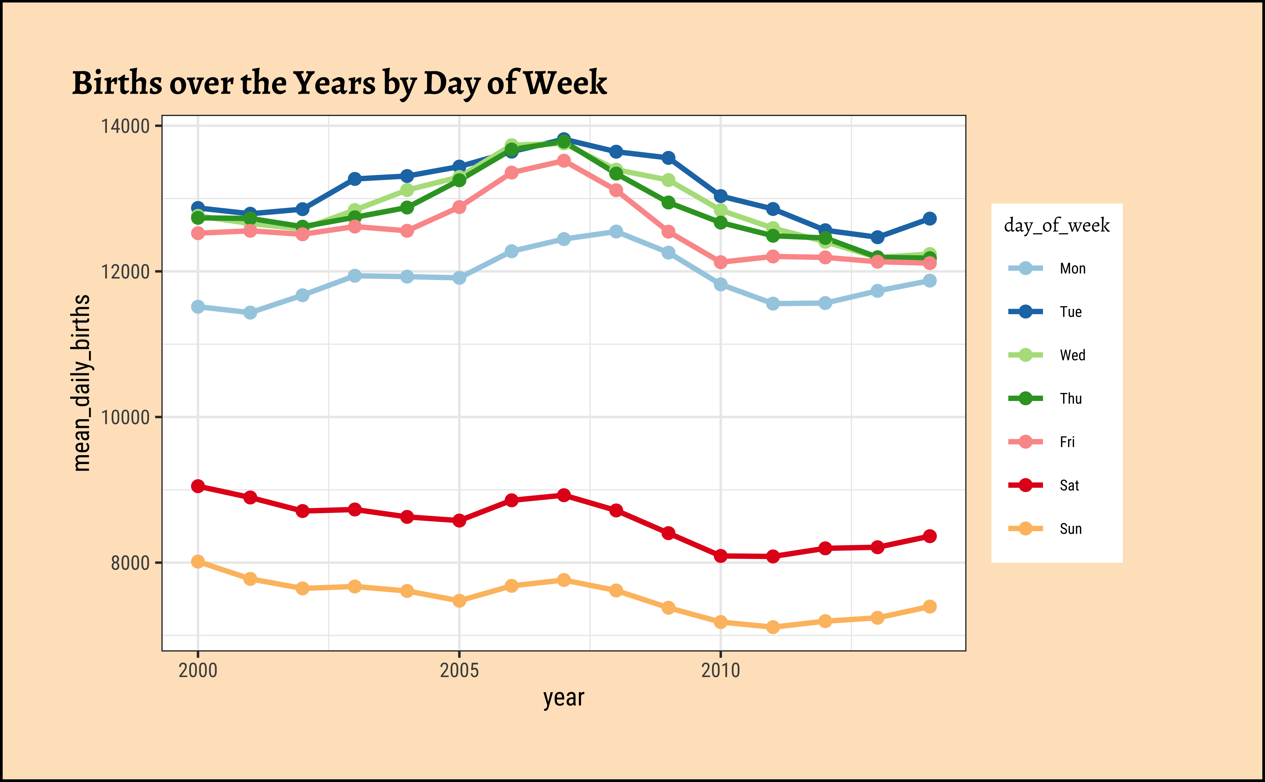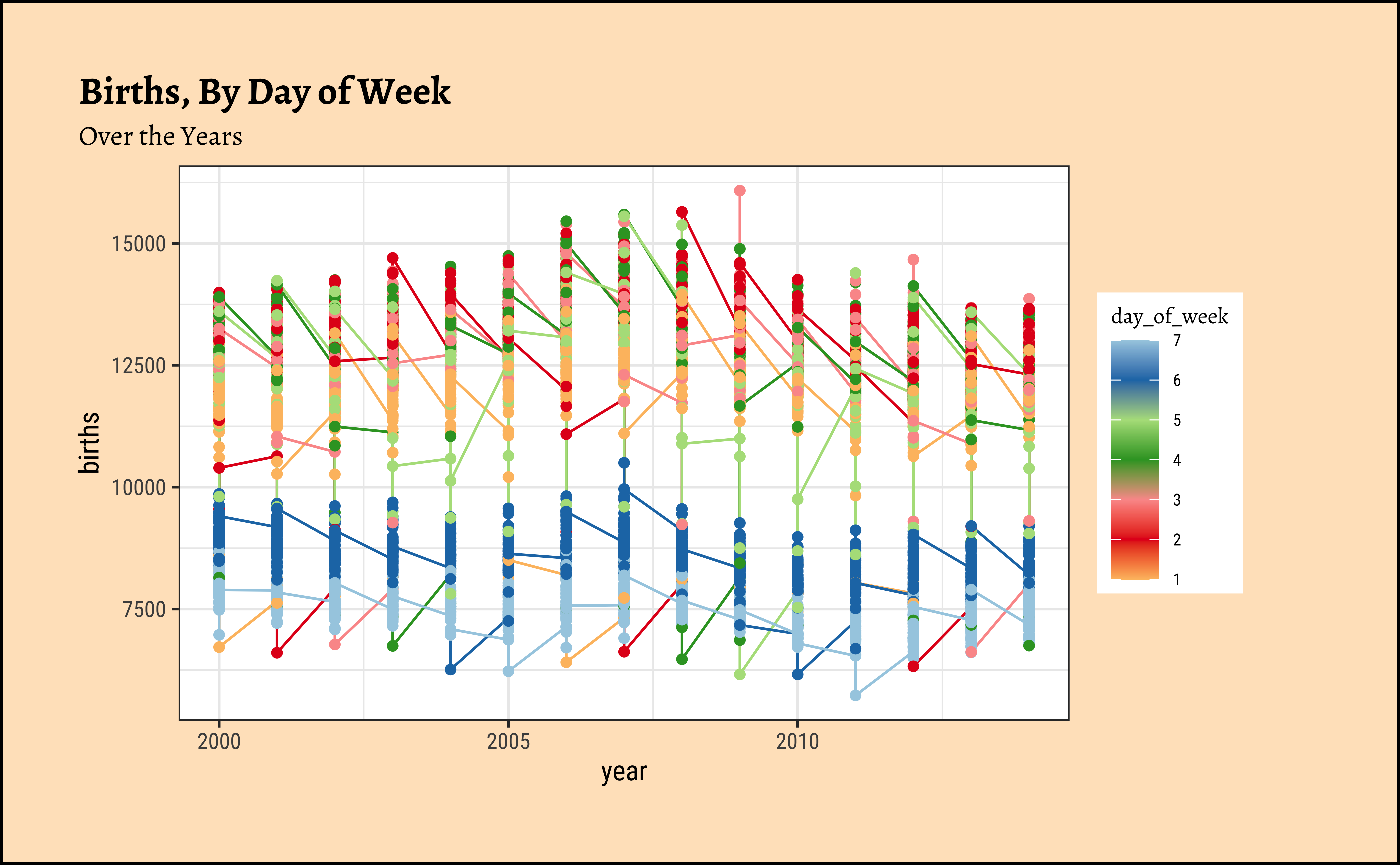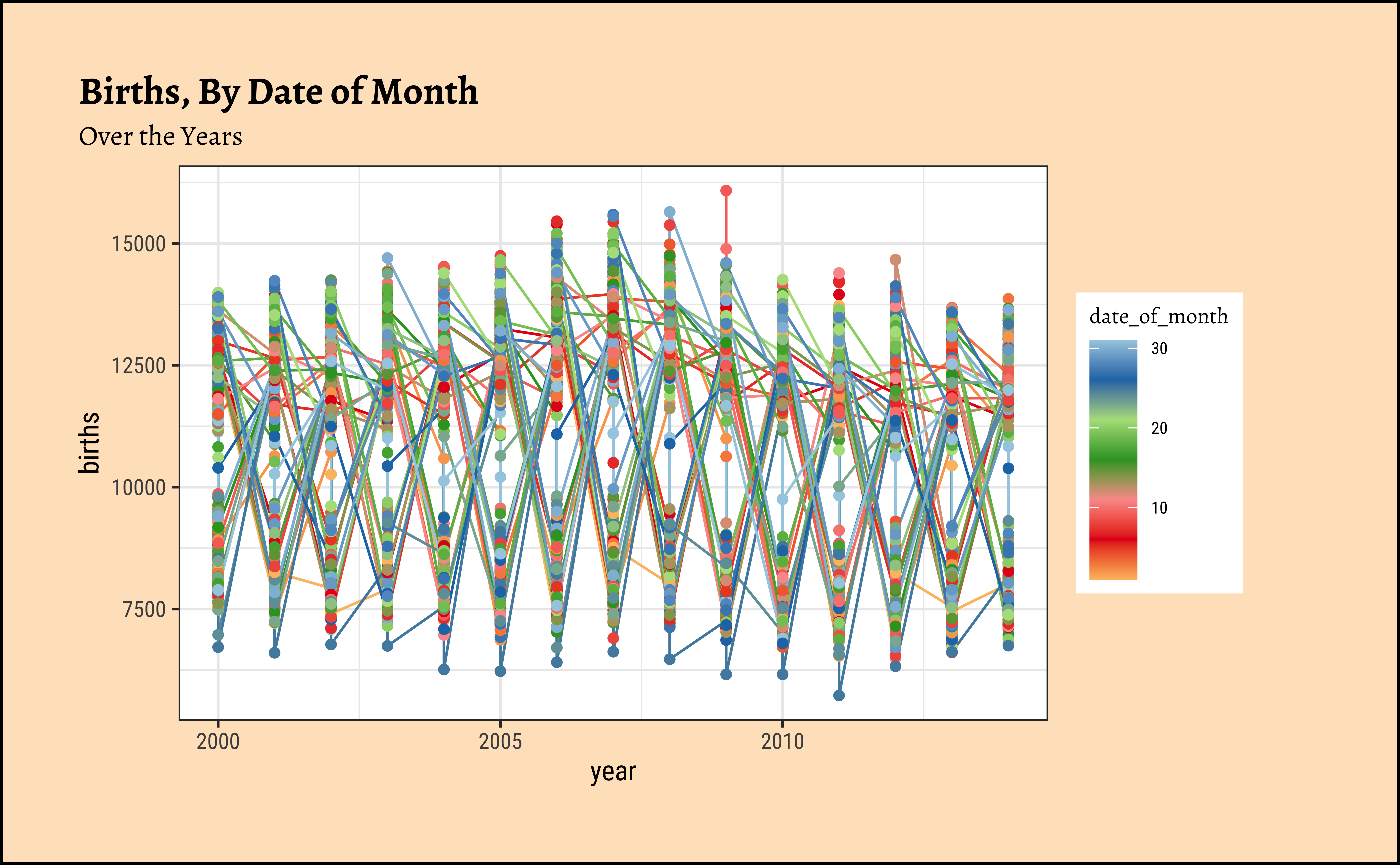How about a heatmap? We can cook up a categorical variable based on the number of births (low, fine, high) and use that to create a heatmap: