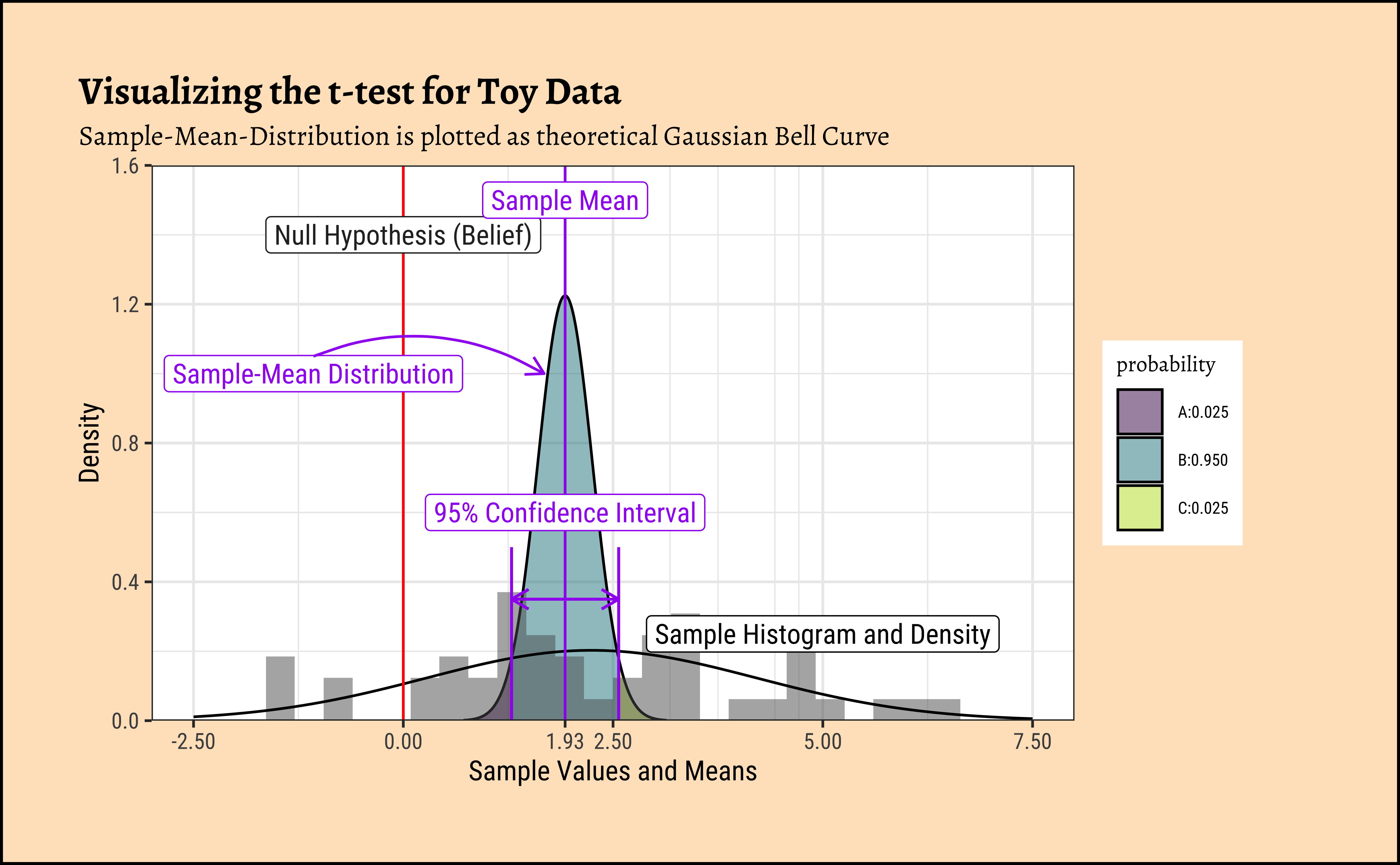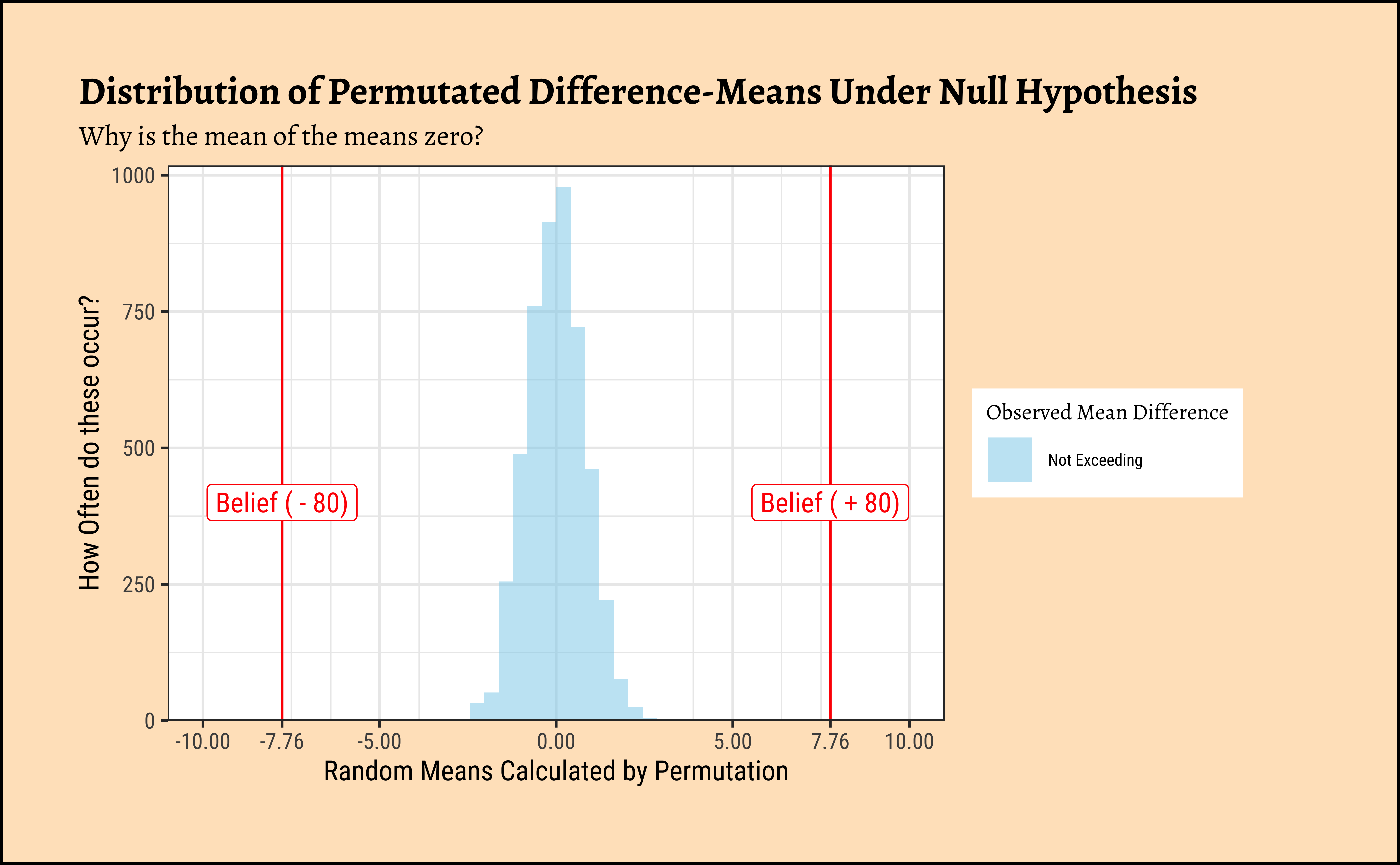 data sample / statisticshowing up like that, given our NULL belief. It is a distance measurement of sorts, literally embodying the idea of far-fetched-ness!!If the chances of the sample are too low, then that might alter our belief. This is the attitude that lies at the heart of Null Hypothesis Significance Testing (NHST).