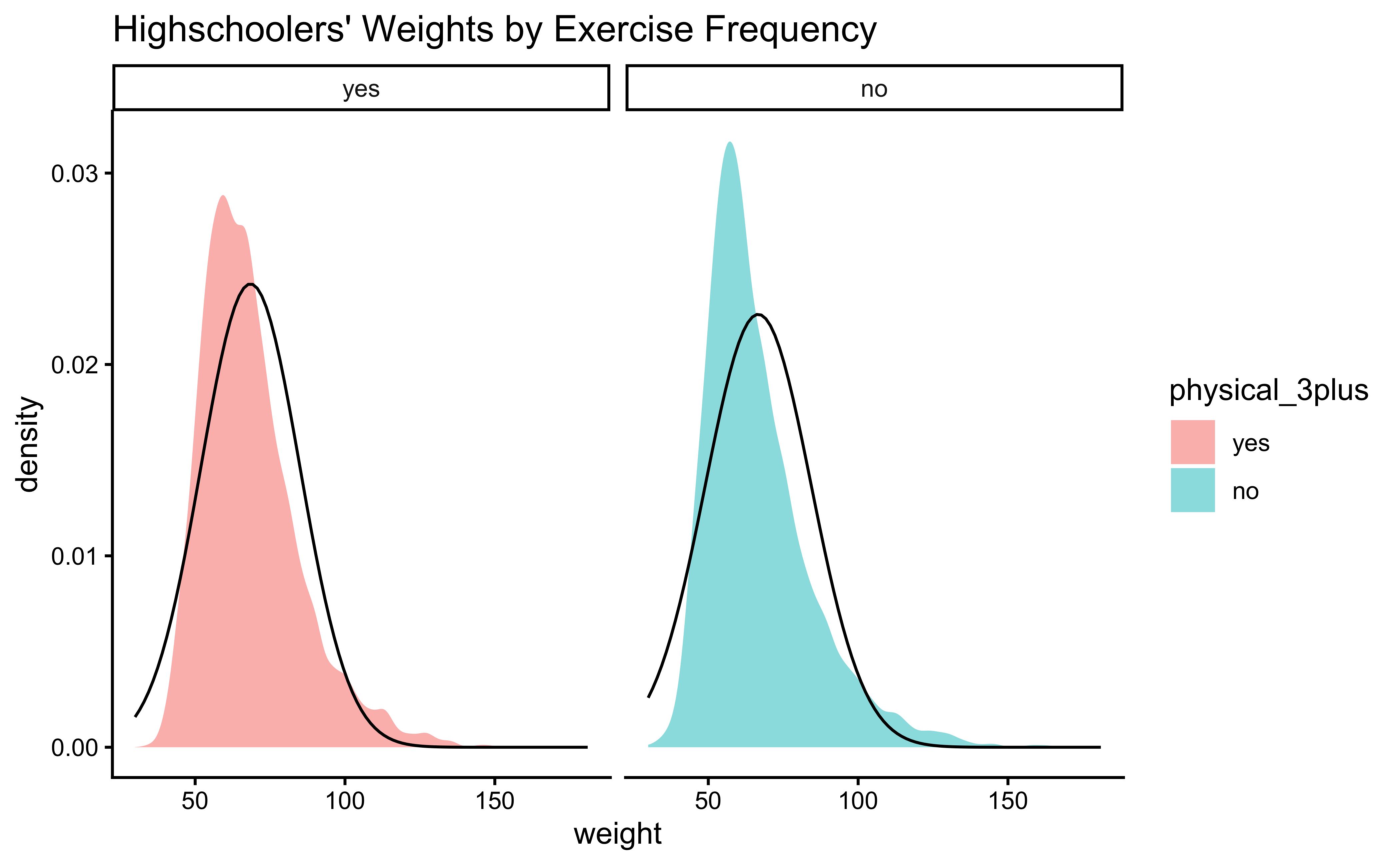yrbss_select_phy %>% count(physical_3plus)Does weight vary based on whether students exercise on more or less than 3 days a week? (physically_active_7d >= 3 days)