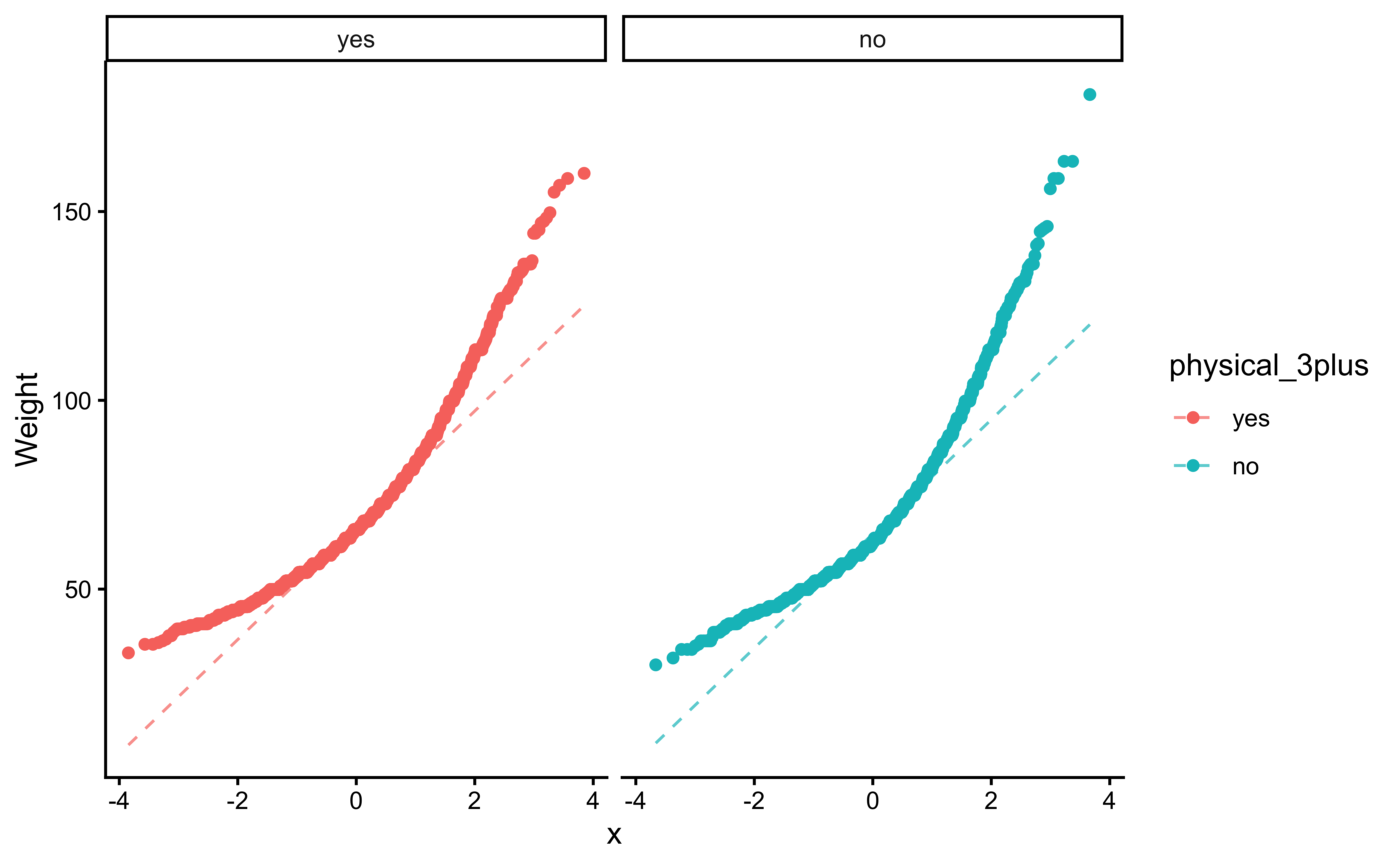 gf_qq(~ weight | physical_3plus, color = ~physical_3plus) %>%