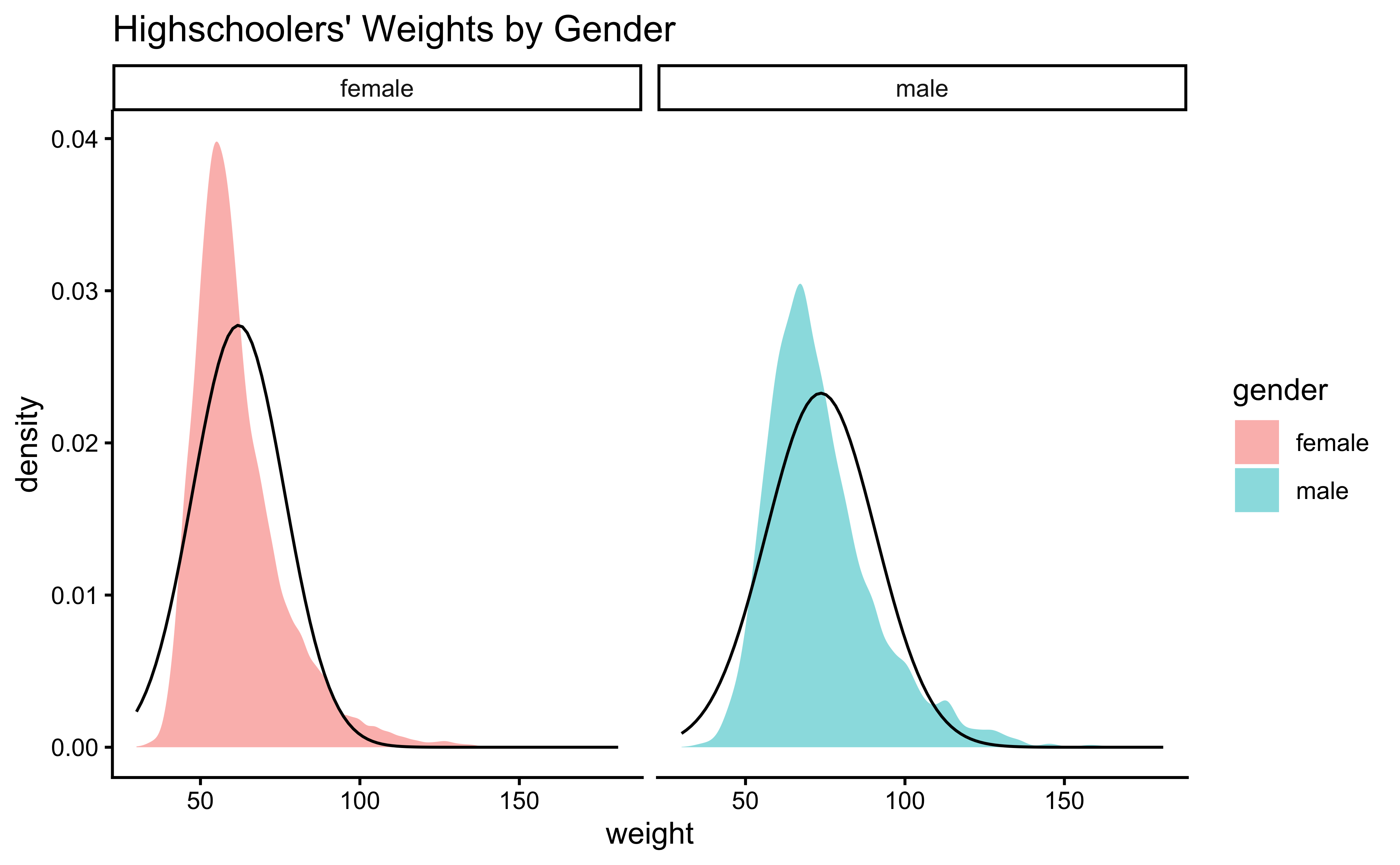 gf_theme(theme_classic())Distributions are not too close to normal…perhaps a hint of a rightward skew, suggesting that there are some obese students.