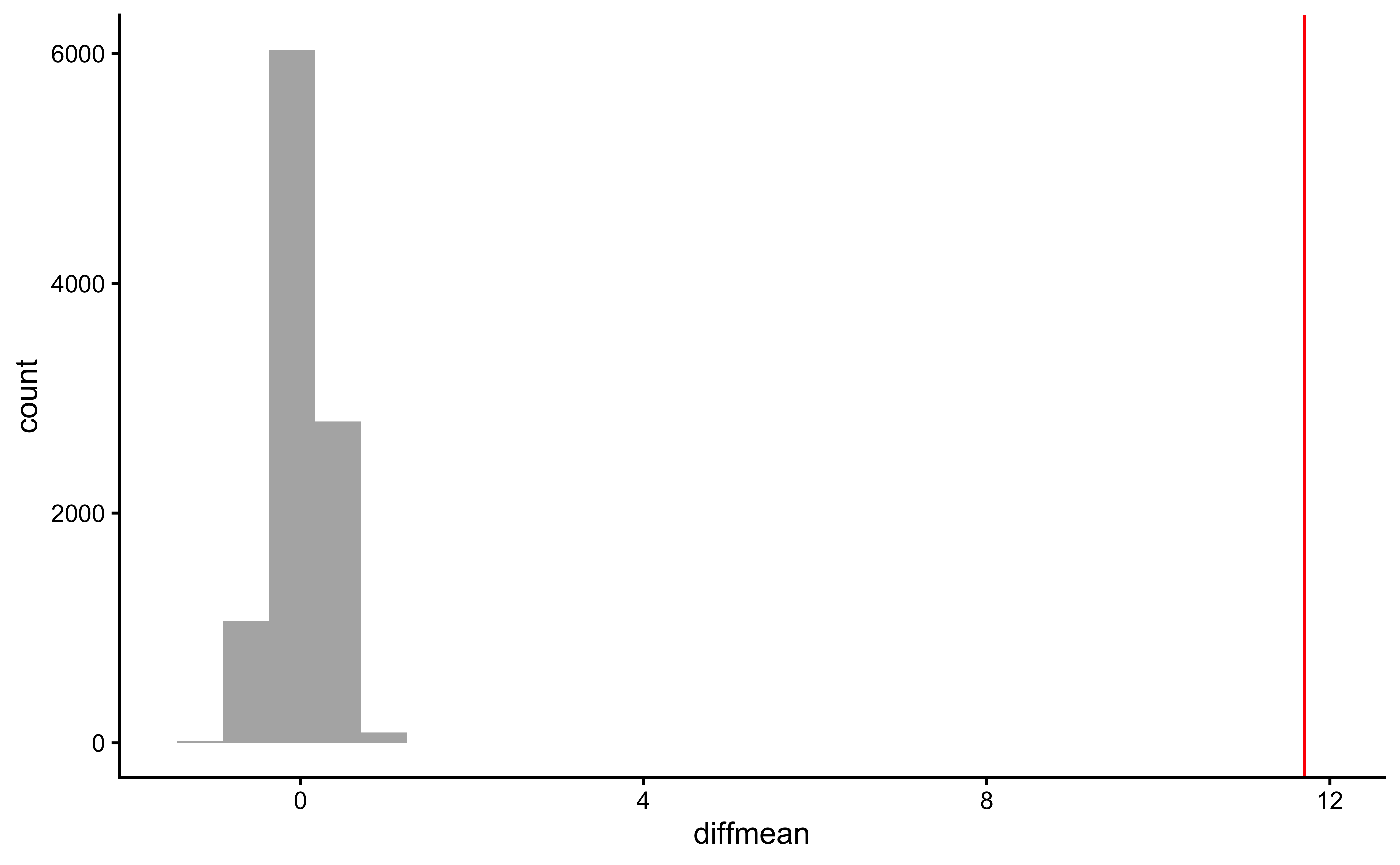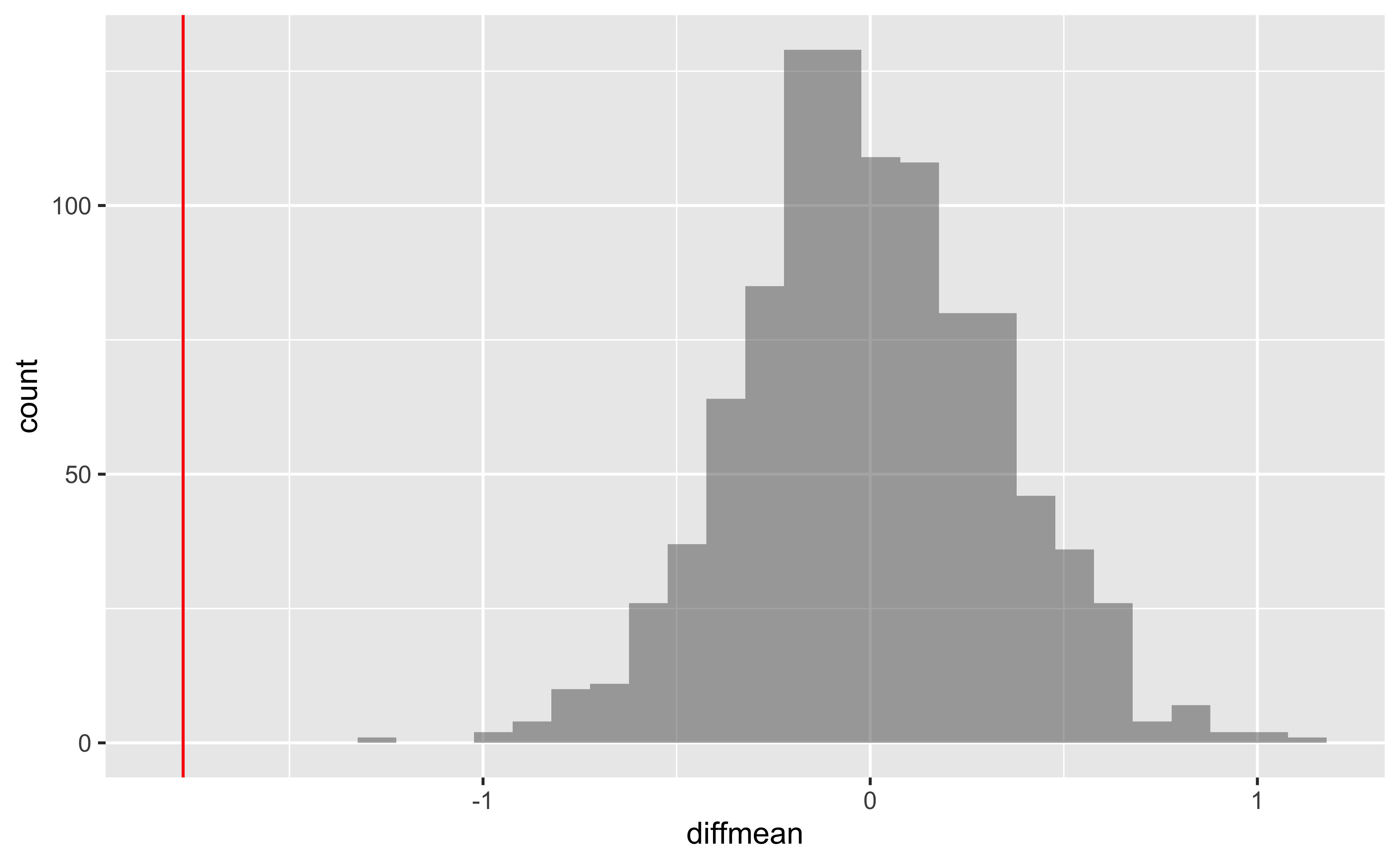 What would be the test statistic we would use? The difference in means. Is the observed difference in the means between the two groups of scores non-zero? We use the diffmean function, from mosaic: