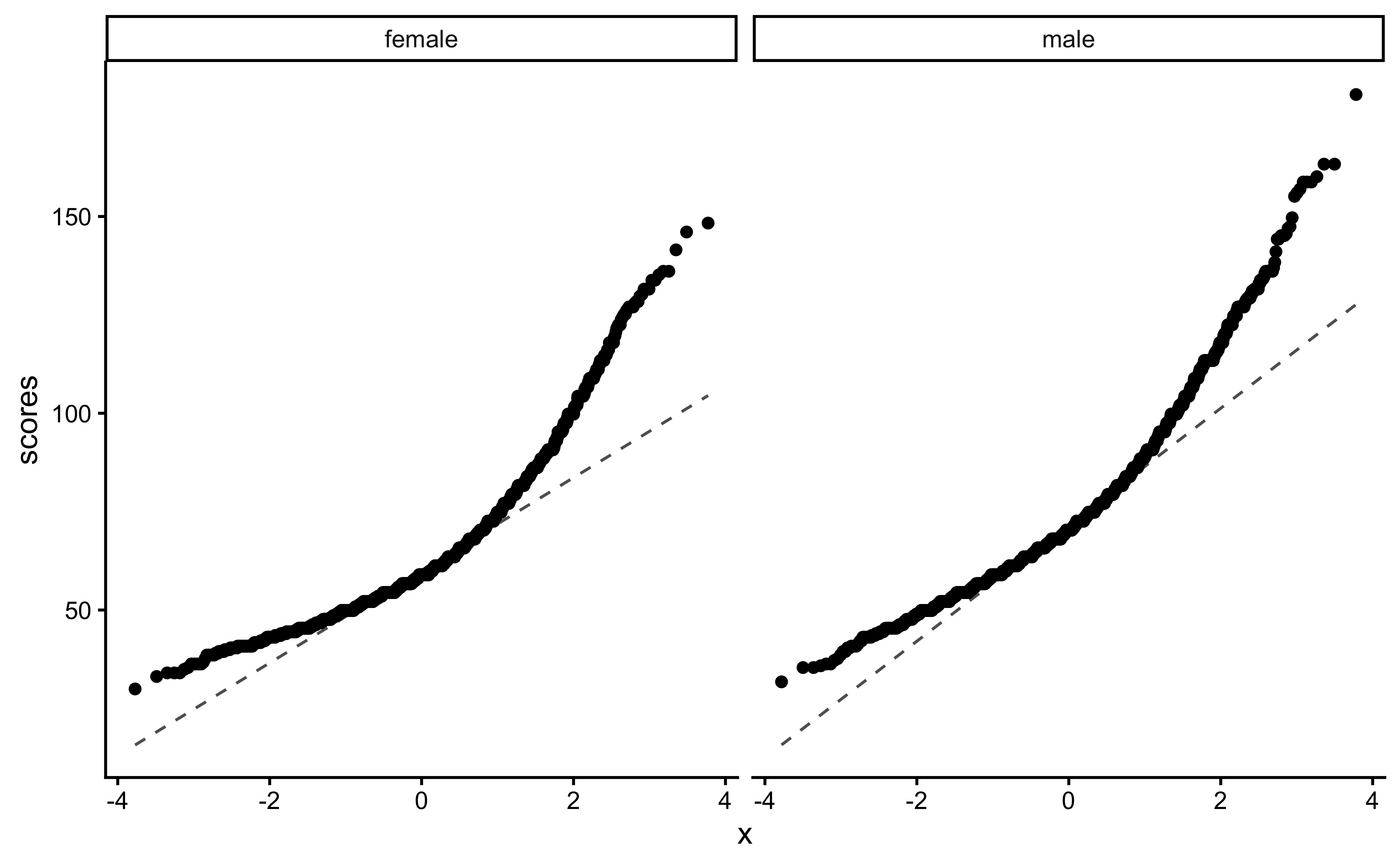 gf_theme(theme_classic())The QQ-plots confirm that he tow data variables are not normally distributed.
