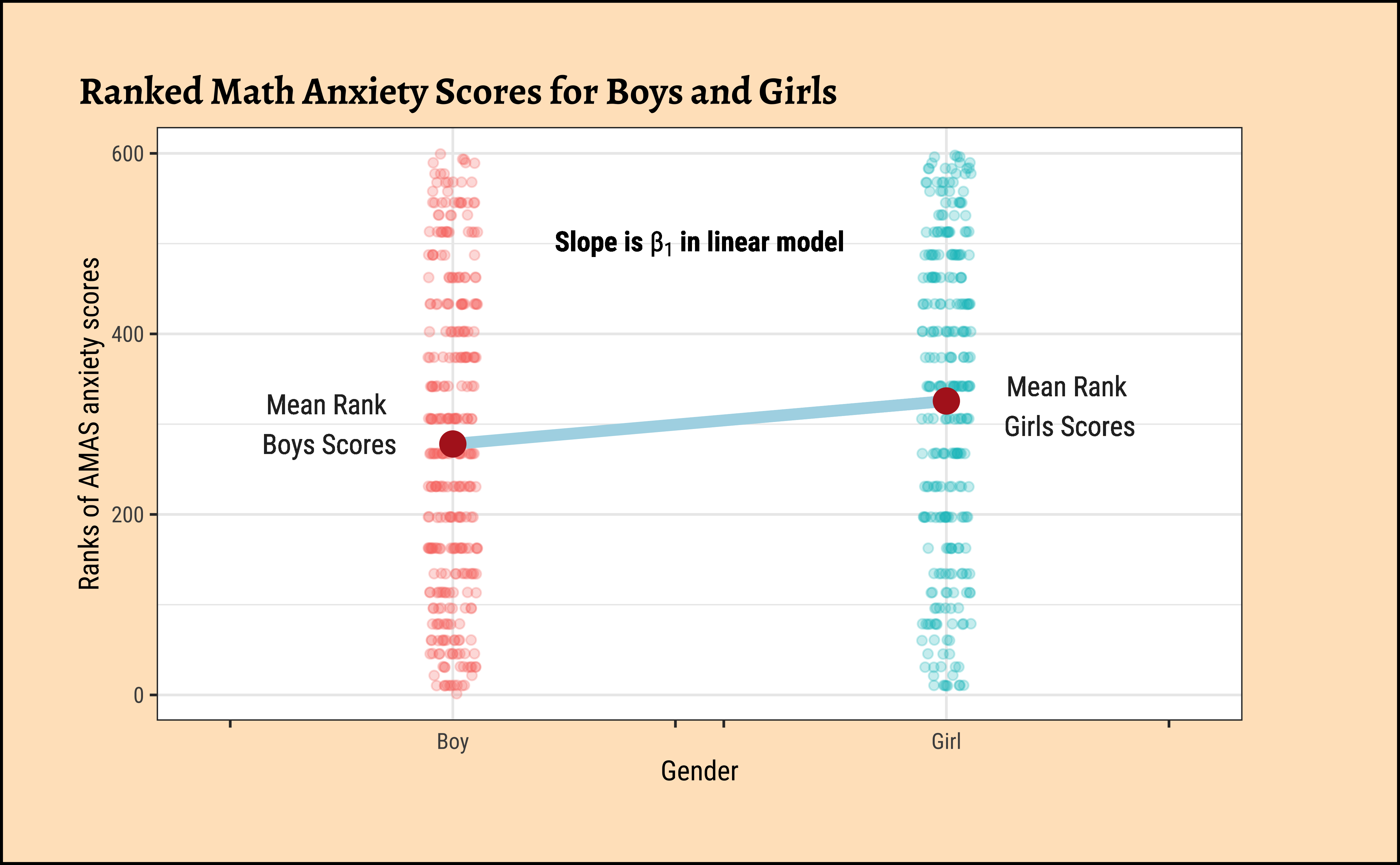 Here too, the linear model using rank data arrives at a conclusion similar to that of the Mann-Whitney U test.
