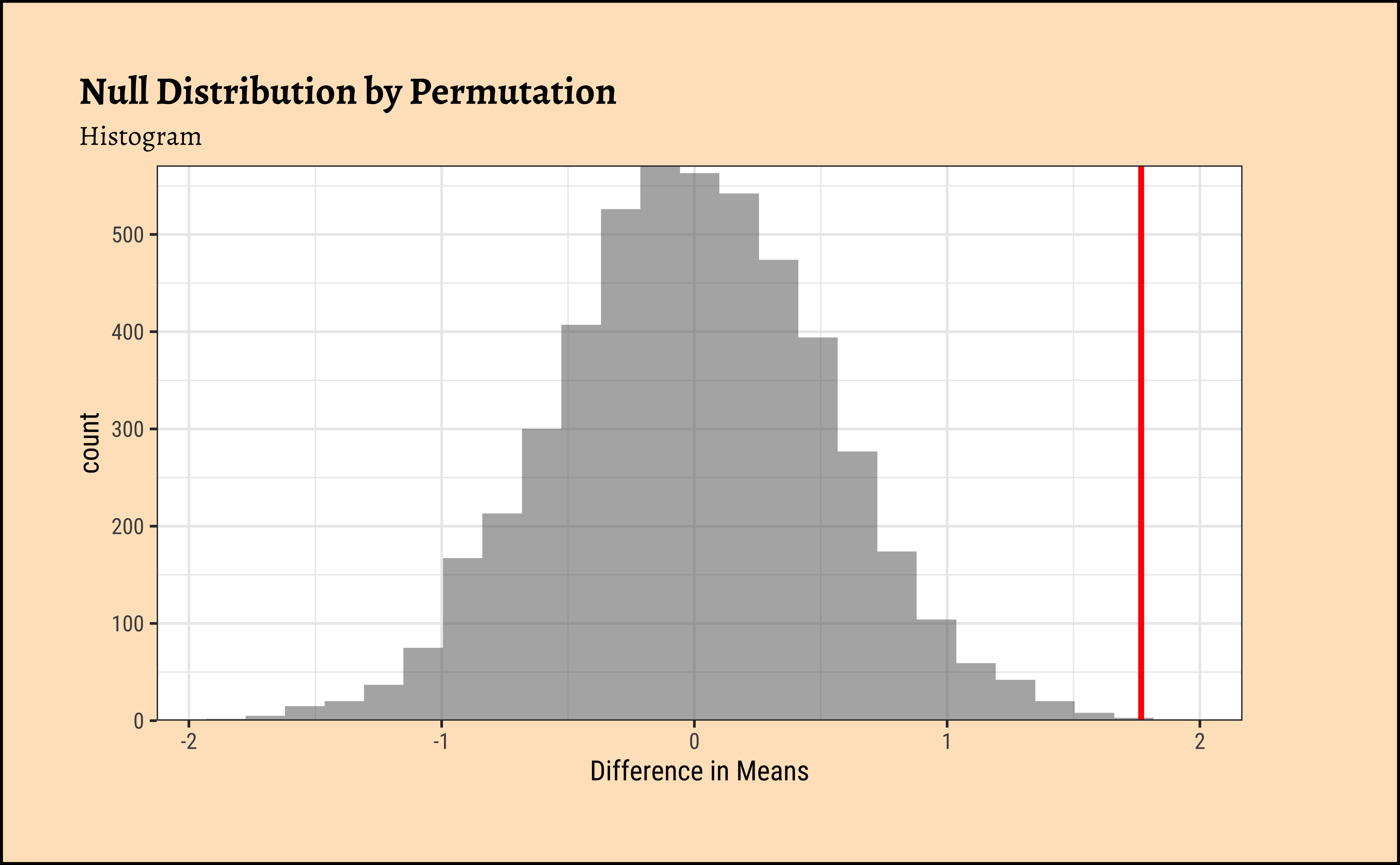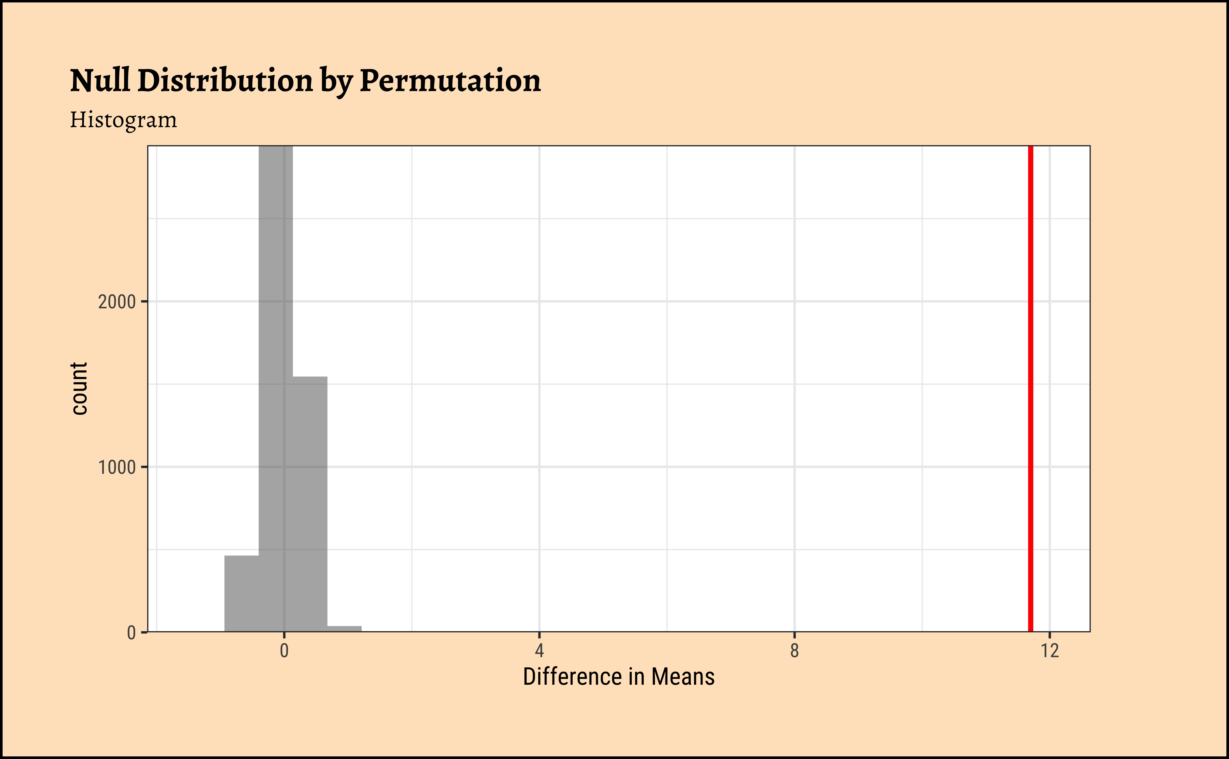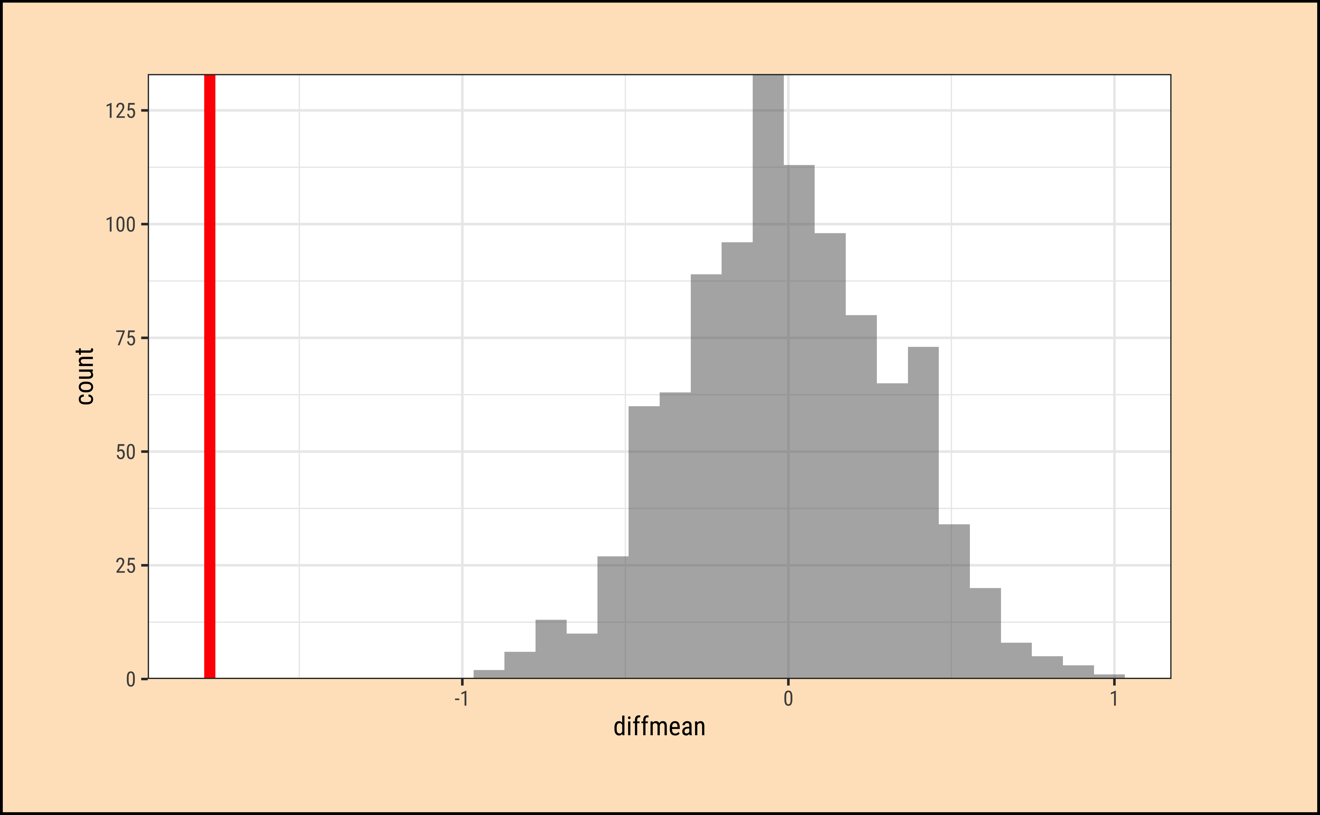 We should also note that the type argument within generate() is set to "permute". This ensures that the statistics calculated by the calculate() function come from a reshuffling of the data (not a resampling of the data)! Finally, the specify() and calculate() steps should look familiar, since they are the same as what we used to find the observed difference in means!