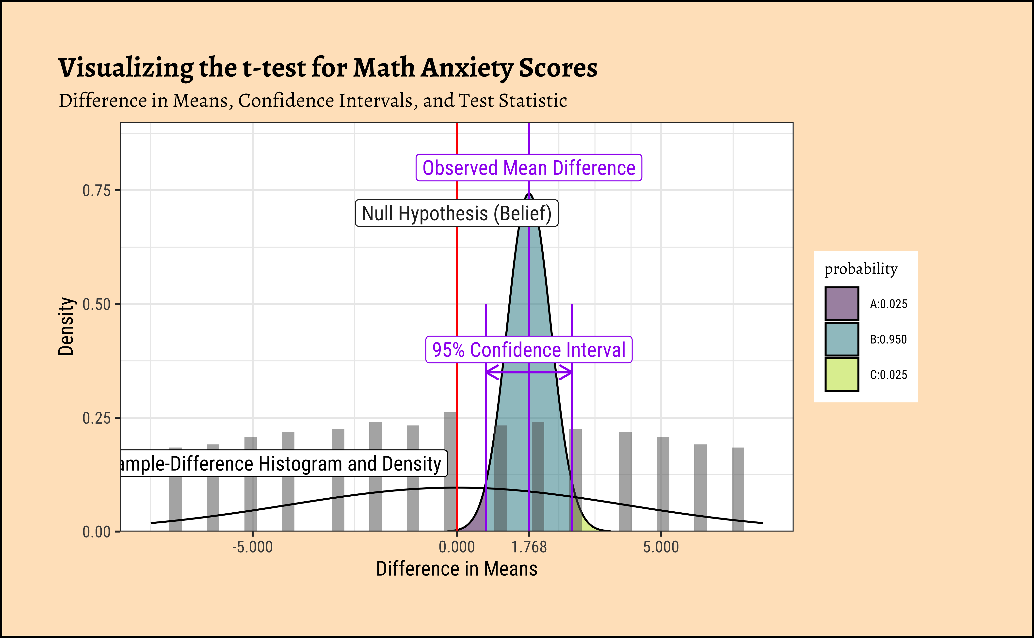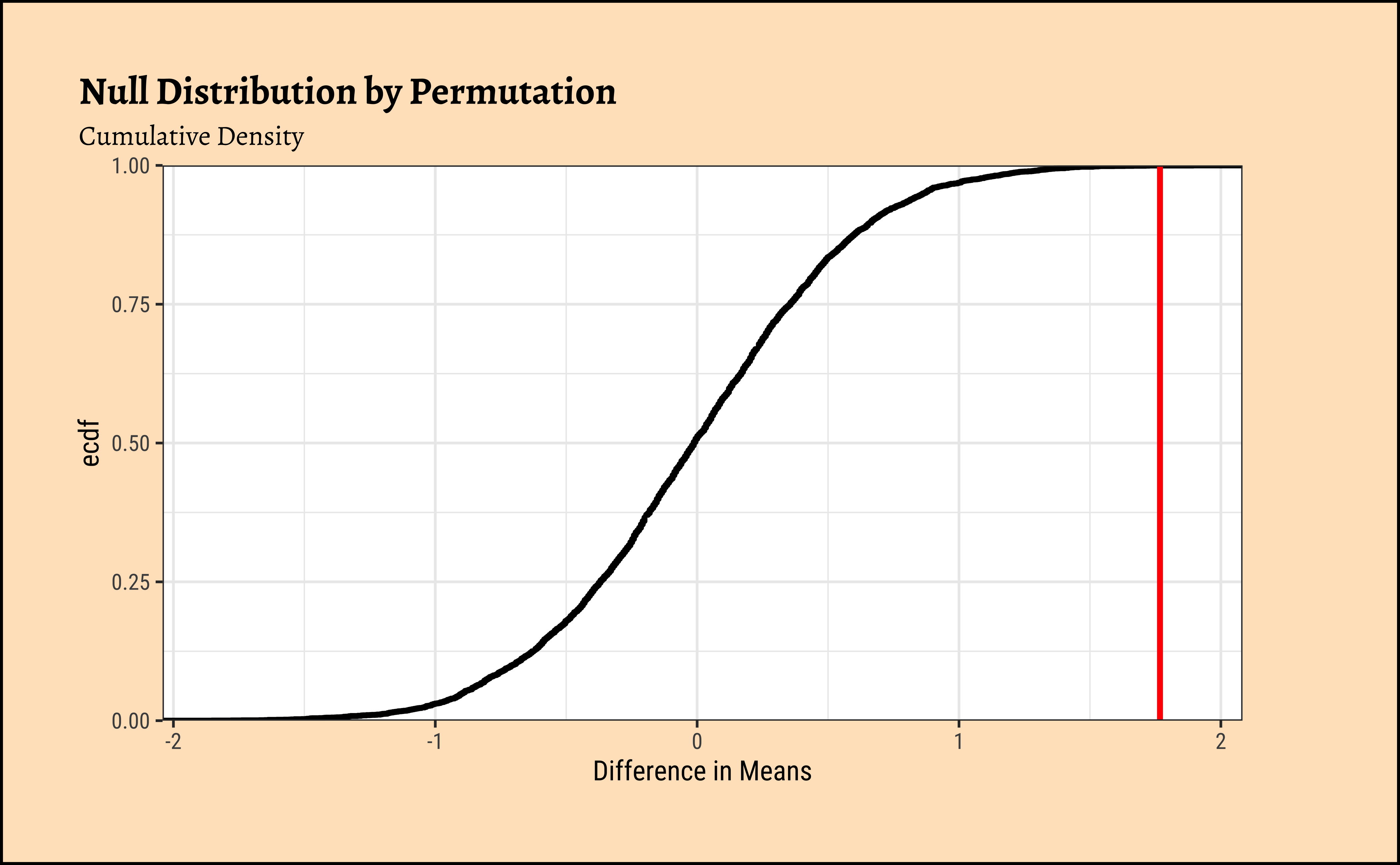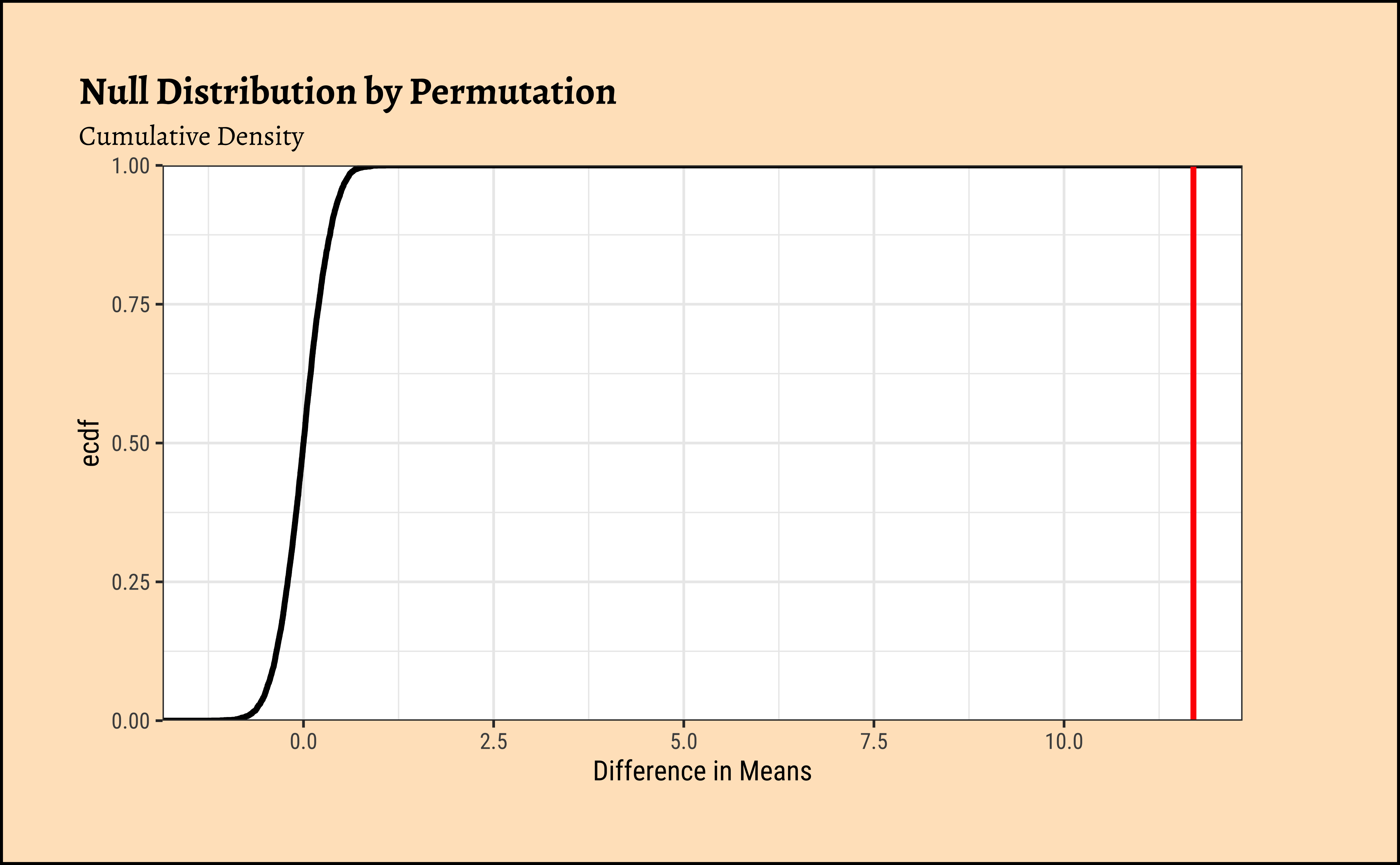 We can also generate the histogram of the null distribution, compare that with the observed diffrence and compute the p-value and confidence intervals: