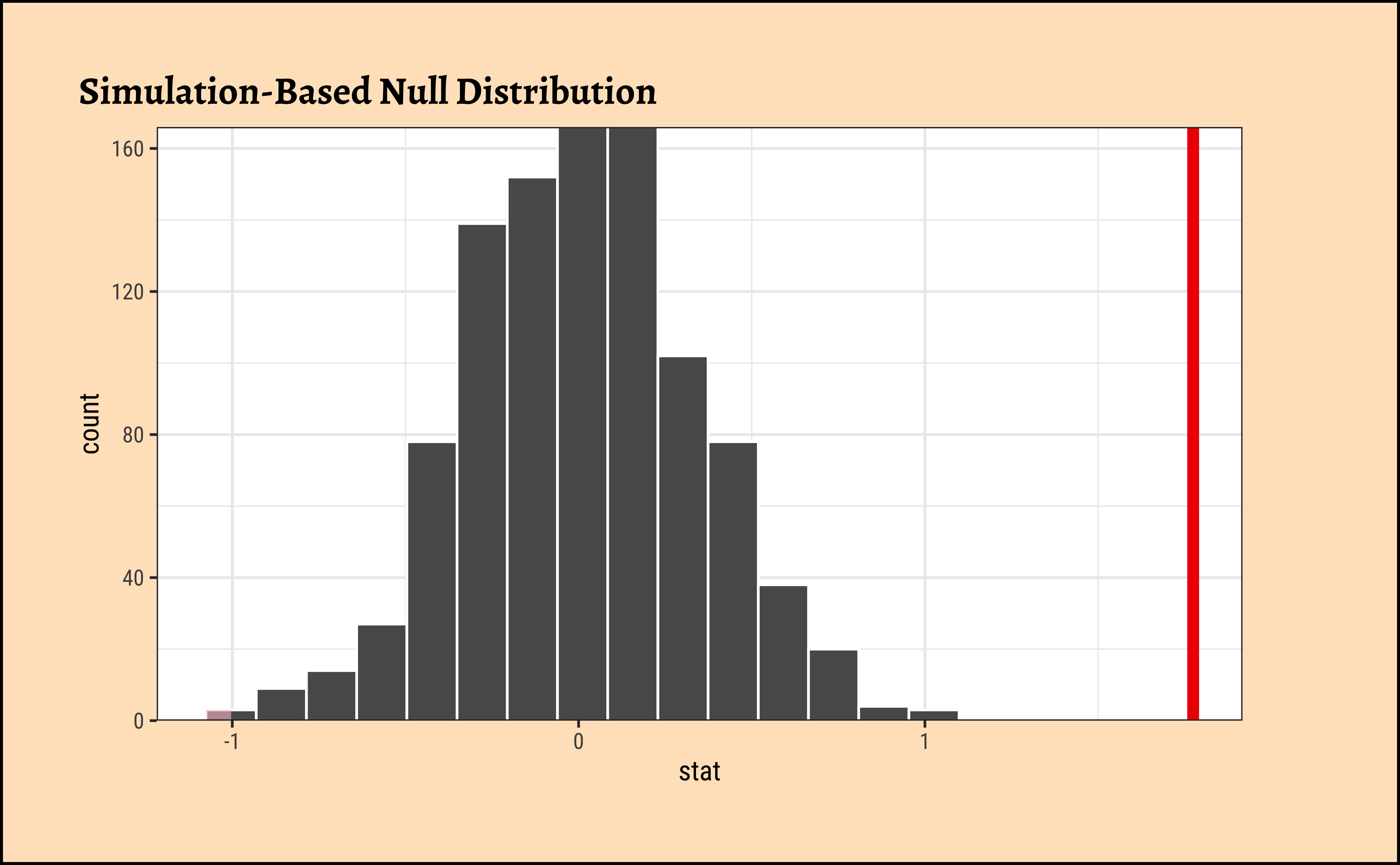 scale_y_continuous(expand = c(0, 0))Now that you have calculated the observed statistic and generated a permutation distribution, you can calculate the p-value for your hypothesis test using the function get_p_value() from the infer package.