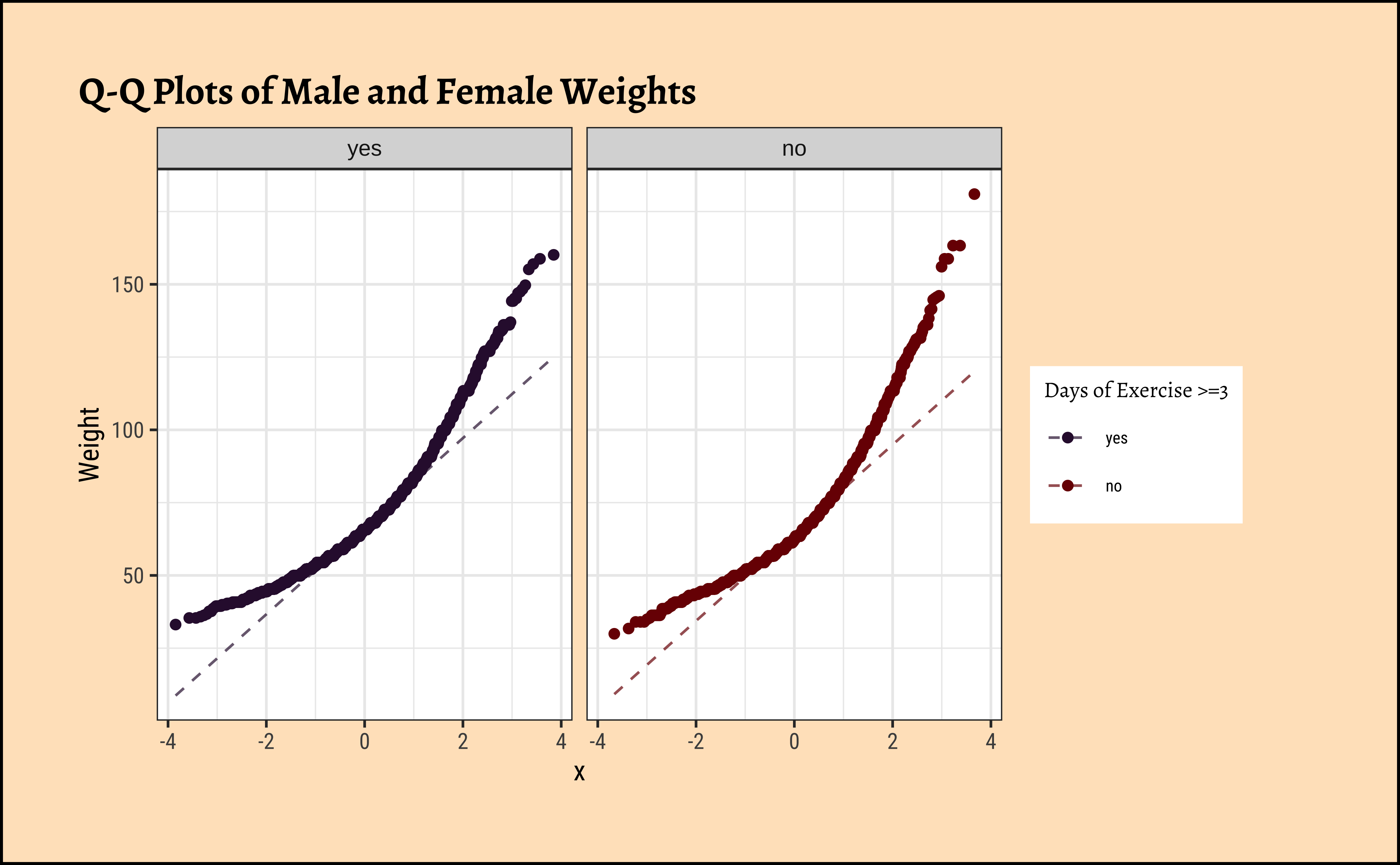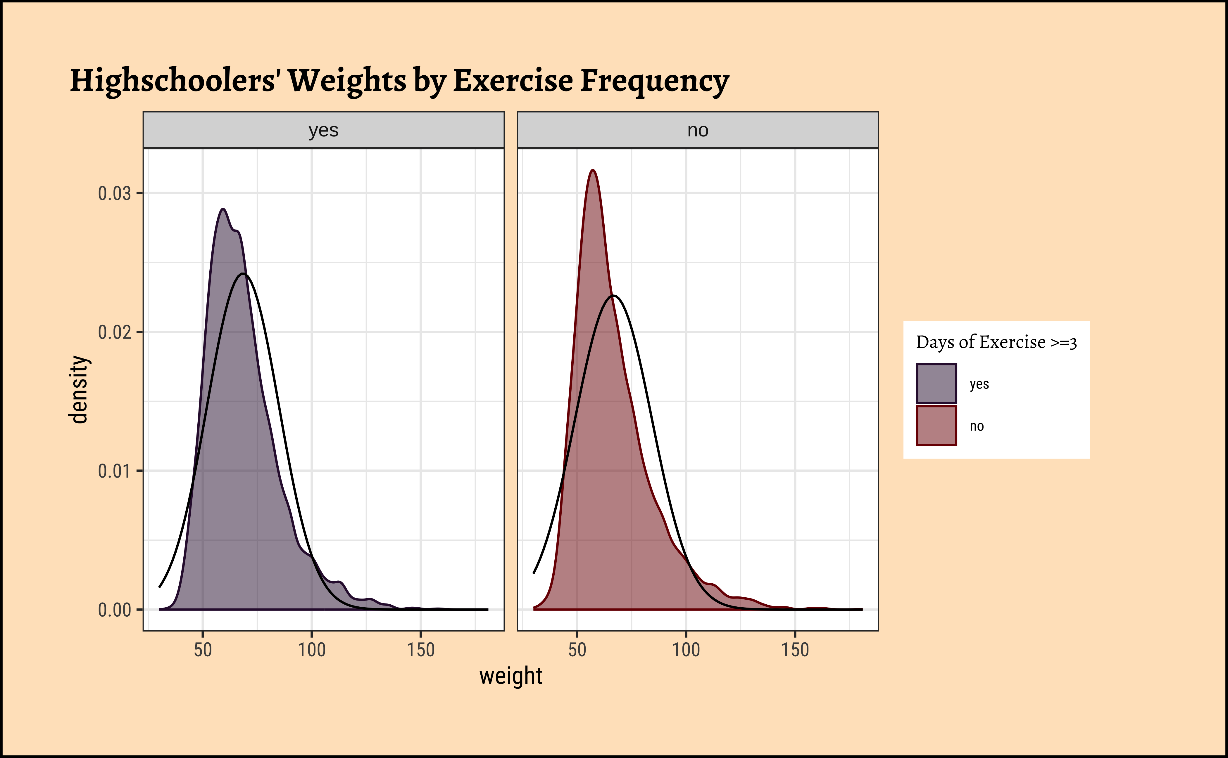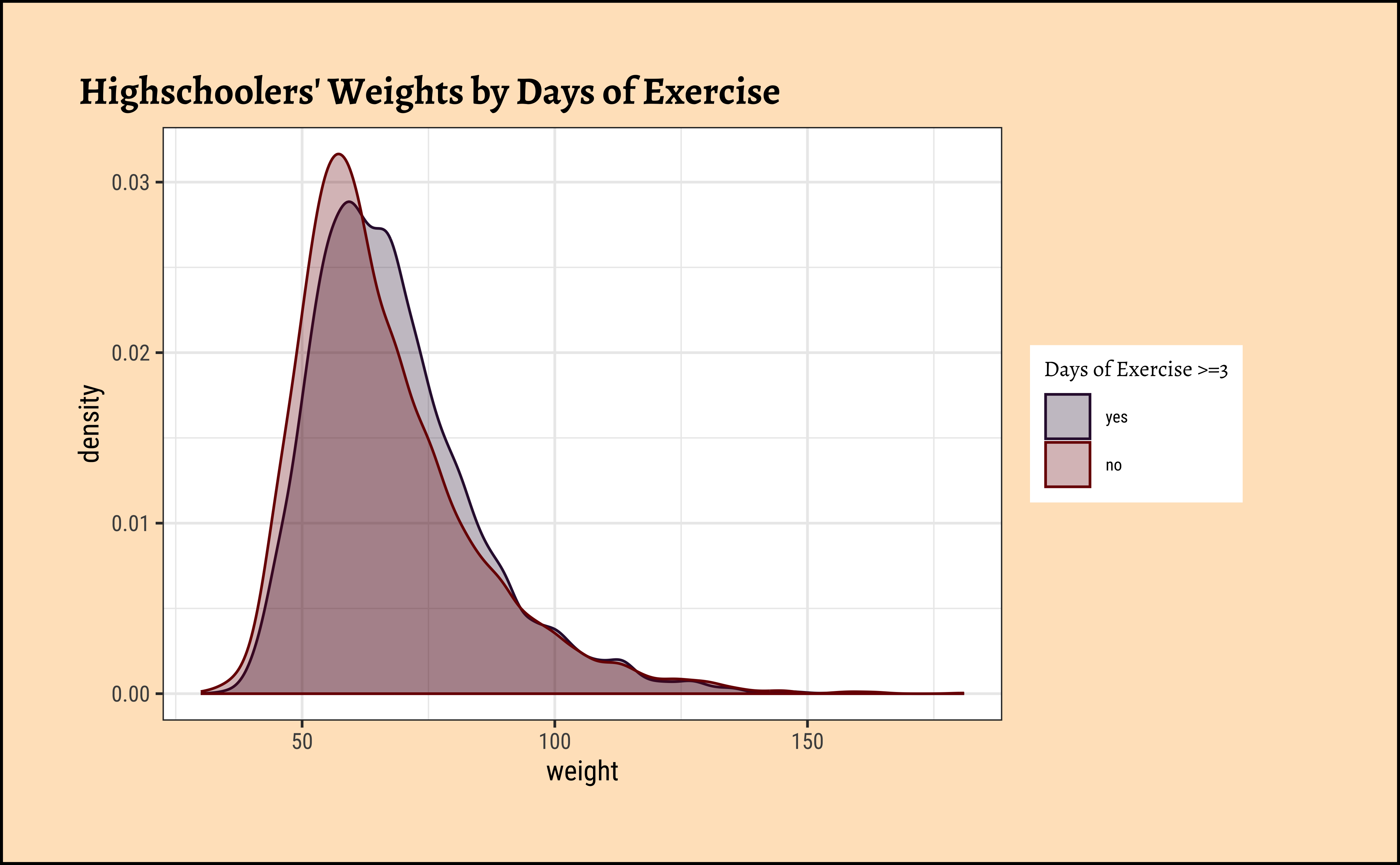 )What warning message do you get? Why do you think you get this warning message? Let us construct and record a confidence interval for the difference between the weights of those who exercise at least three times a week and those who don’t, and interpret this interval in context of the data.