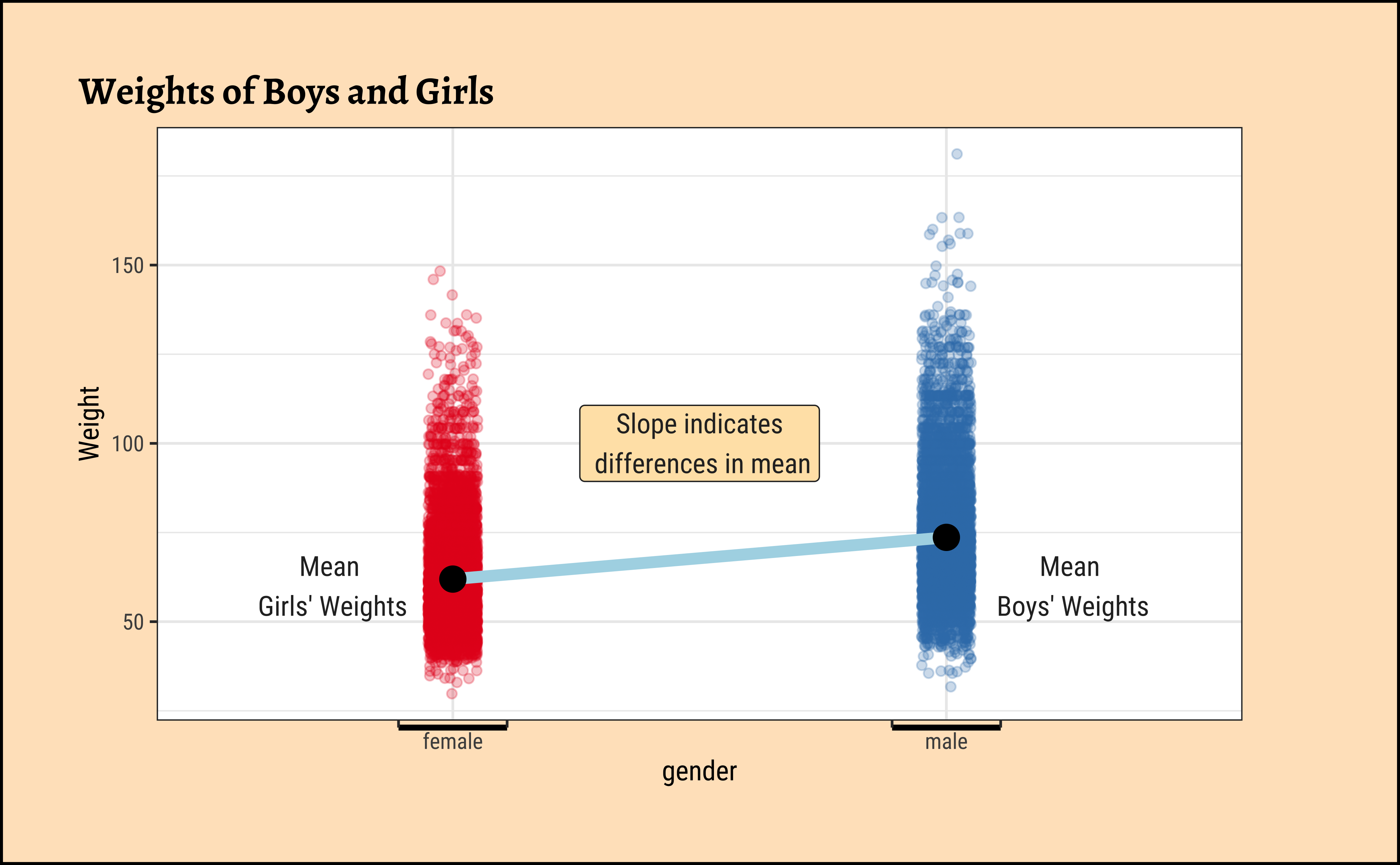 Based on the graphs, how would we formulate our Hypothesis? We wish to infer whether there is difference in mean weight across physical_3plus. So accordingly: