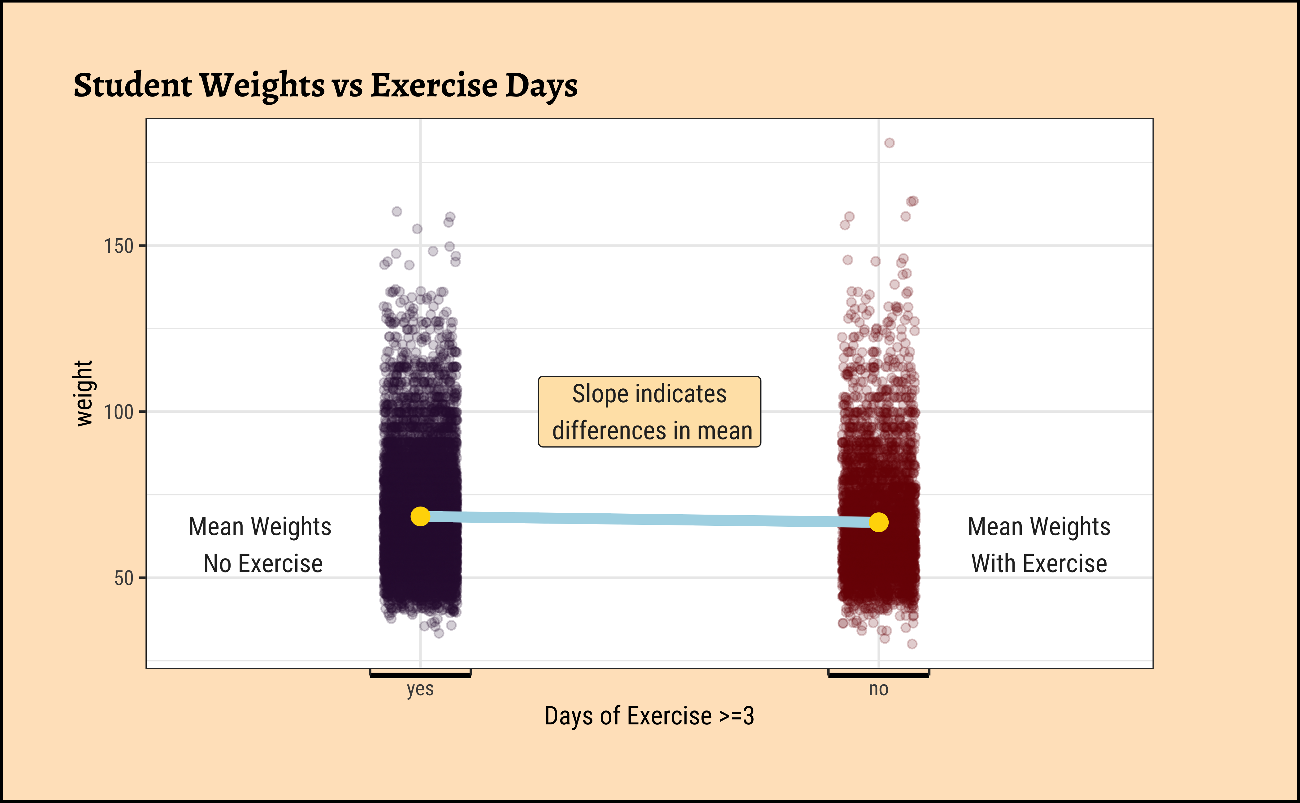 The hypothesize() function is used to declare what the null hypothesis is. Here, we are assuming that student’s weight is independent of whether they exercise at least 3 days or not.