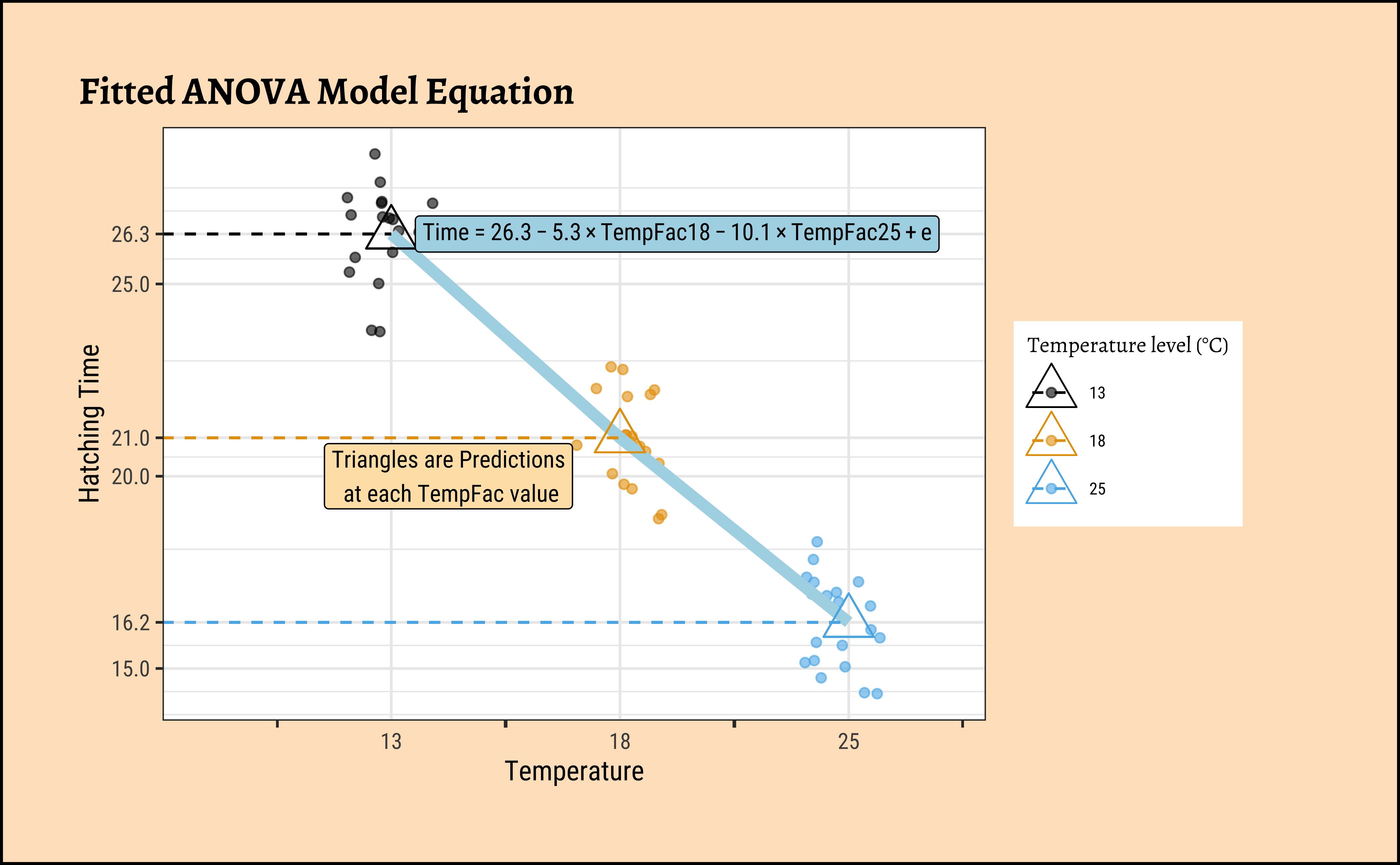 Given the context and ANOVA results here, we’d primarily focus on the Temperature (TempFac levels) effect, not the individual intercept or coefficients of the TempFac categories themselves as our primary object of study is their collective overall influence relative to randomness. - The practical interpretation would be that any 2-level average comparison between our treatment conditions, as determined by the specific model parameters and the nature of factorization here applied toward ANOVA analysis. For a simple way of framing your result consider whether some combination of those two categories produces an increase or decrease in observed spawn times when comparing at higher temperatures than our baseline (for example).