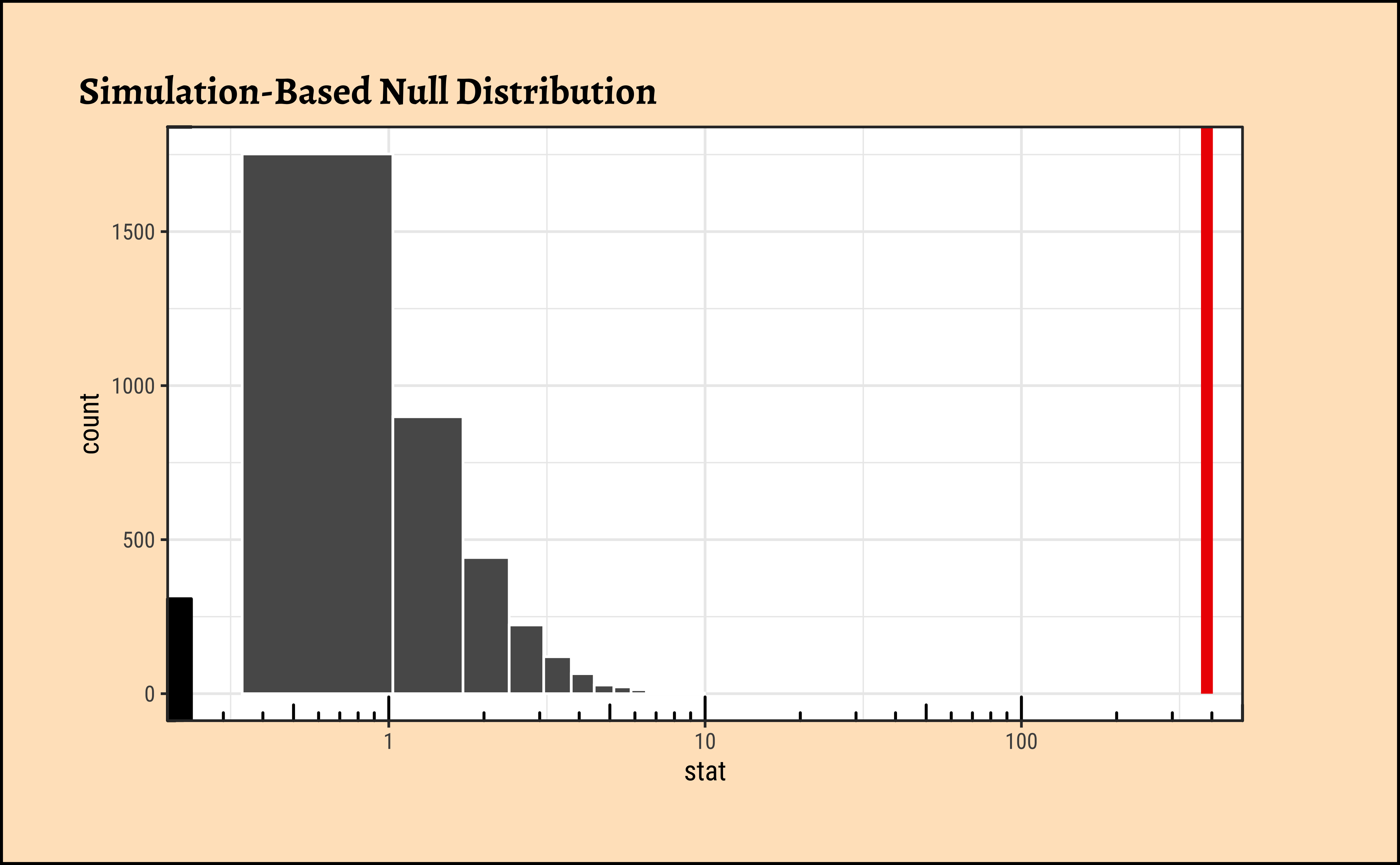 theme_custom()As seen, the infer based permutation test also shows that the permutationally generated F-statistics are nowhere near that which was observed. The effect of TempFac is very strong.