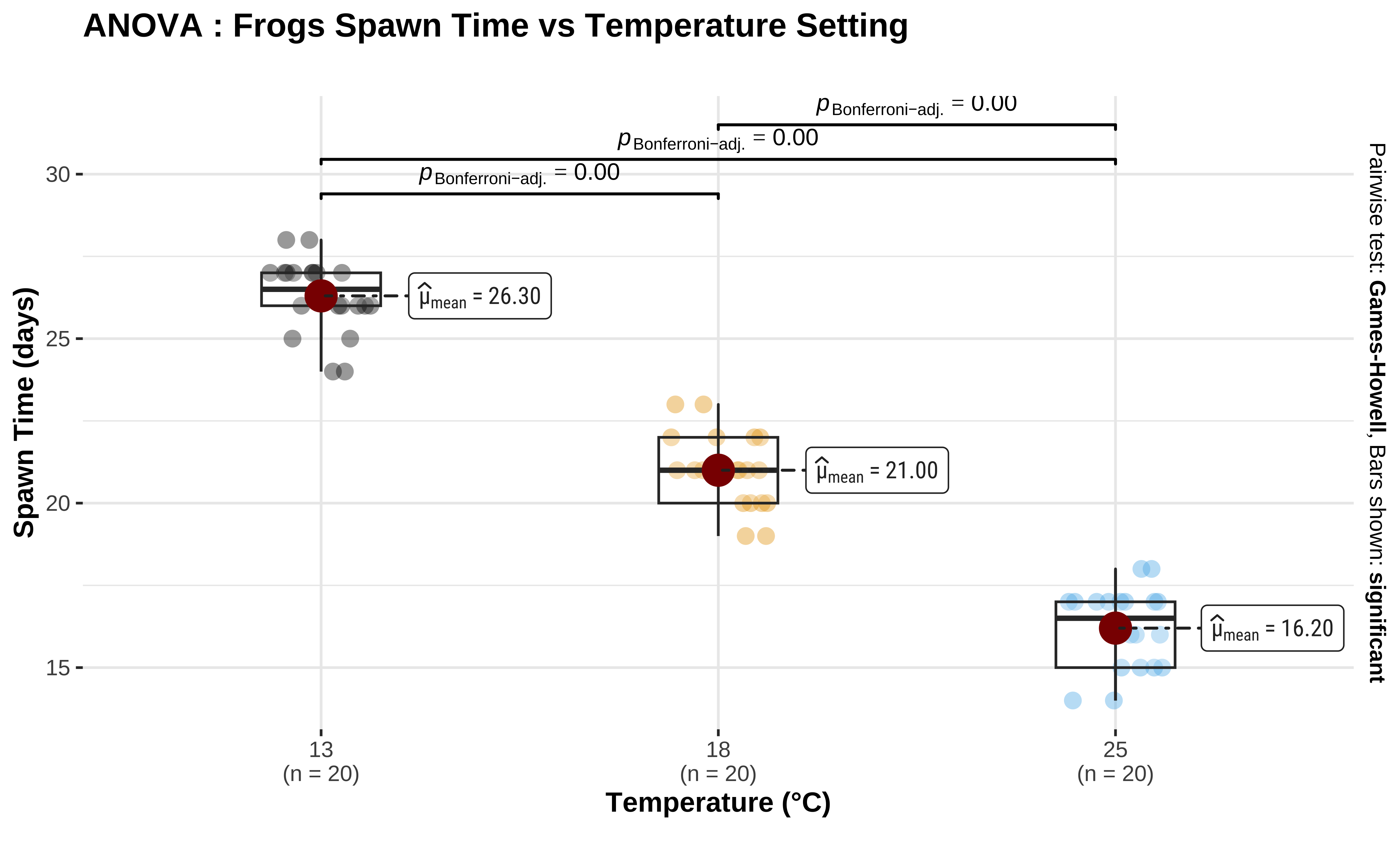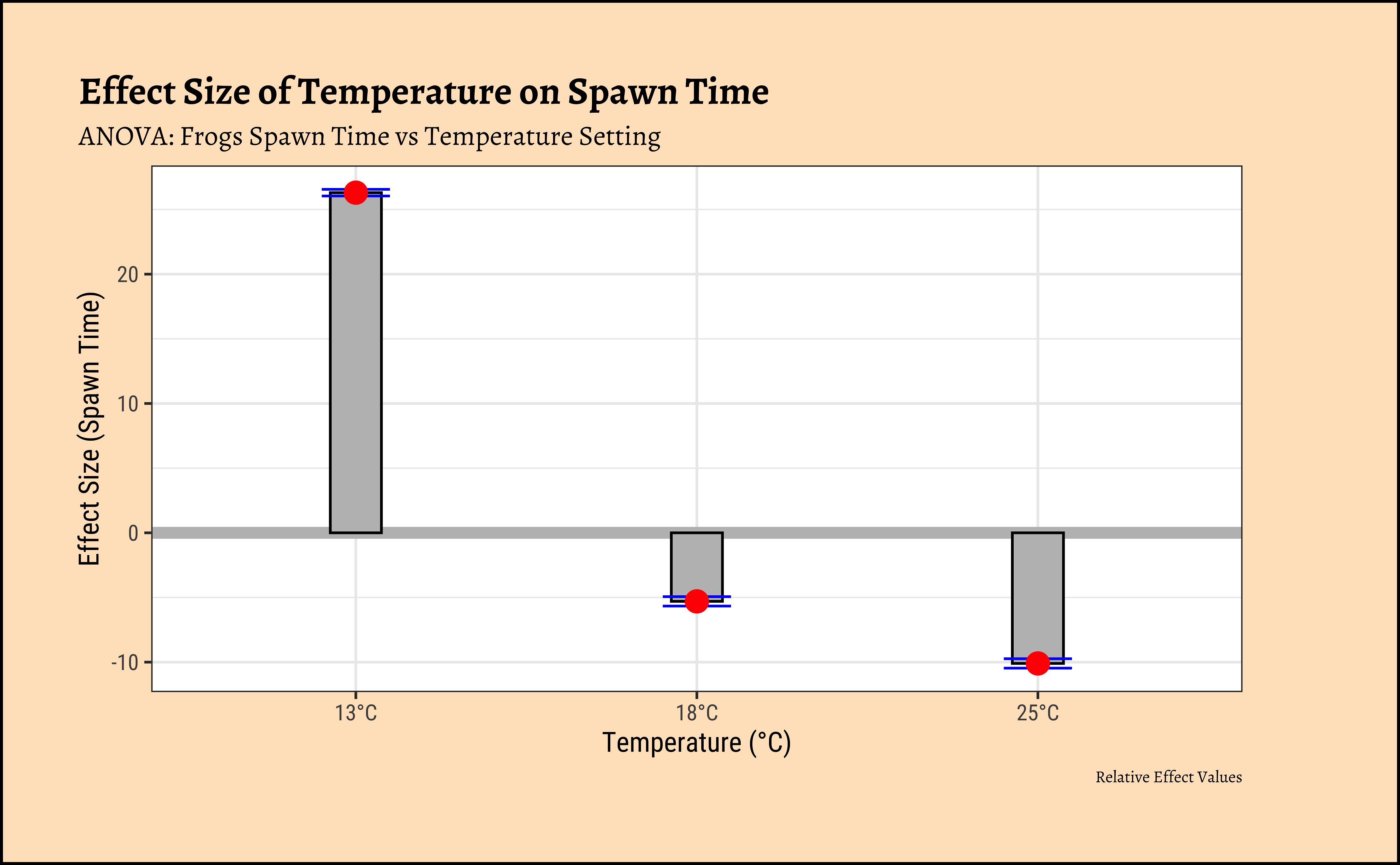 title = "ANOVA : Frogs Spawn Time vs Temperature Setting",