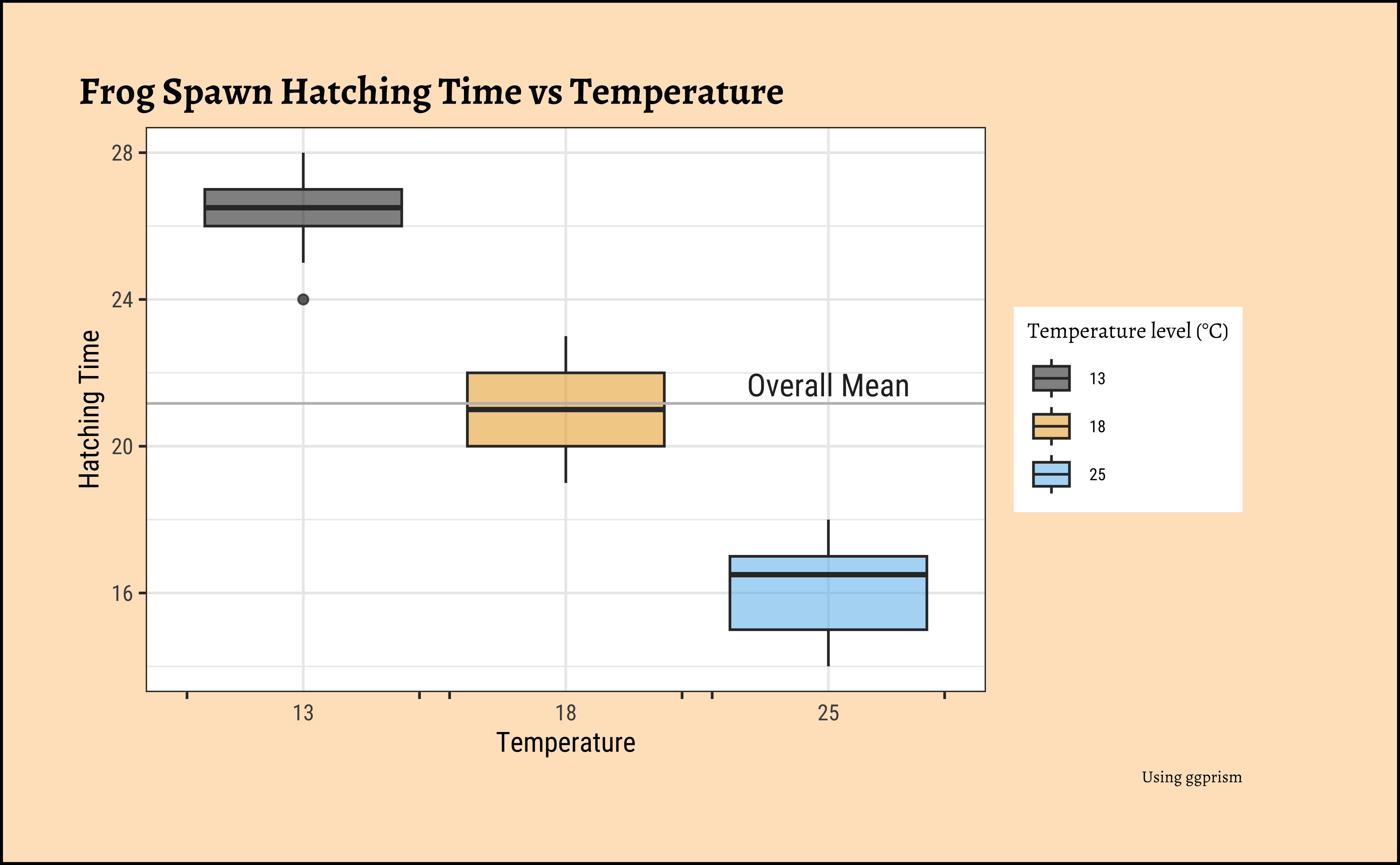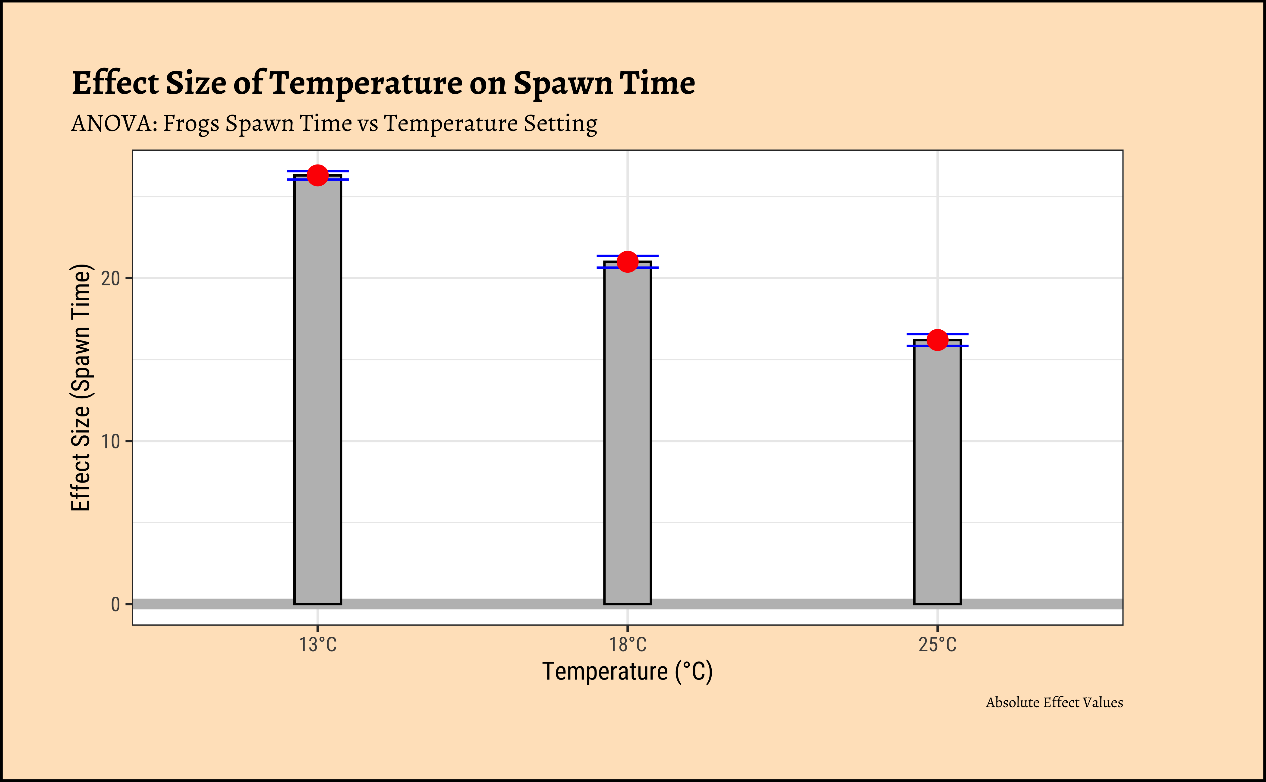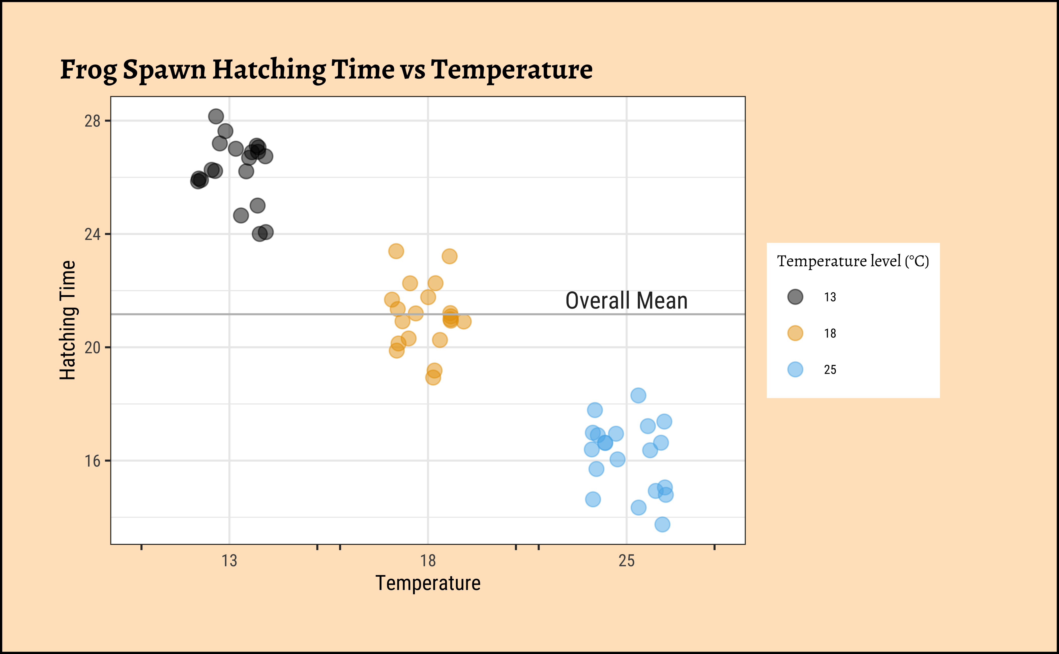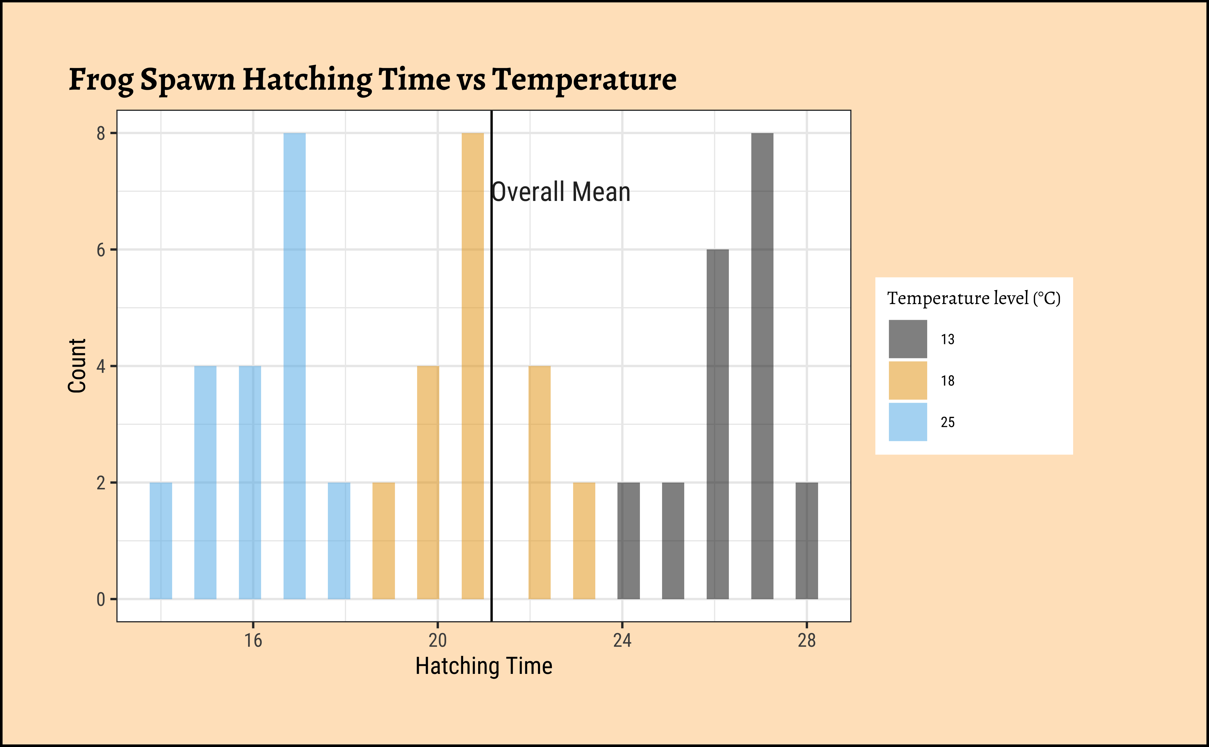 exam_context <- "This model uses ANOVA to analyze the effect of temperature on frog spawn time. The model is based on a dataset where frog spawn were observed at three different temperatures (13°C, 18°C, and 25°C) to see how long it took for them to spawn. There were 20 samples of spawn at each temperature. The data was in wide form and pivotted to long form, and the Temperature variable was converted to a 3-level factor. The goal is to determine if the temperature-factor has a significant impact on the time it takes for frogs to spawn."