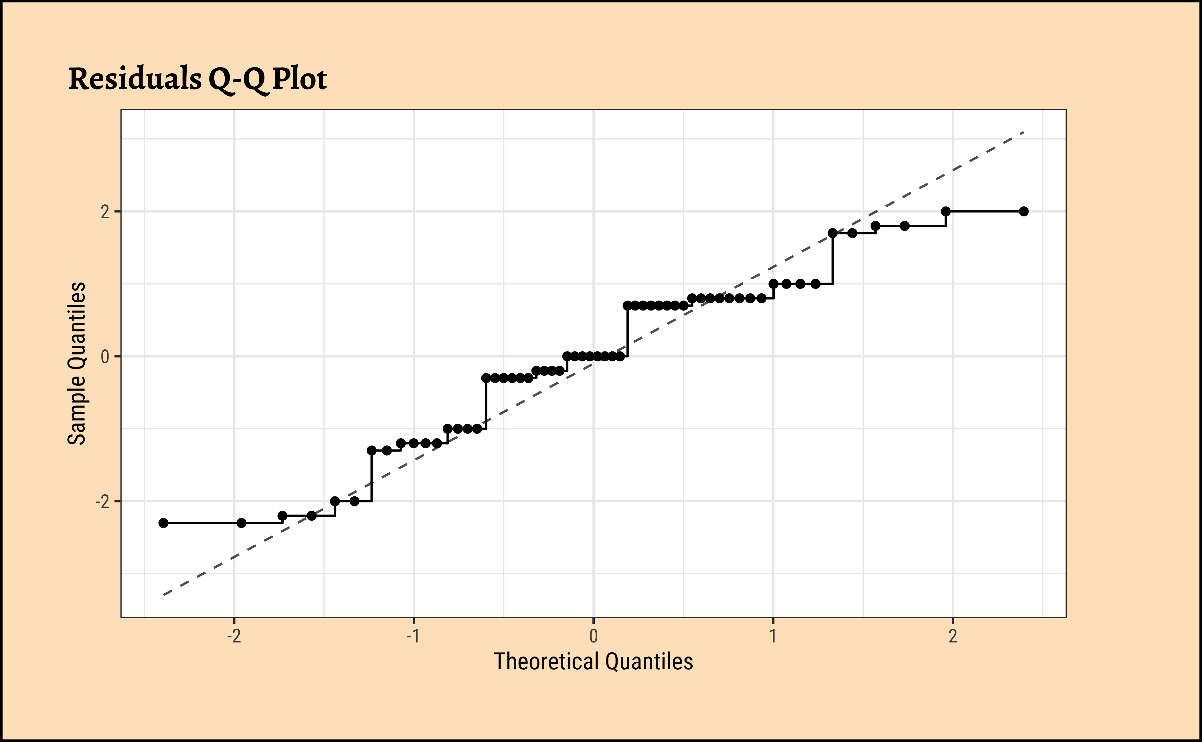 Given the complexity and specificity to research goals, consulting with your dataset on assumptions via graphical explorations is prudent. Here are brief suggestions tailored to our specific model: 1. Plot residuals against fitted values or a normal Q-Q plot. 2. For linearity: Observe whether scatter around each predicted spawn time level is fairly random for each temperature category in the residuals vs fitted-values plot. 3. For homoscedasticity (Constant Deviation): Assess if variability at any one temperature’s range of times are roughly consistent with those from other temperatures’ ranges, also considering graphical displays. 4. Normality: Perform a Shapiro-Wilk test on these model residuals to quantify how far the data deviates from normality; it’s especially relevant given the small size & homogeneity across treatment conditions.