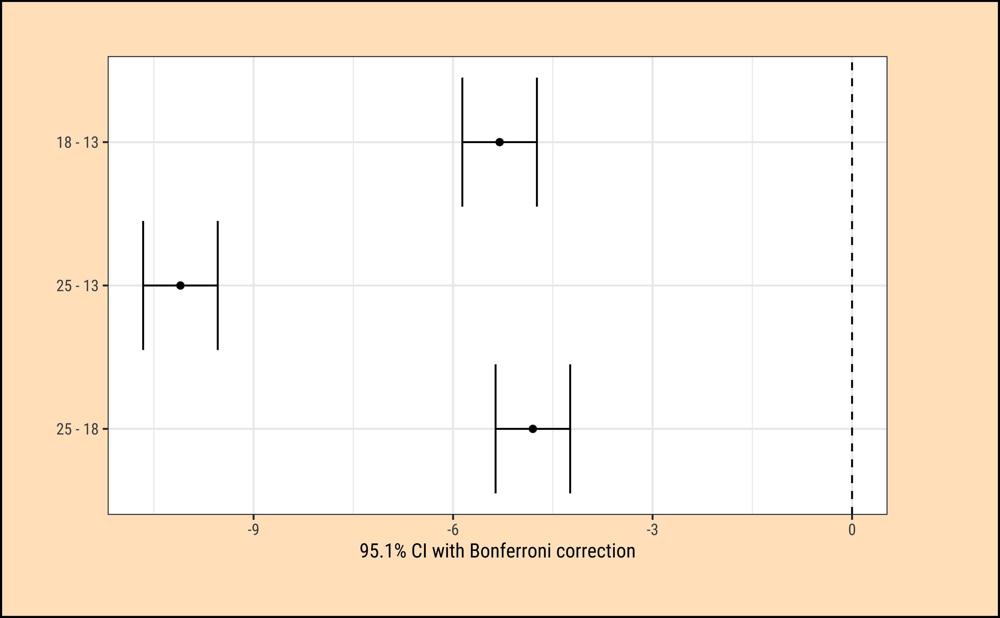 )This plot also shows the \(p.value = 0\) for each pairwise comparison, attesting to its significance.