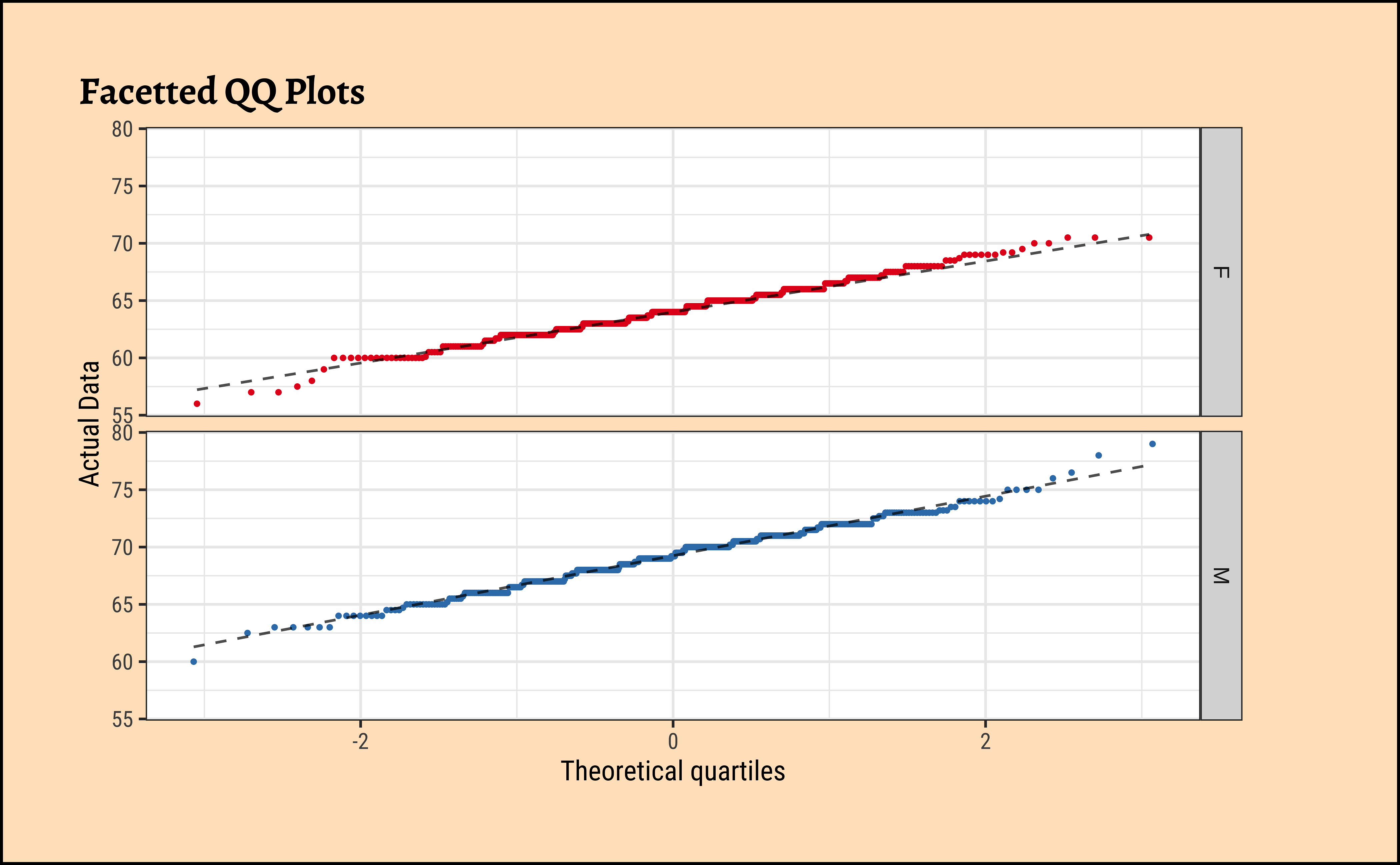 \[ \begin{aligned} height = \beta_0 + \beta_1 \times father\\ \\ H_0: Null\ Hypothesis\ => \beta_1 = 0\\\ H_a: Alternate\ Hypothesis\ => \beta_1 \ne 0\\ \end{aligned} \]