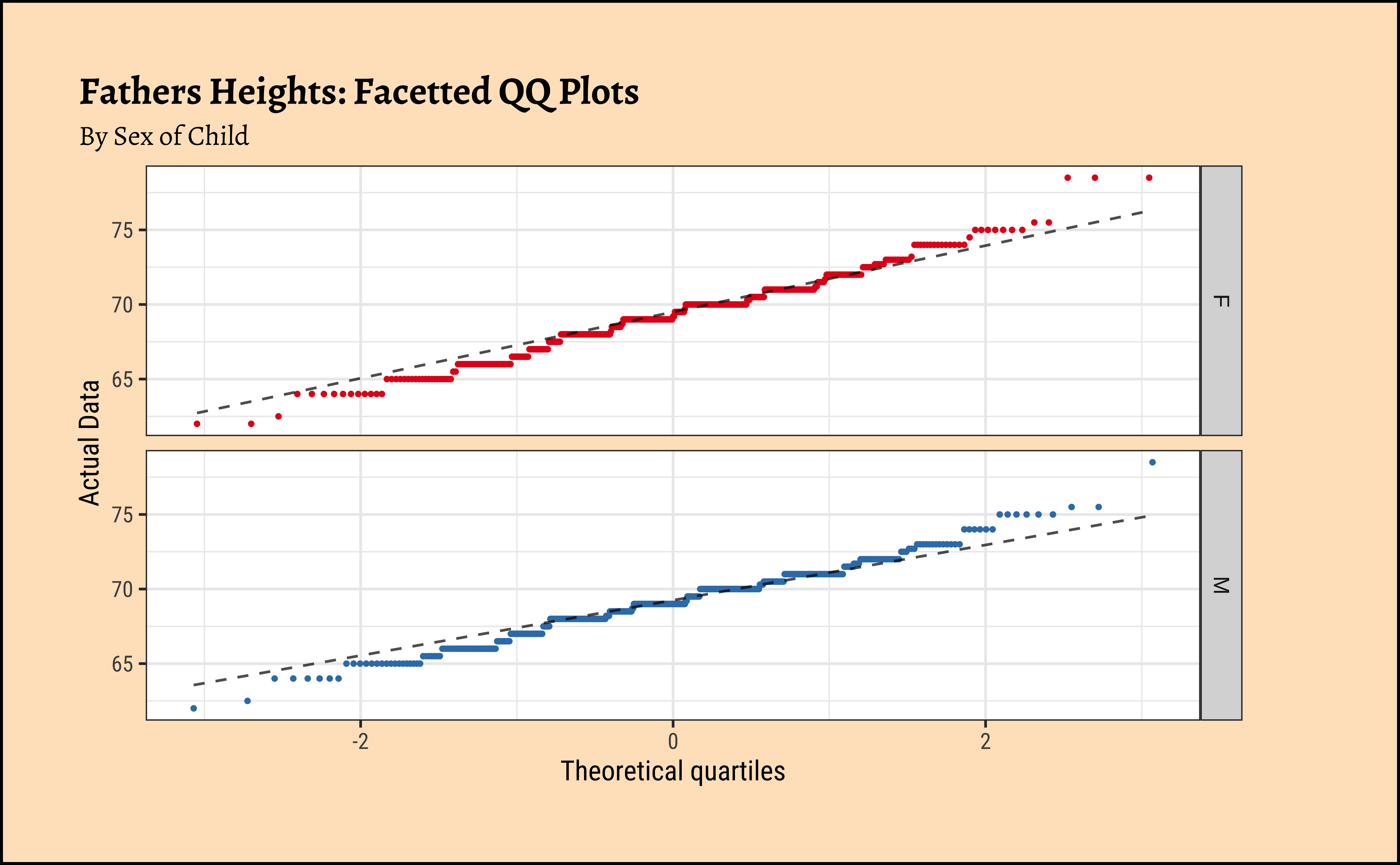 Why are the respective \(r\)-s and \(\beta_1\)-s different, though the p-value-s is suspiciously the same!? Did we miss a factor of \(\frac{sd(son/daughter)}{sd(father)} = ??\) somewhere…??