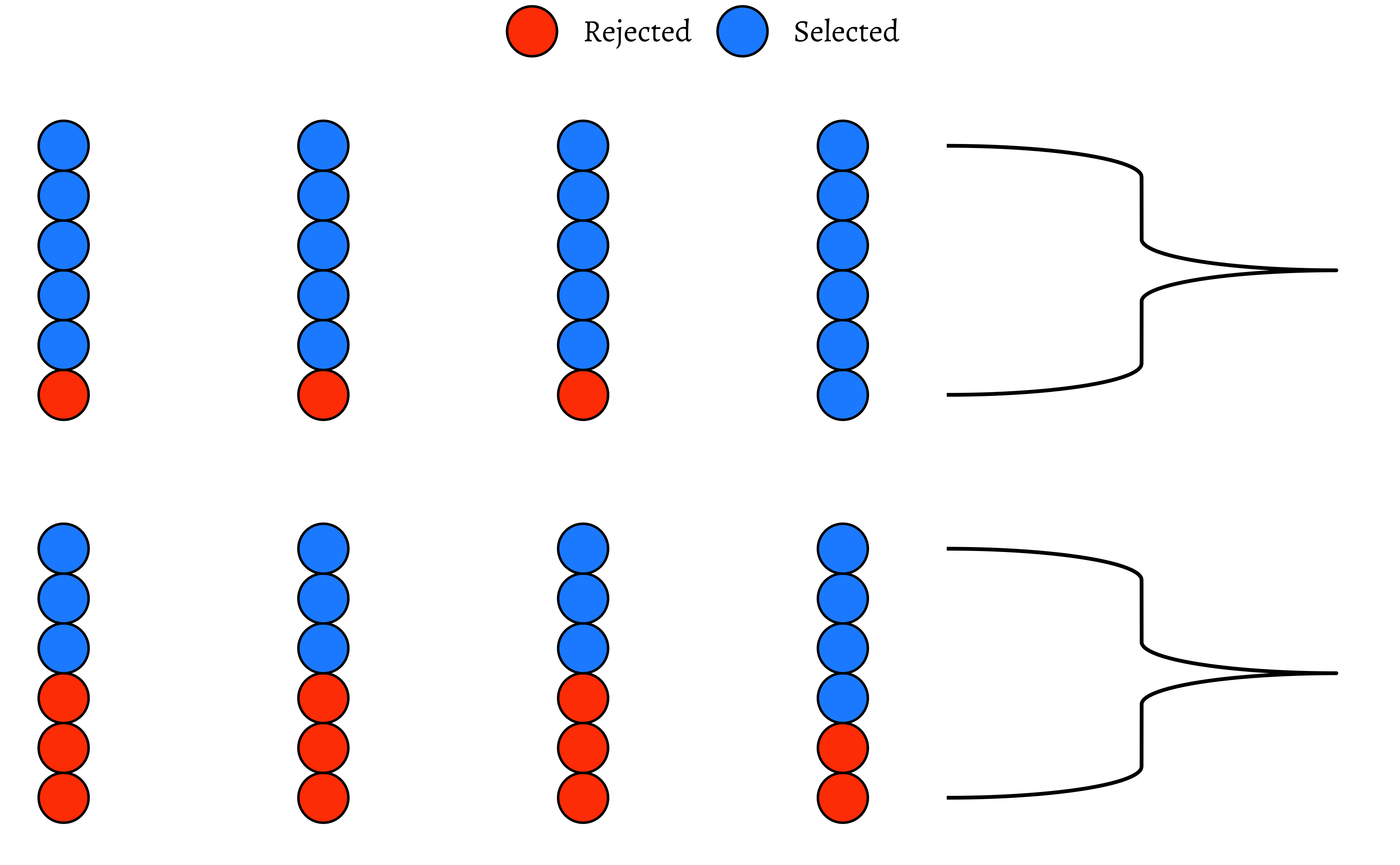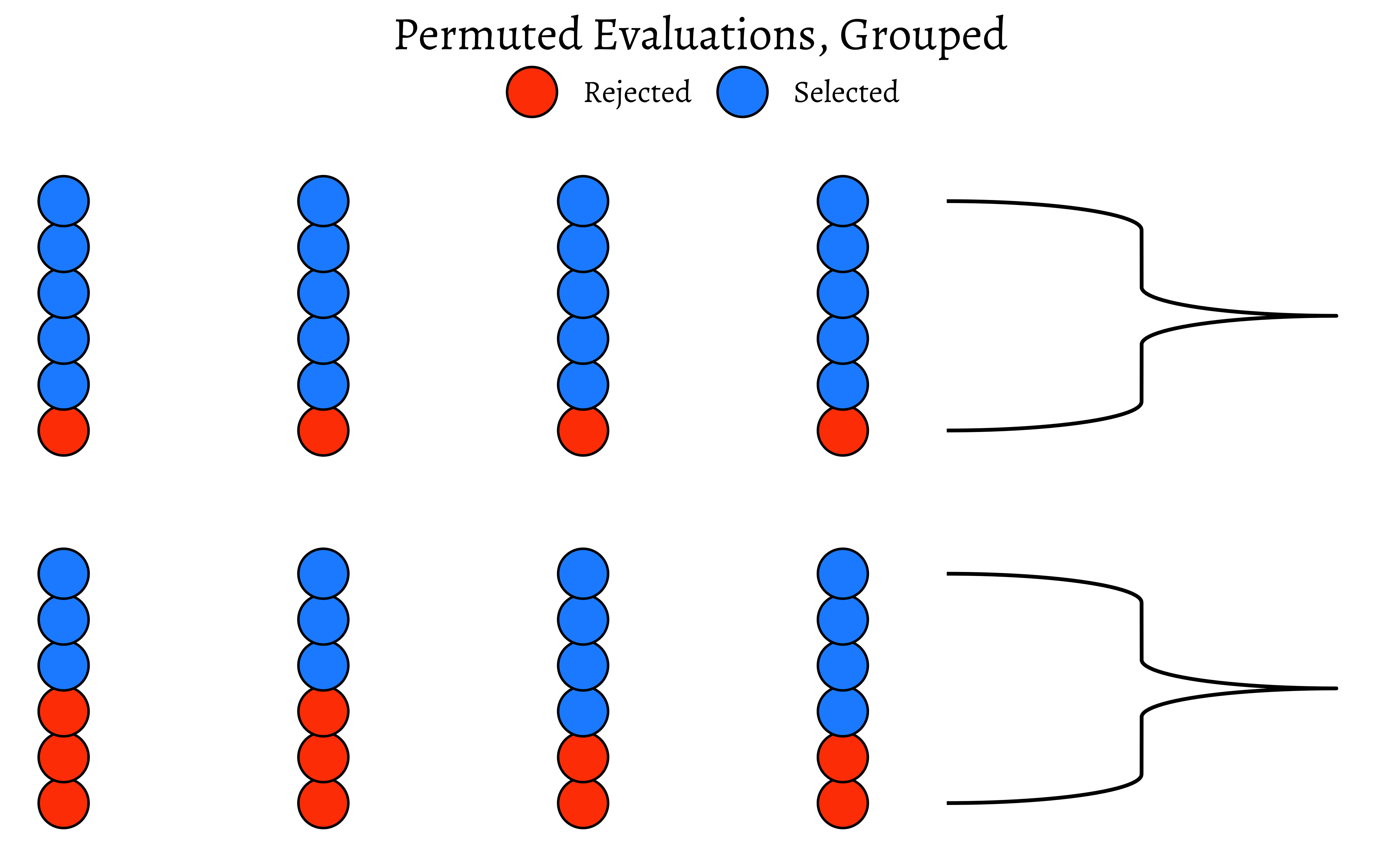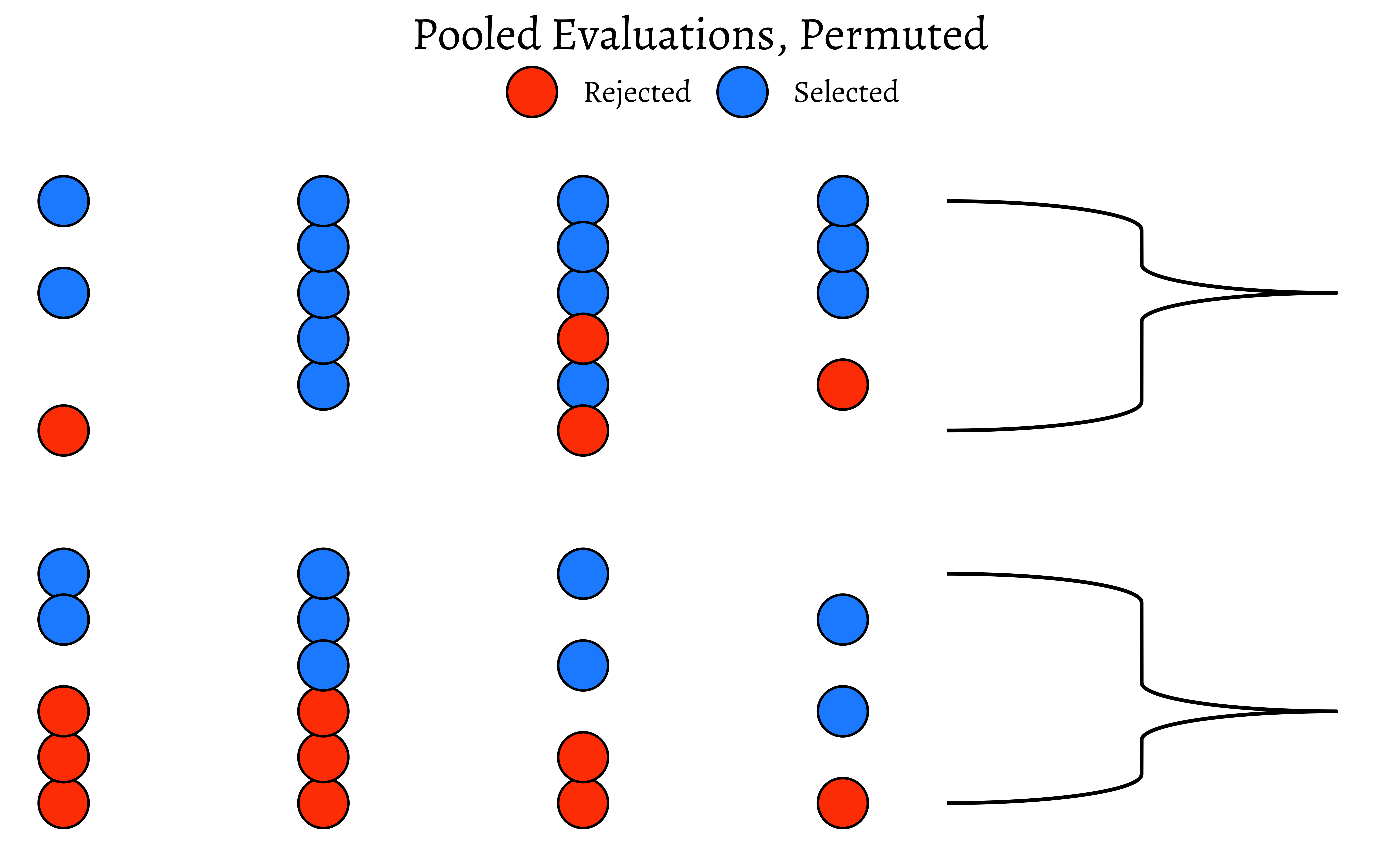 - Arbitrarily re-assign a given candidate(selected or rejected) to either of the two sets of evaluators, by permutation.