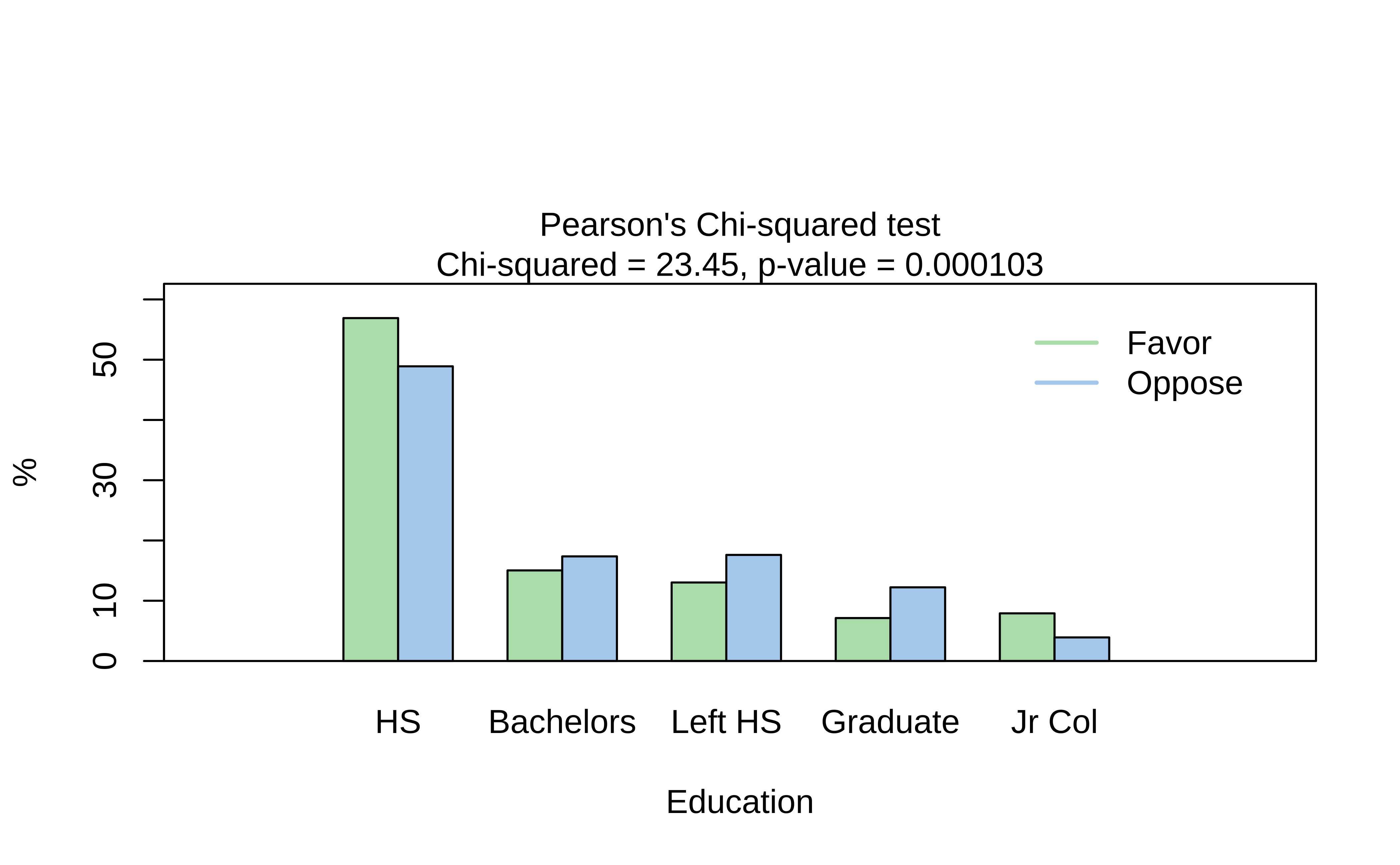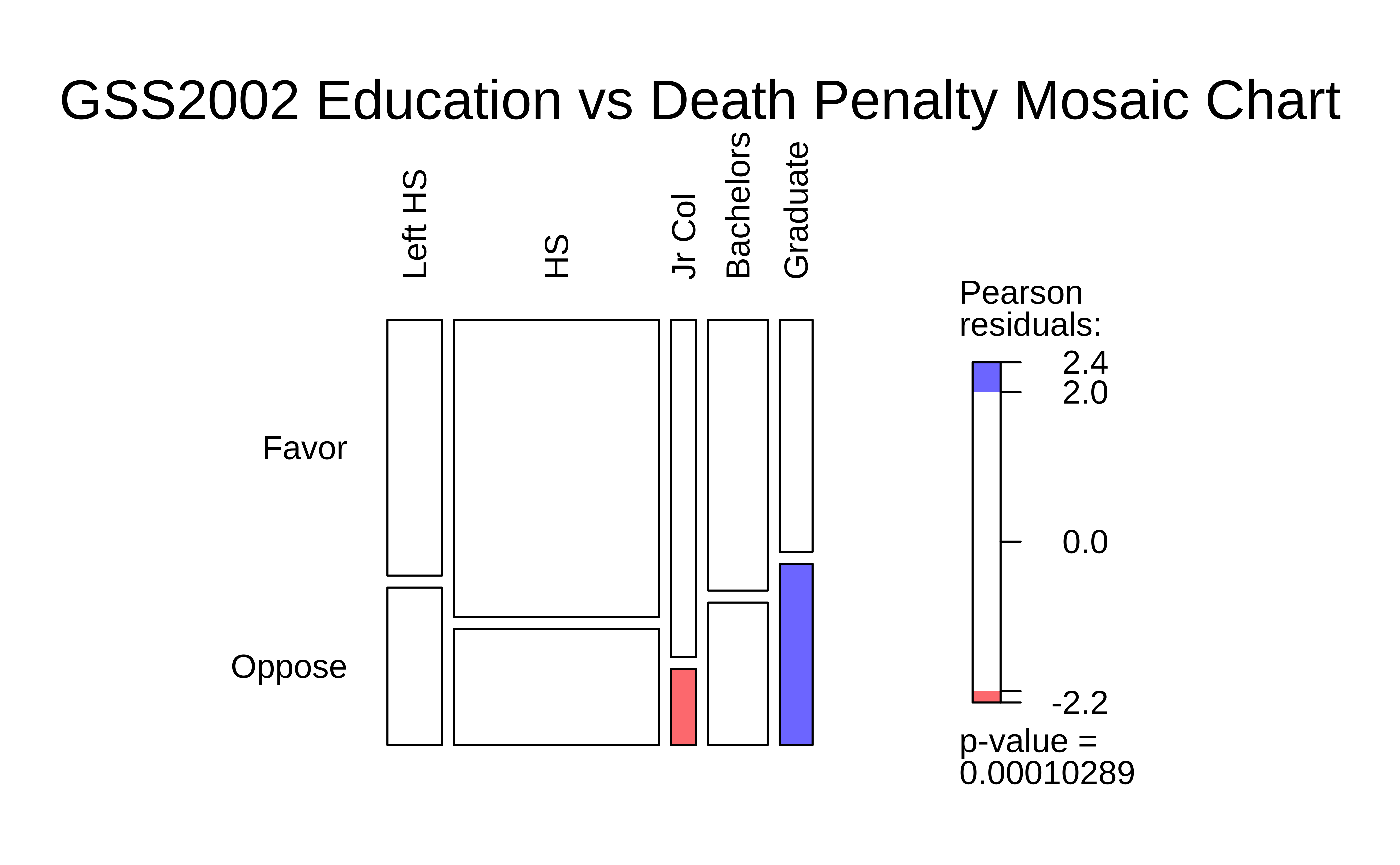 The p-value is well below our threshold of \(0.05\), so we would conclude that Education has a significant effect on DeathPenalty opinion!