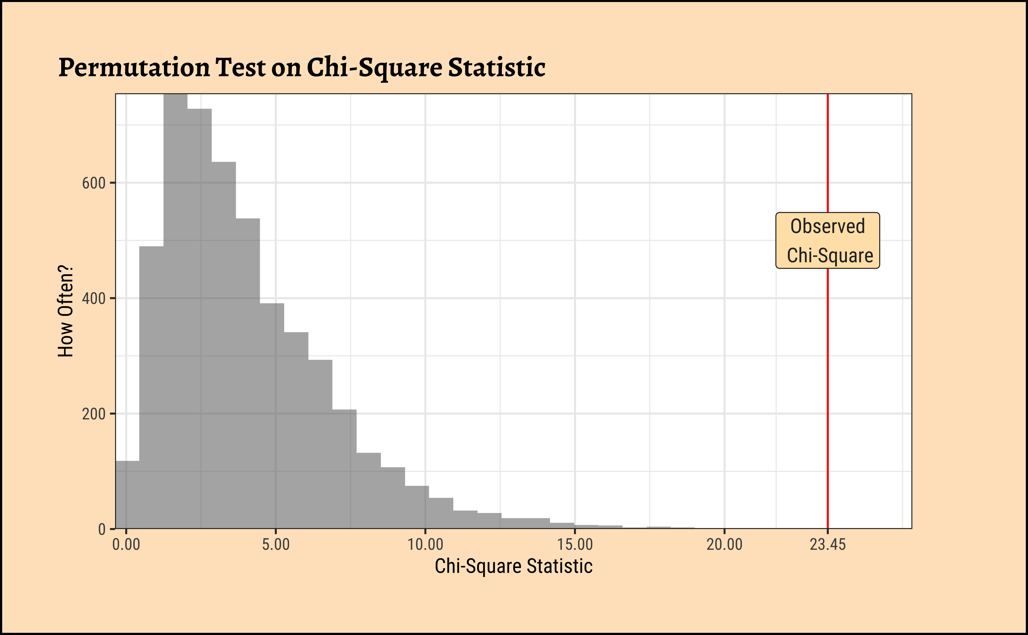 In our basic \(X^2\) test, we calculate the test statistic of \(X^2\) and look up a theoretical null distribution for that statistic, and see how unlikely our observed value is.