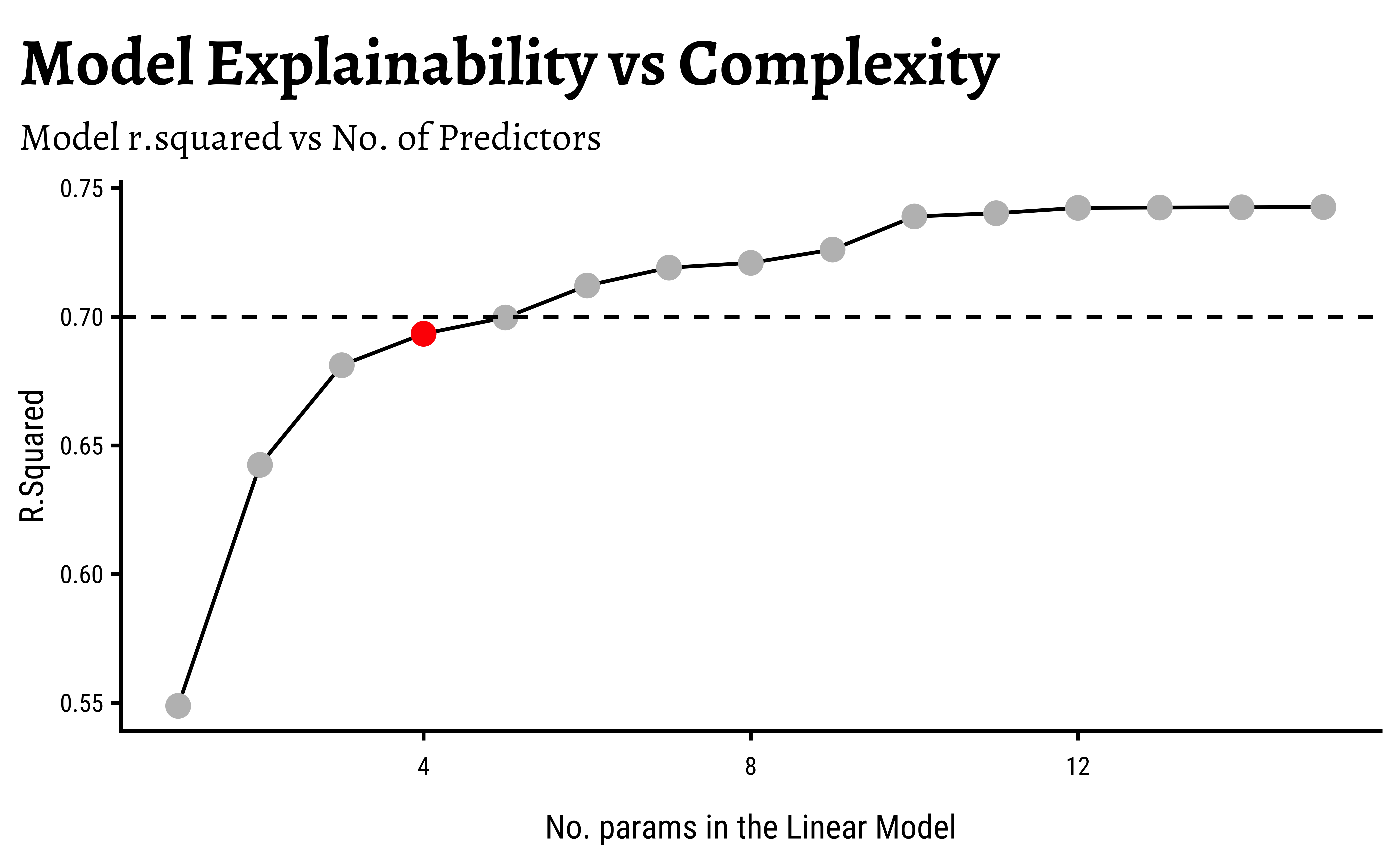 subtitle = "Model r.squared vs No. of Predictors",
