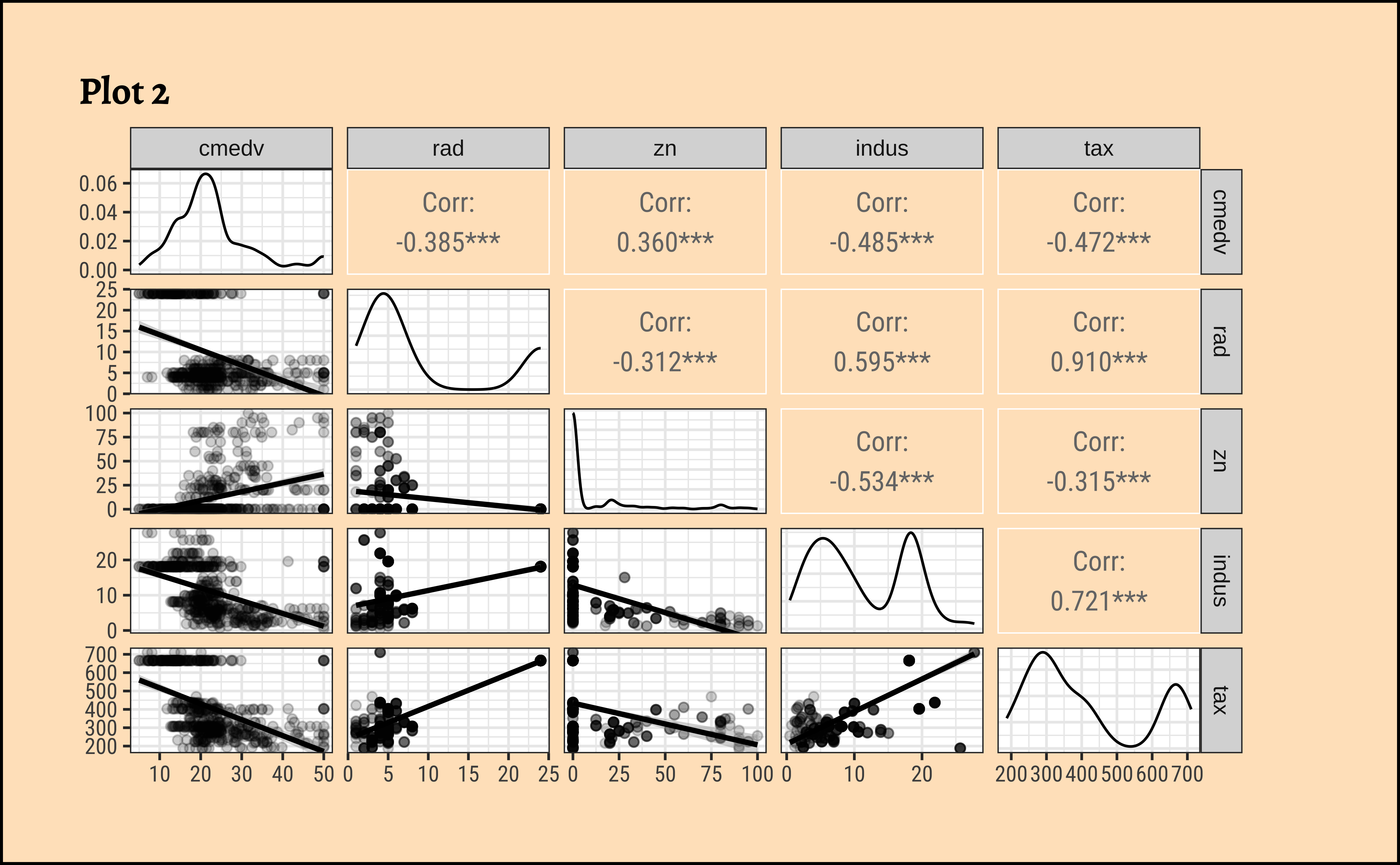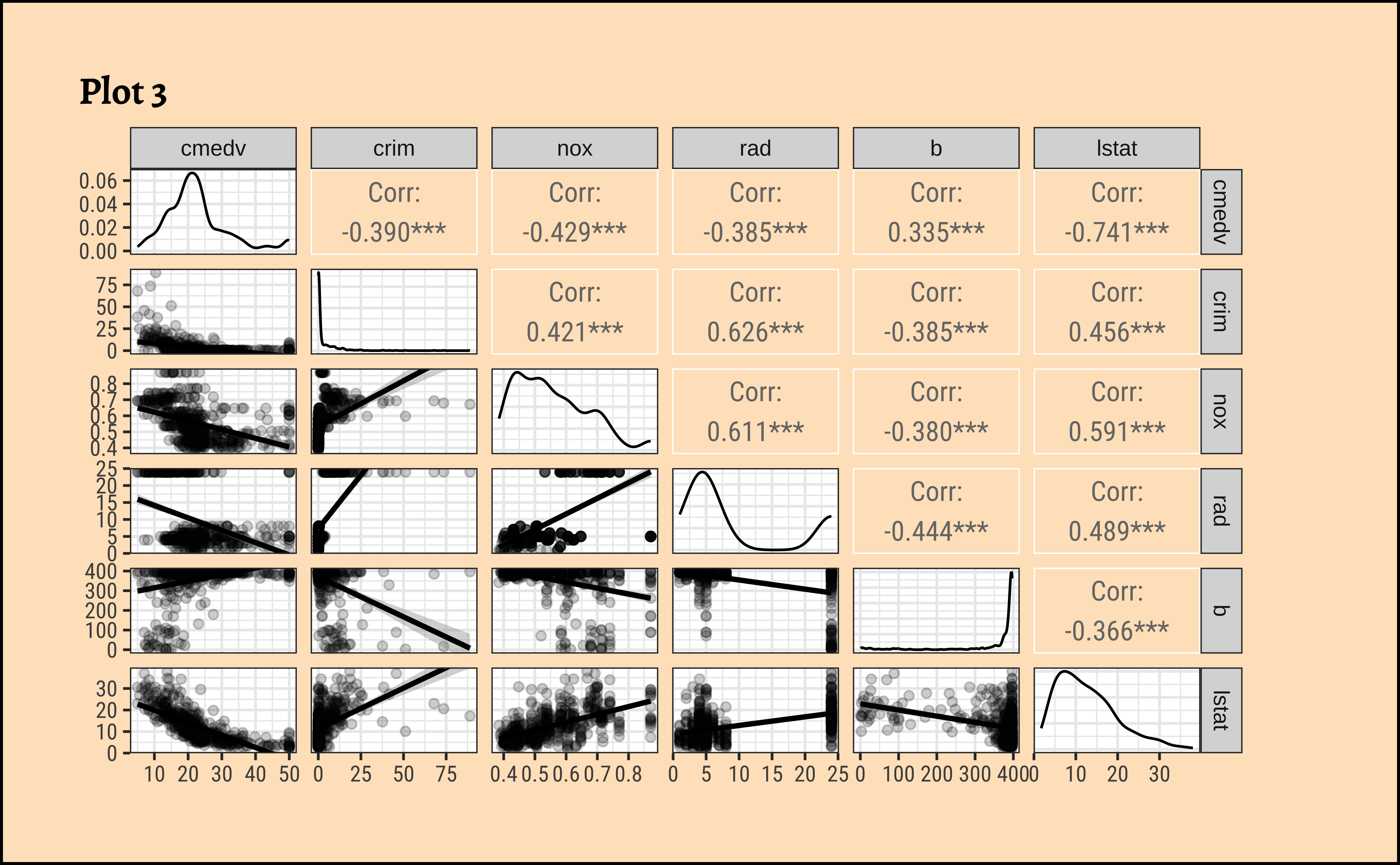 The “trend line” of residuals vs predictors Figure 10 (a) shows a U-shaped pattern, indicating significant nonlinearity: there is a curved relationship in the graph. The solution can be a nonlinear transformation of the predictor variables, such as \(\sqrt(X)\), \(log(X)\), or even \(X^2\). For instance, we might try a model for cmedv using \(rm^2\) instead of just rm as we have done. This will still be a linear model!