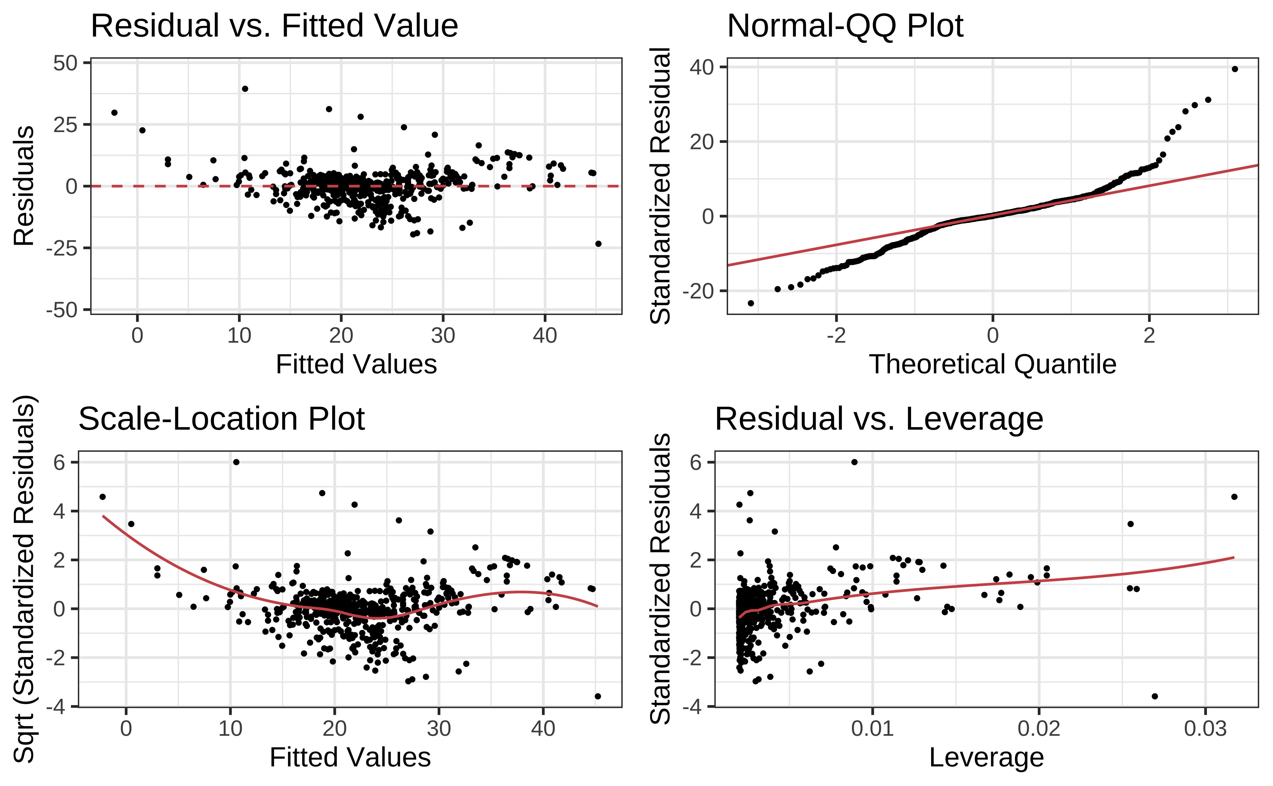 plot(housing_lm)One of the ggplot extension packages named lindia also has a crisp command to plot these diagnostic graphs.