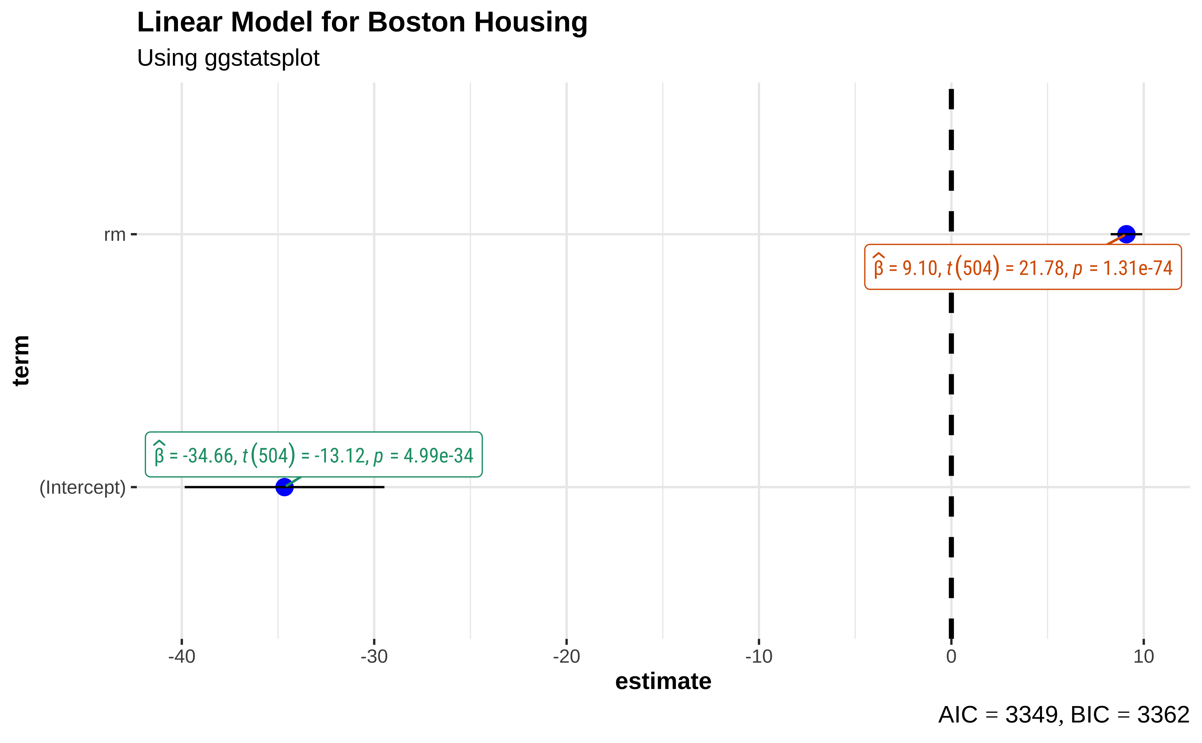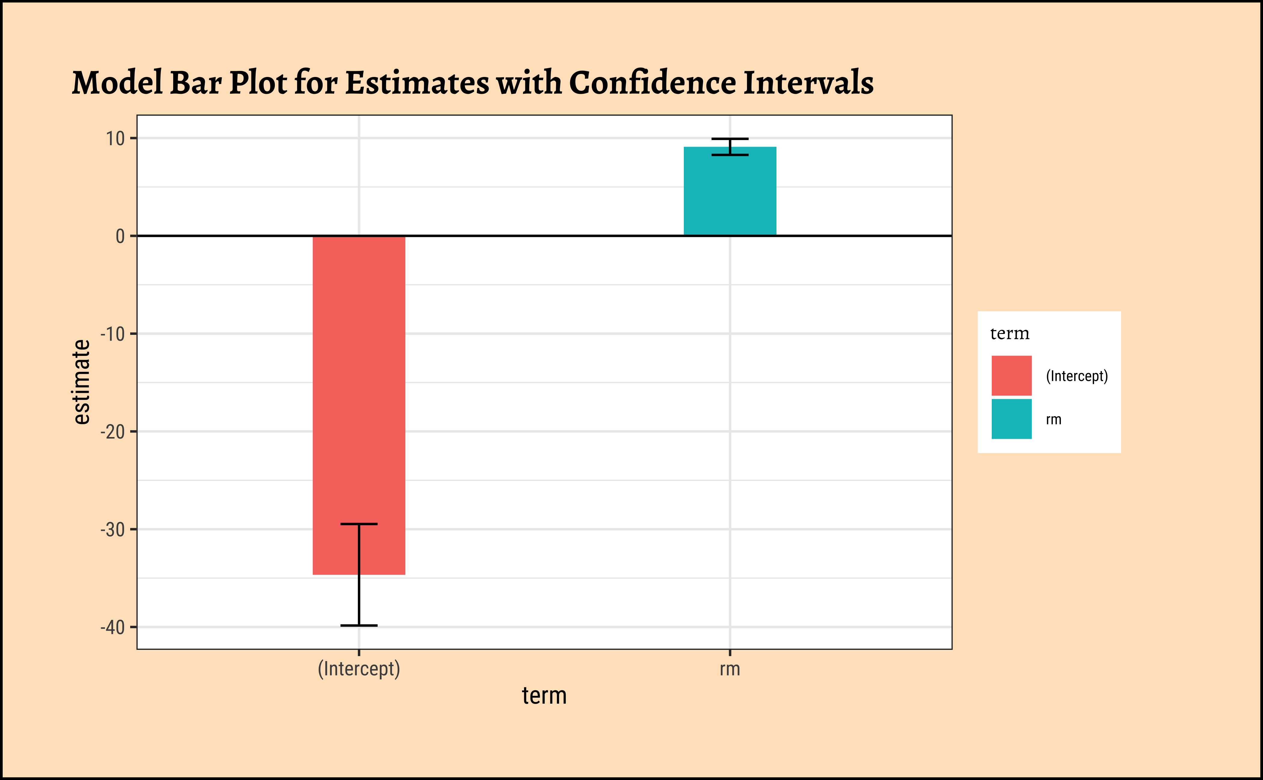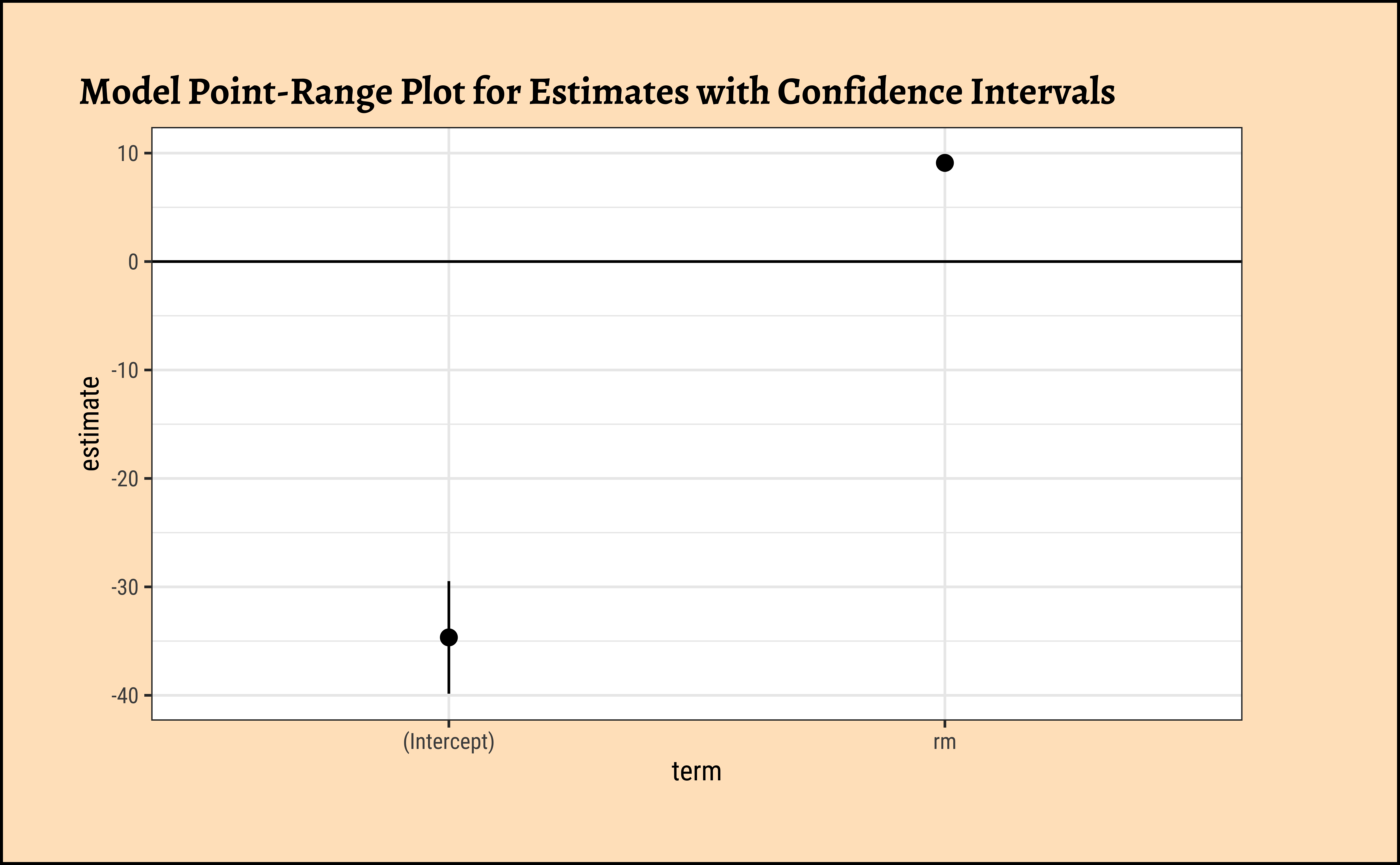 )This chart shows the estimates for the intercept and rm along with their error bars, the t-statistic, degrees of freedom, and the p-value.