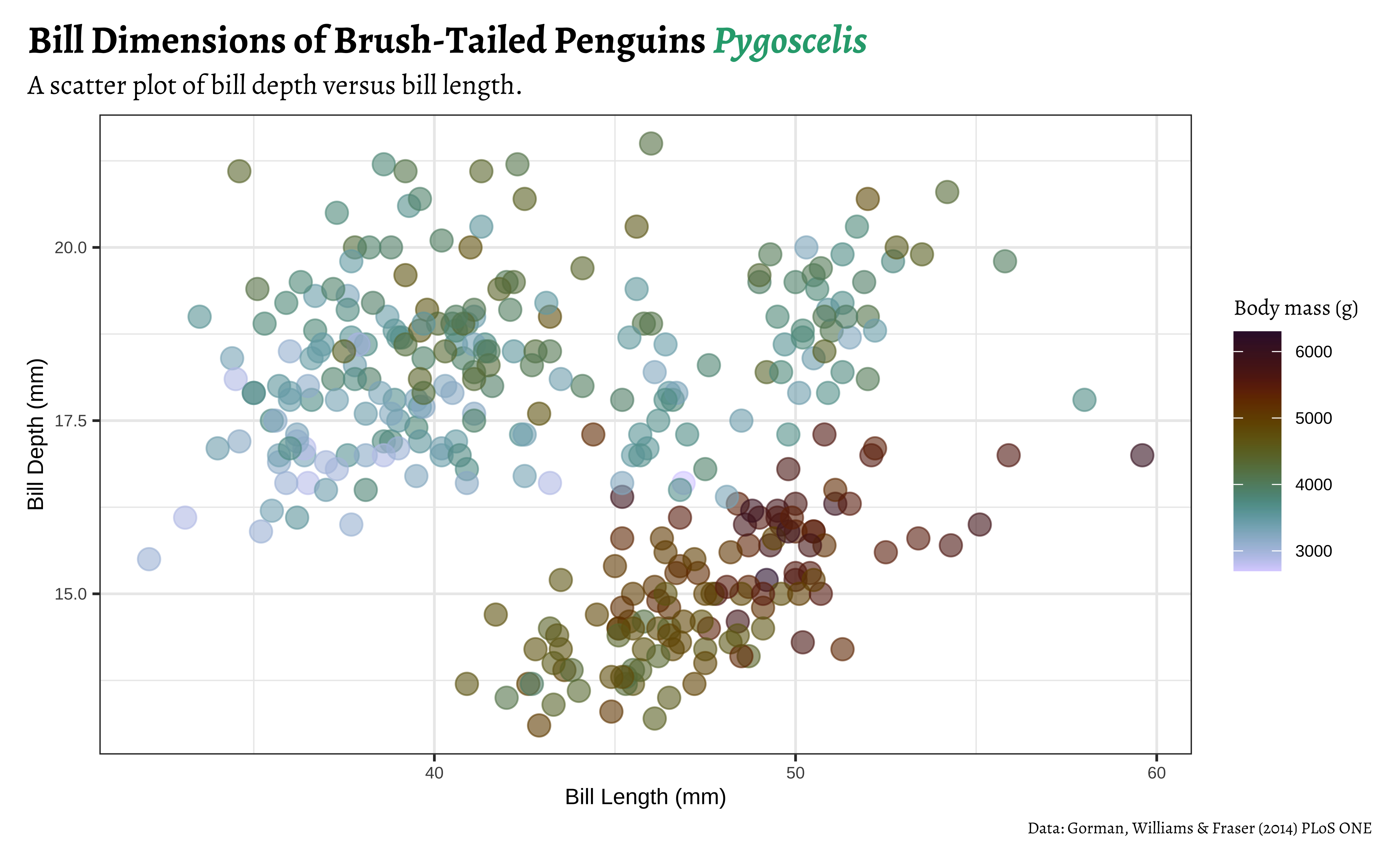 labs(title = 'Bill Dimensions of Brush-Tailed Penguins <i style="color:#28A87D;">Pygoscelis</i>') +