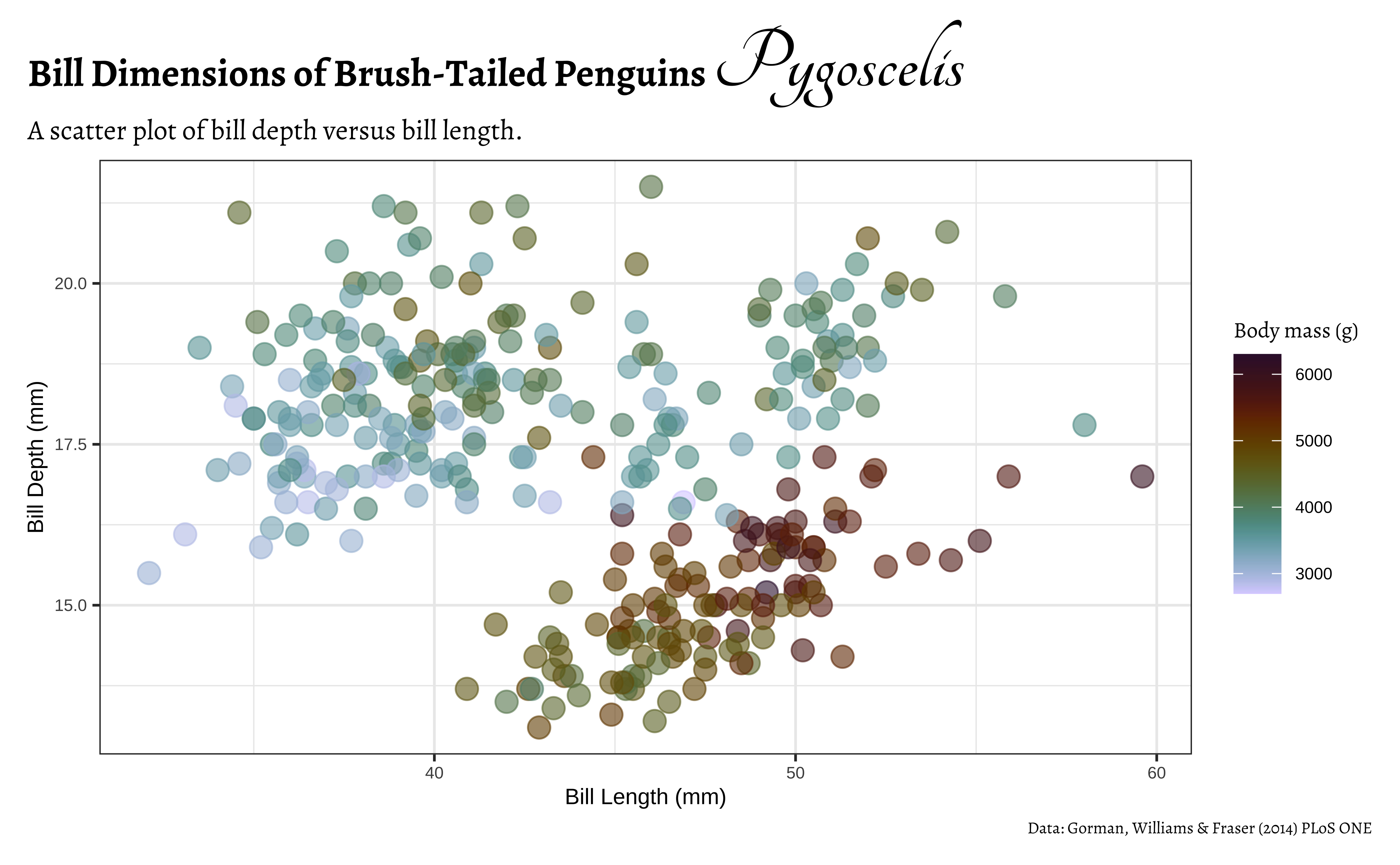 labs(title = 'Bill Dimensions of Brush-Tailed Penguins <b style="font-size:32pt;font-family:Tangerine;">Pygoscelis</b>') +