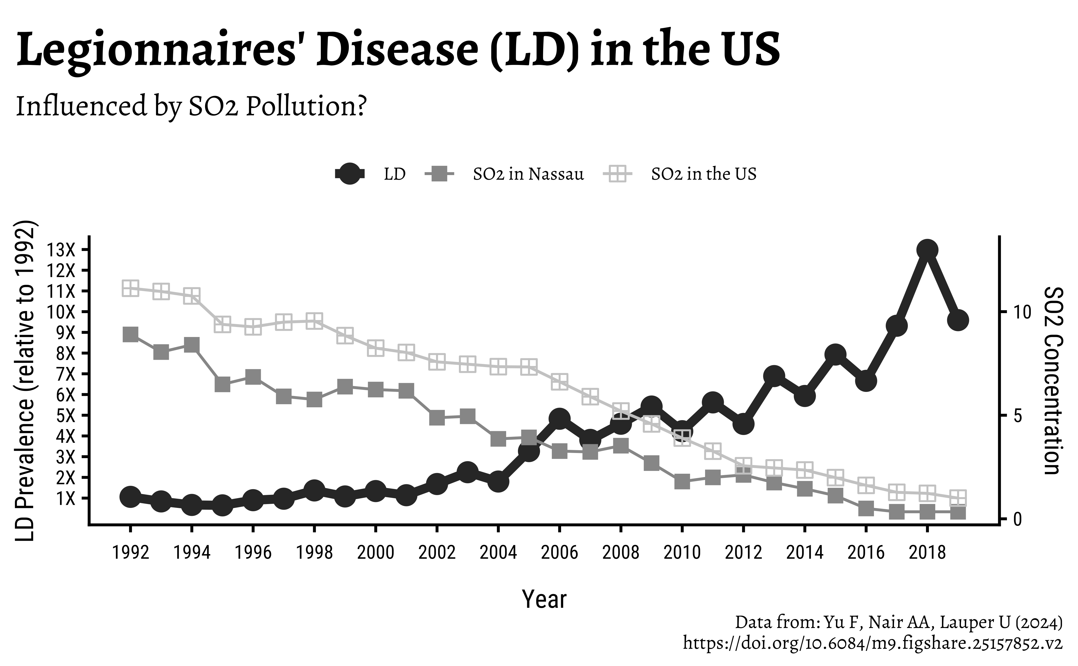 Legionnaires’ disease (LD) is a severe form of pneumonia (∼10–25% fatality rate) caused by inhalation of aerosols containing Legionella, a pathogenic gram-negative bacteria. These bacteria can grow, spread, and aerosolize through building water systems. A recent dramatic increase in LD incidence has been observed globally, with a 9-fold increase in the United States from 2000 to 2018,