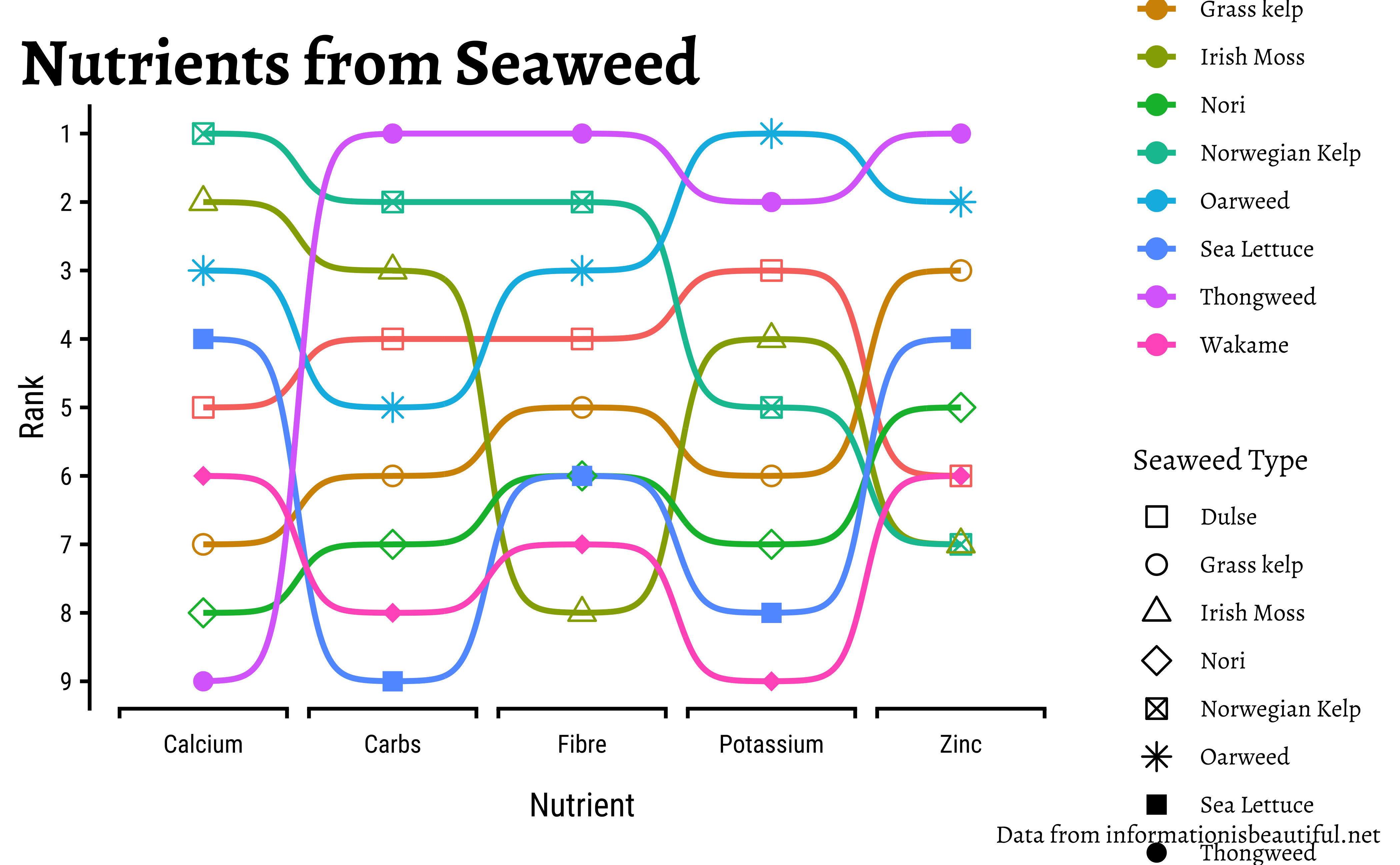 Nine types of Seaweed were rated on different parameters and charted as shown below.