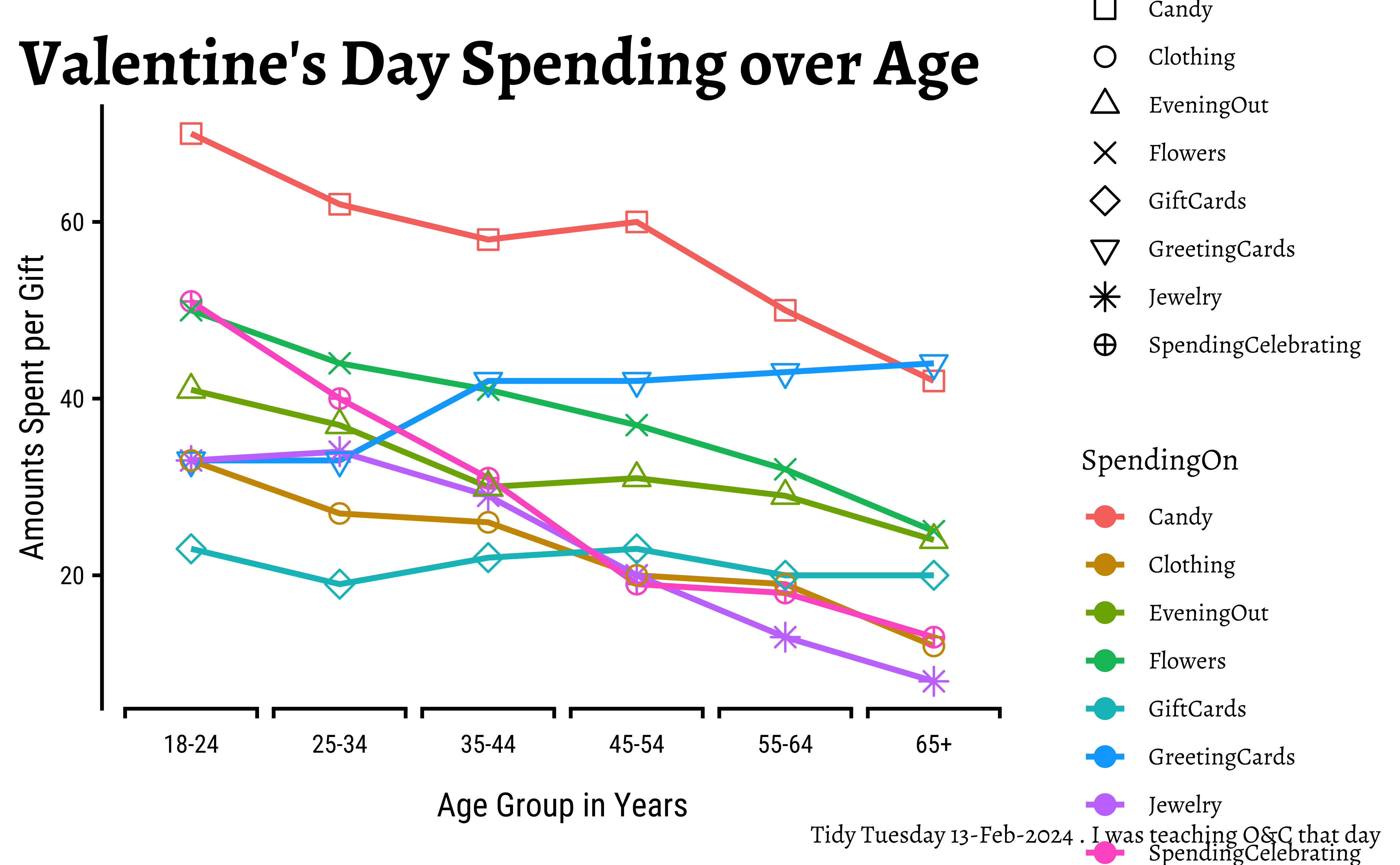 This dataset pertains to spending on gifts by various people for Valentine’s Day. This was part of the TidyTuesday Project for February 2024!
