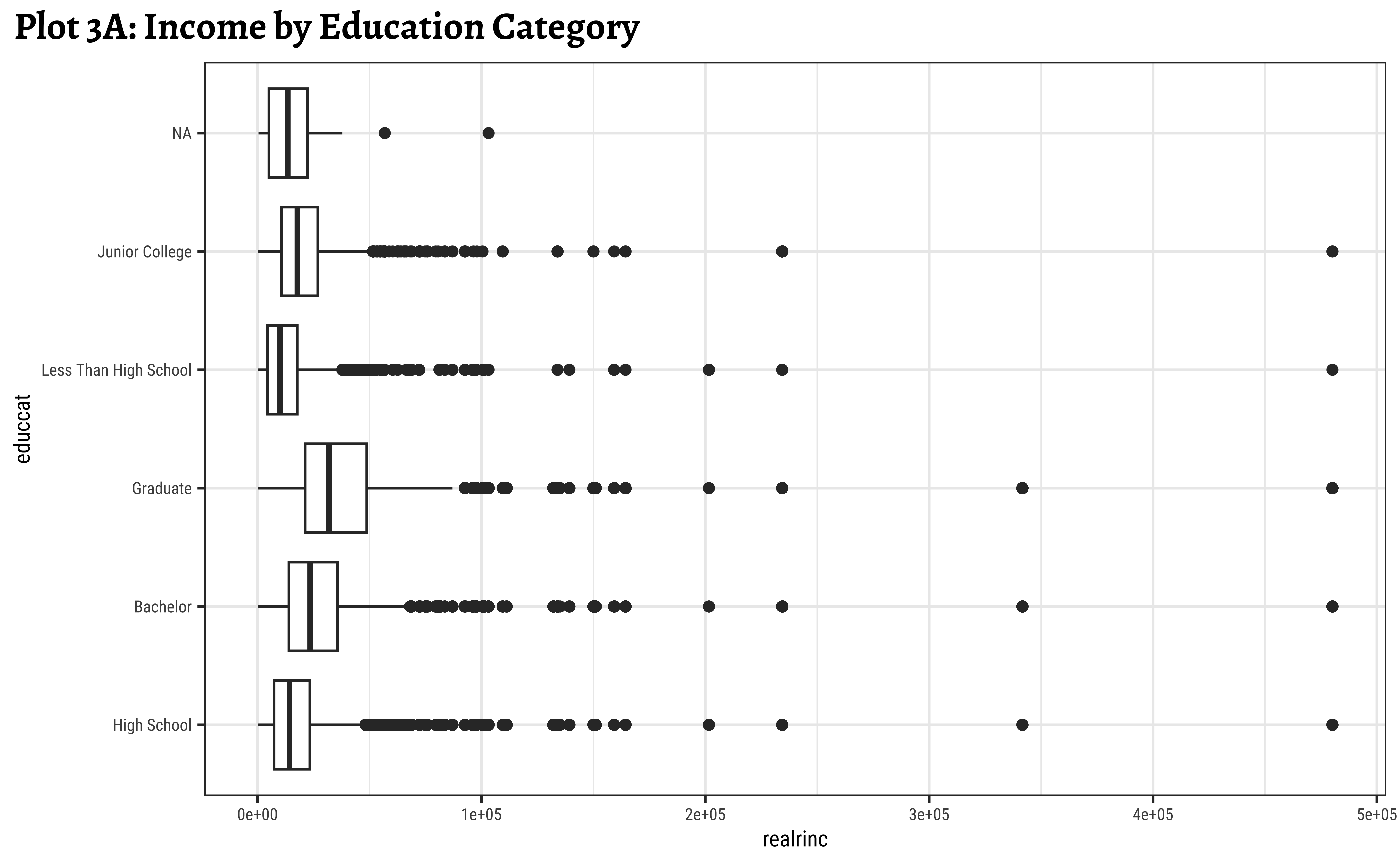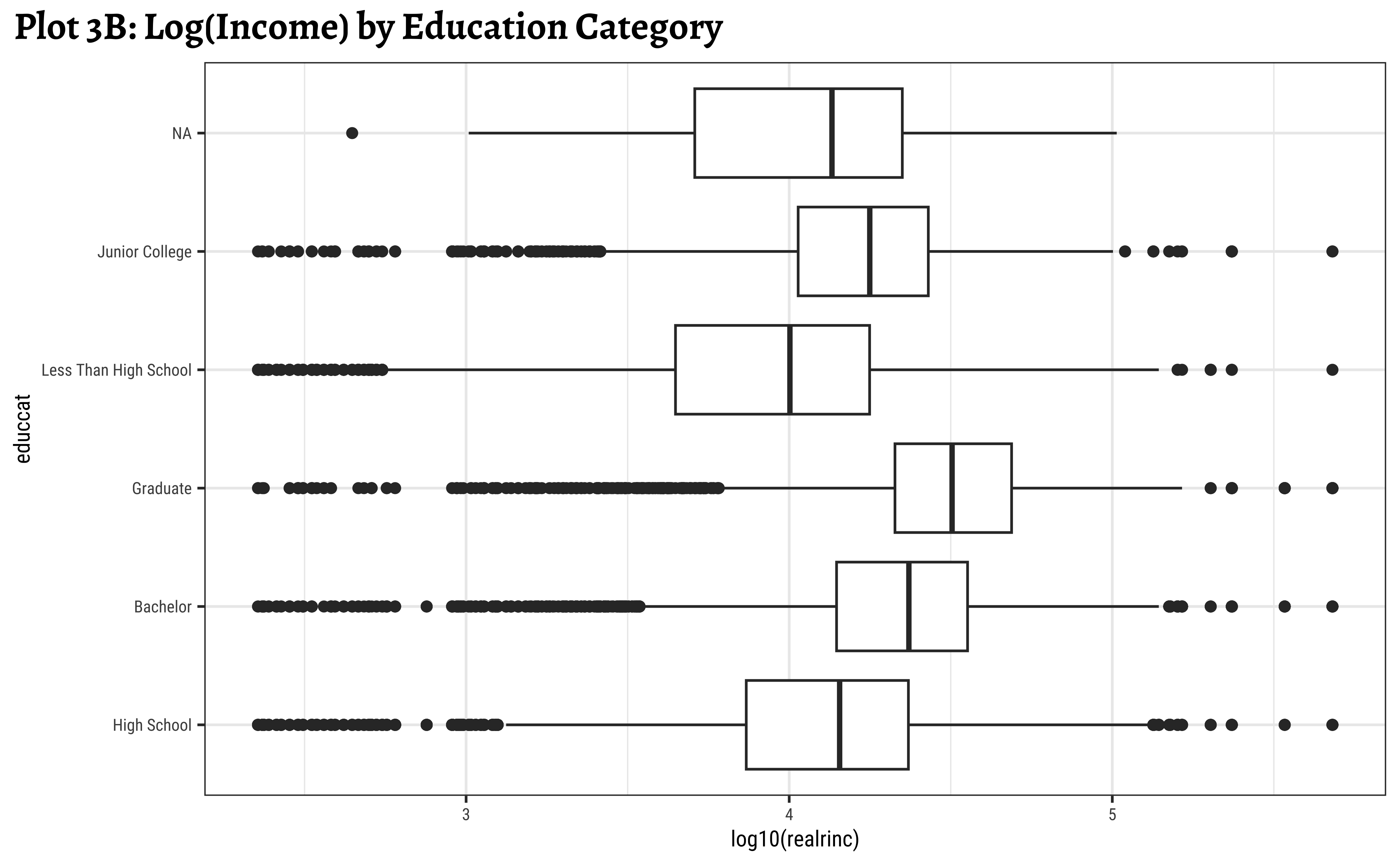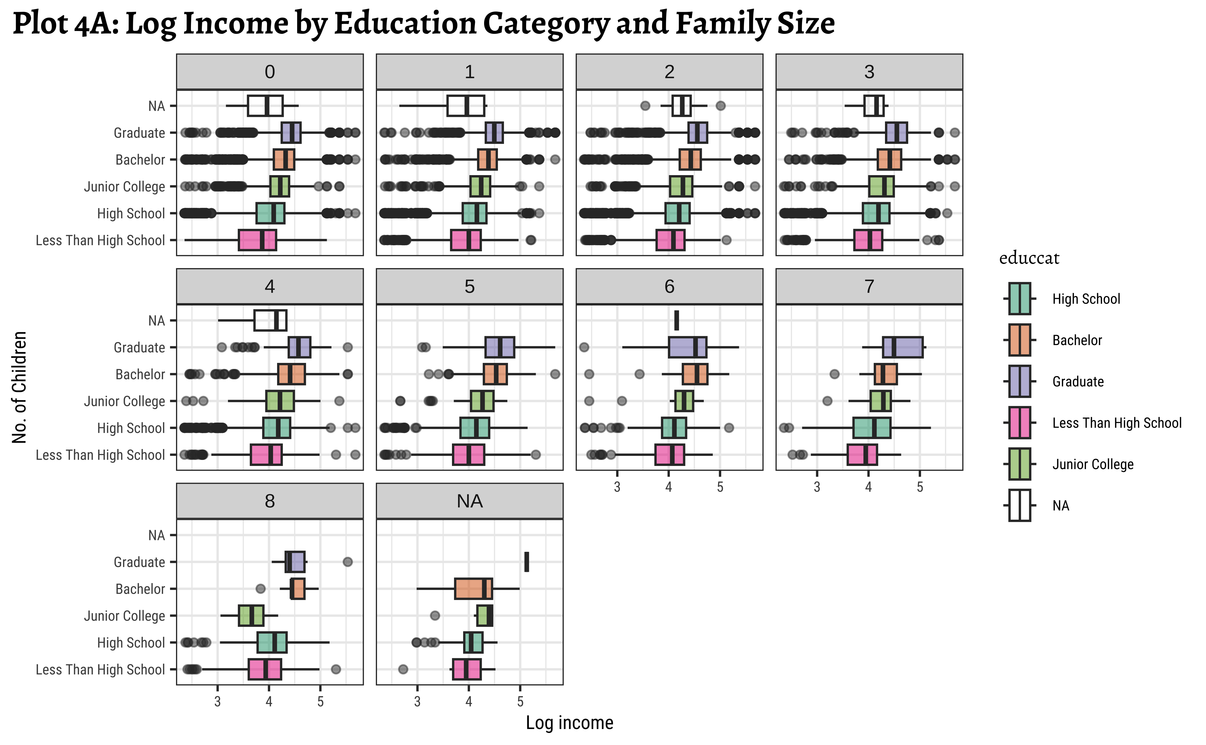 labs(title = "Plot 4A: Log Income by Education Category and Family Size", x = "Log income", y = "No. of Children")