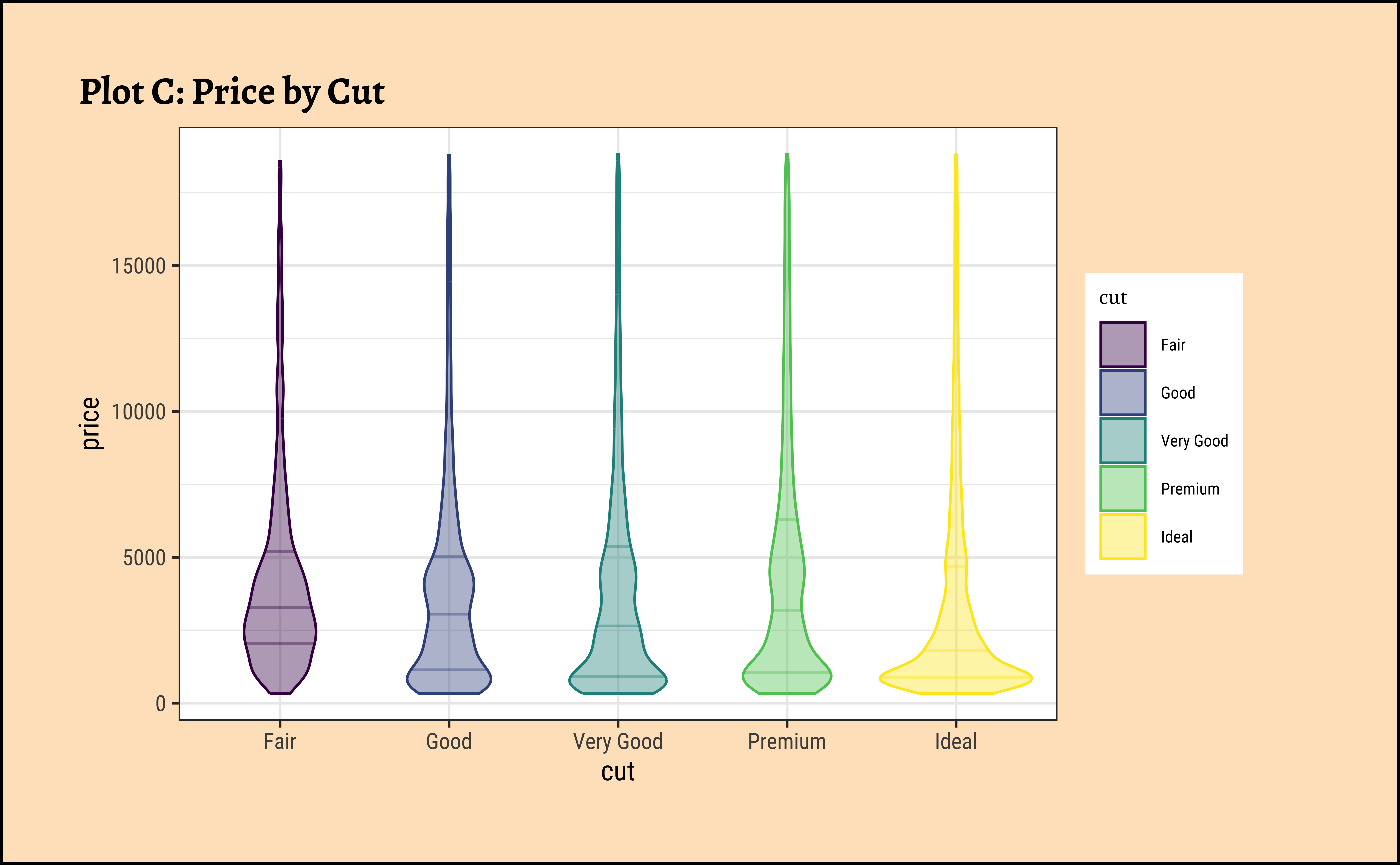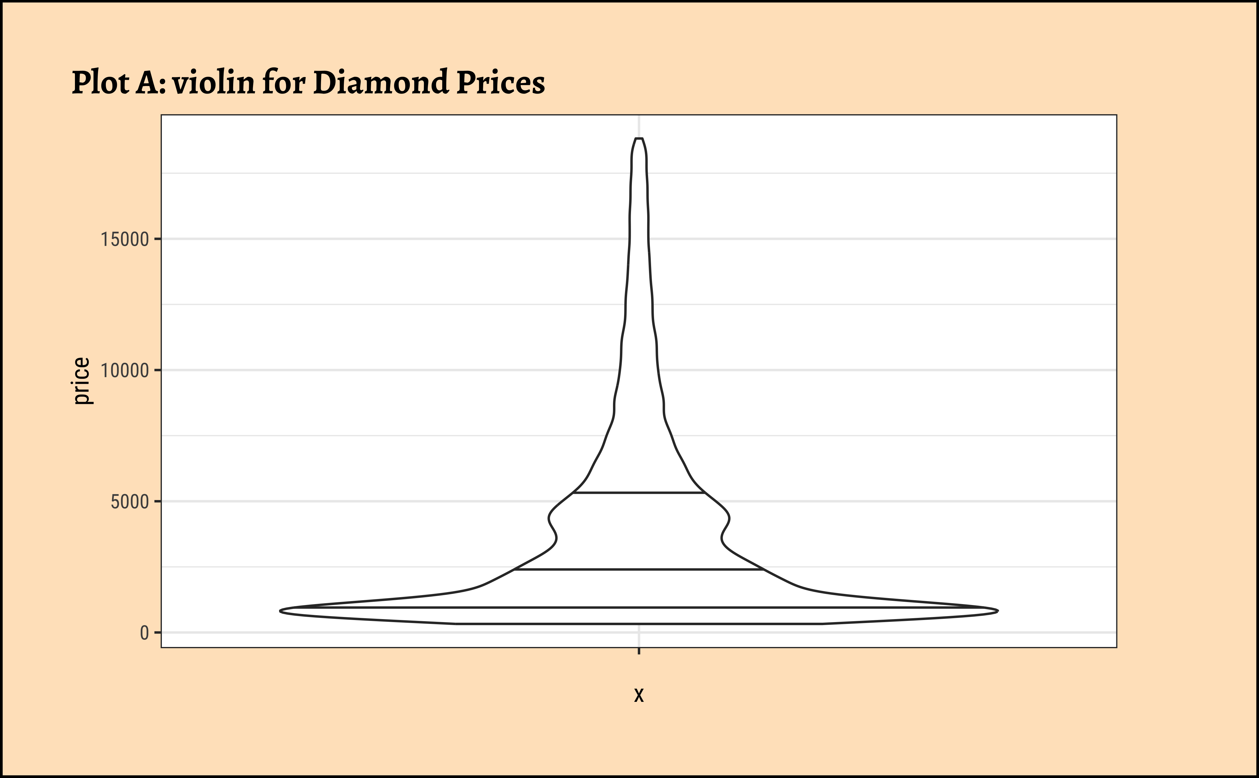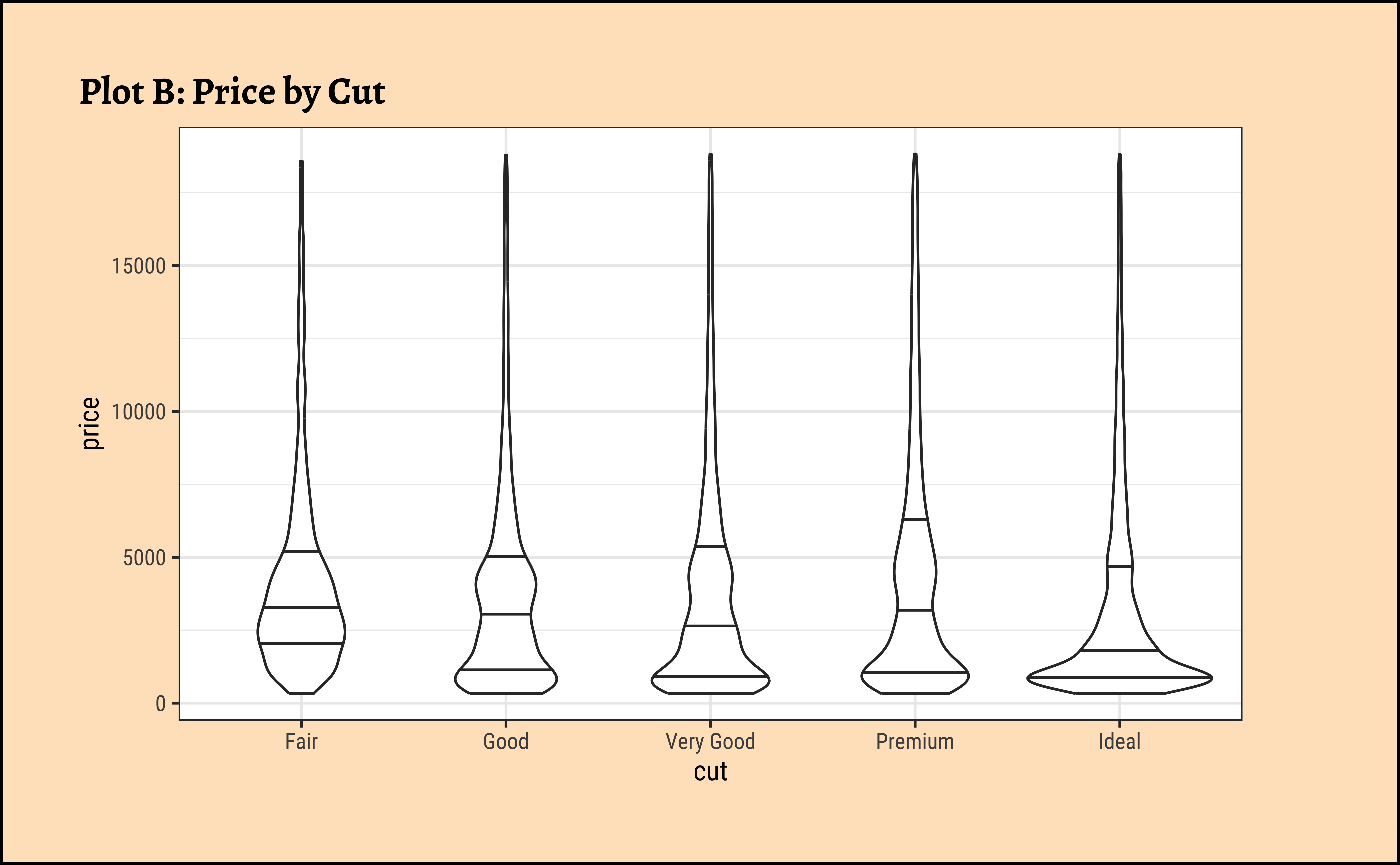 Yet another plot that allows comparison of multiple densities side by side is a violin plot. The violin plot combines the aspects of a boxplot(ranking of values, median, quantiles…) with a superimposed density plot. This allows us to look at medians, means, densities, and quantiles of a Quant variable with respect to another Qual variable. Let us see what this looks like!