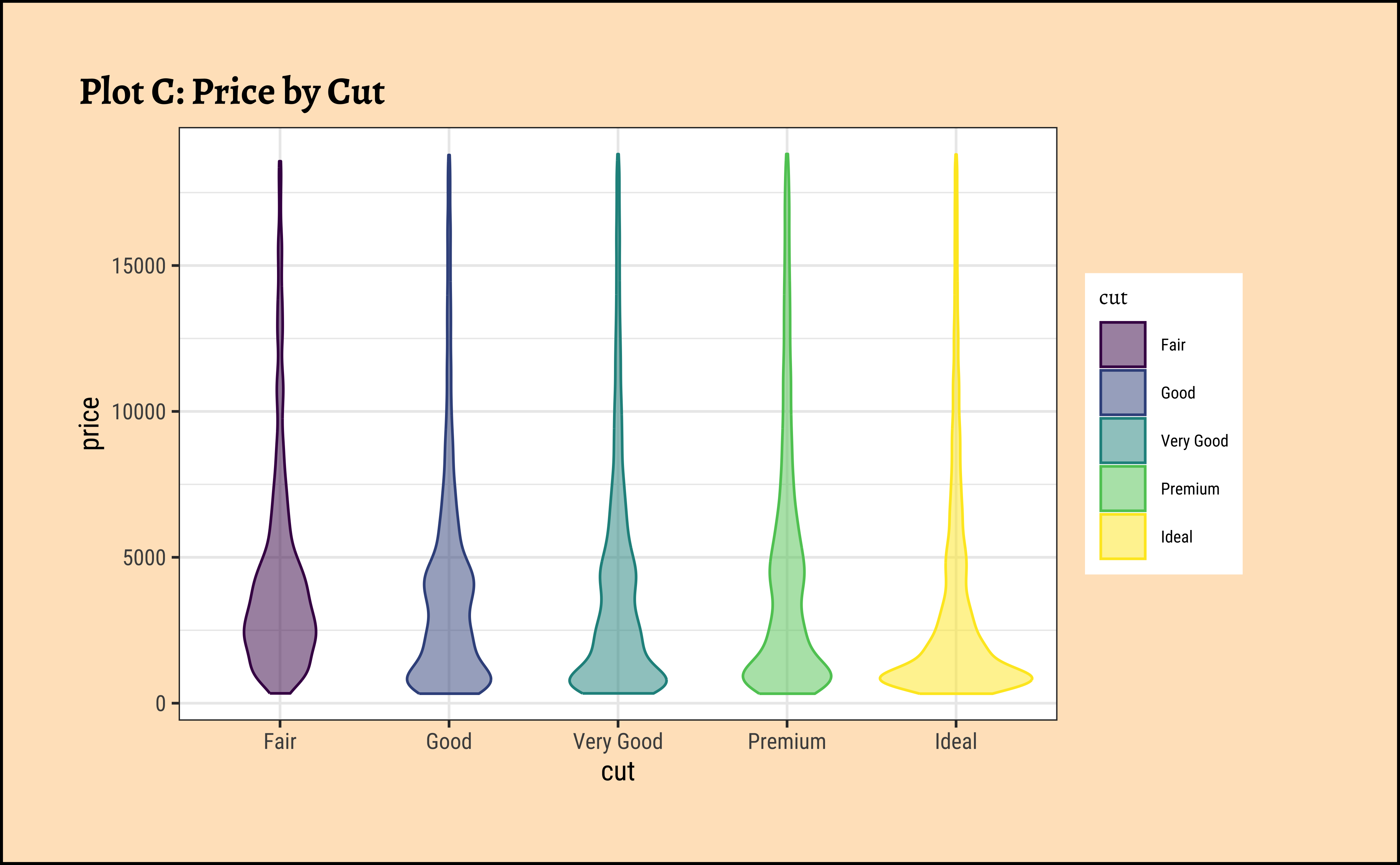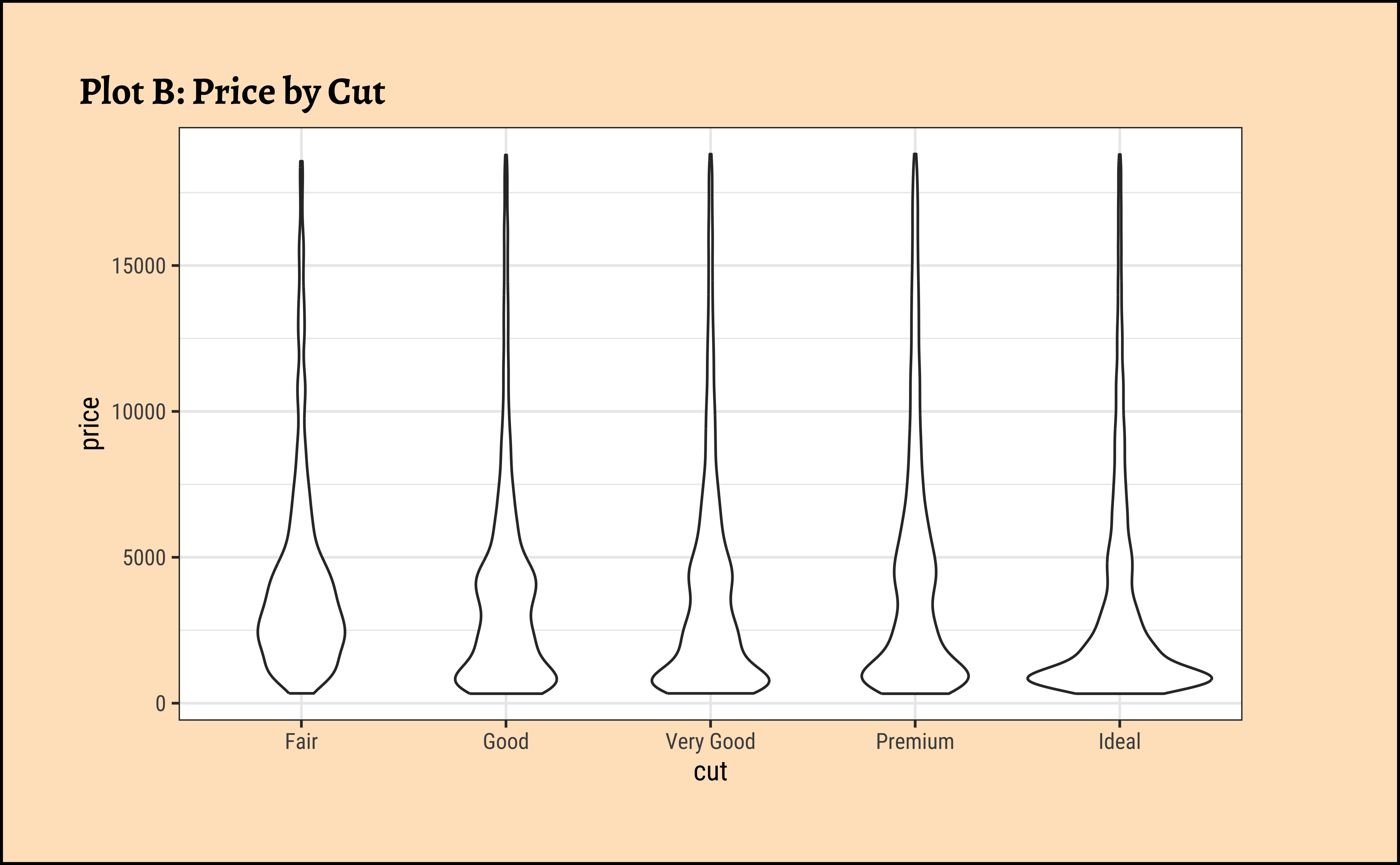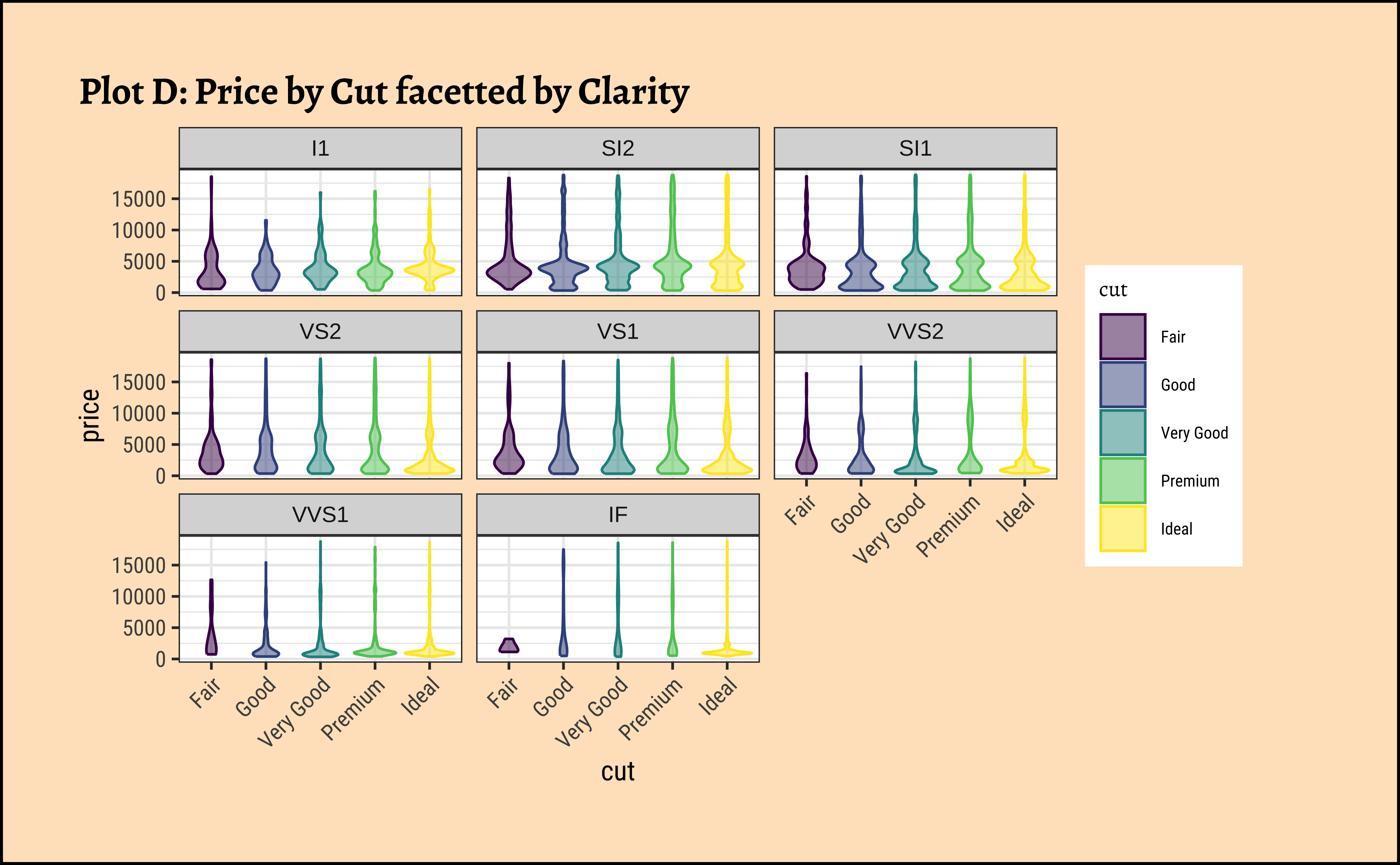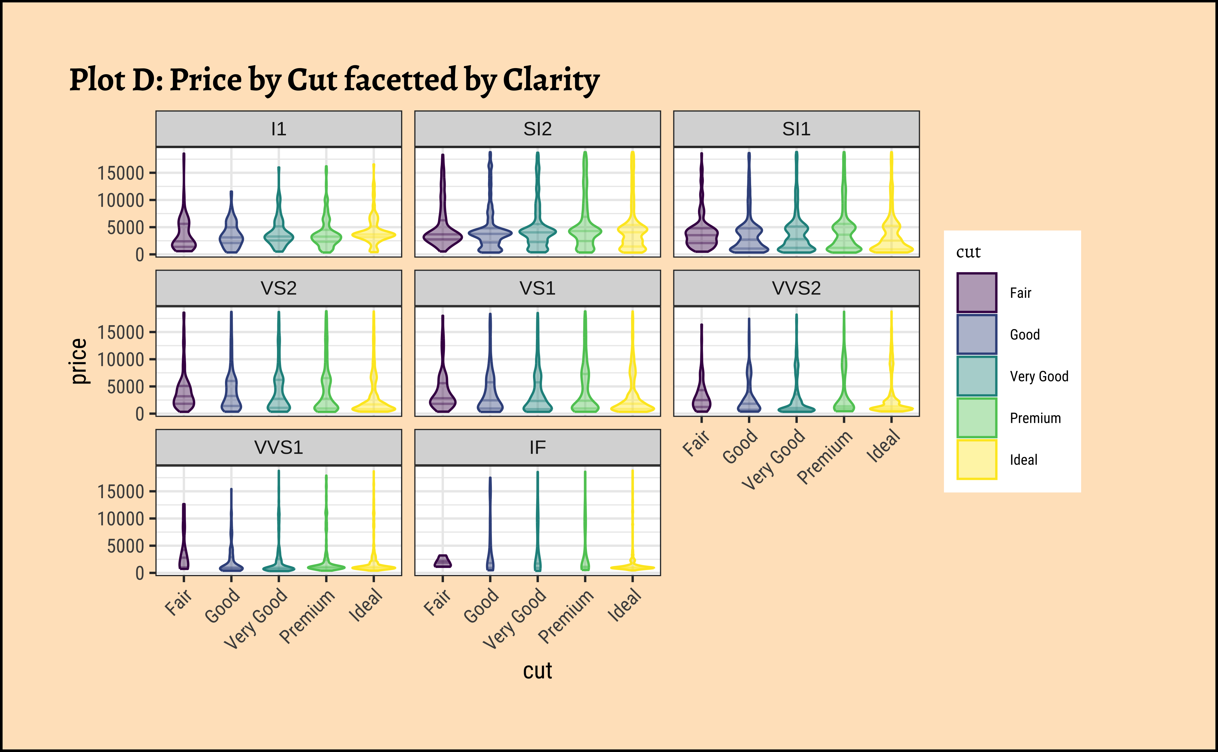 gf_labs(title = "Plot D: Price by Cut facetted by Clarity") %>%