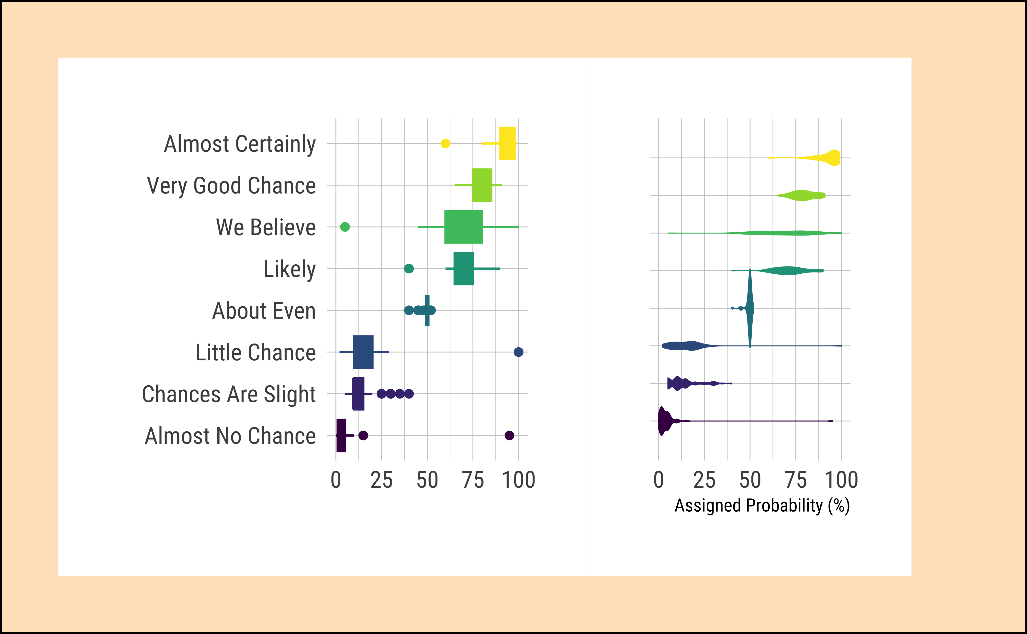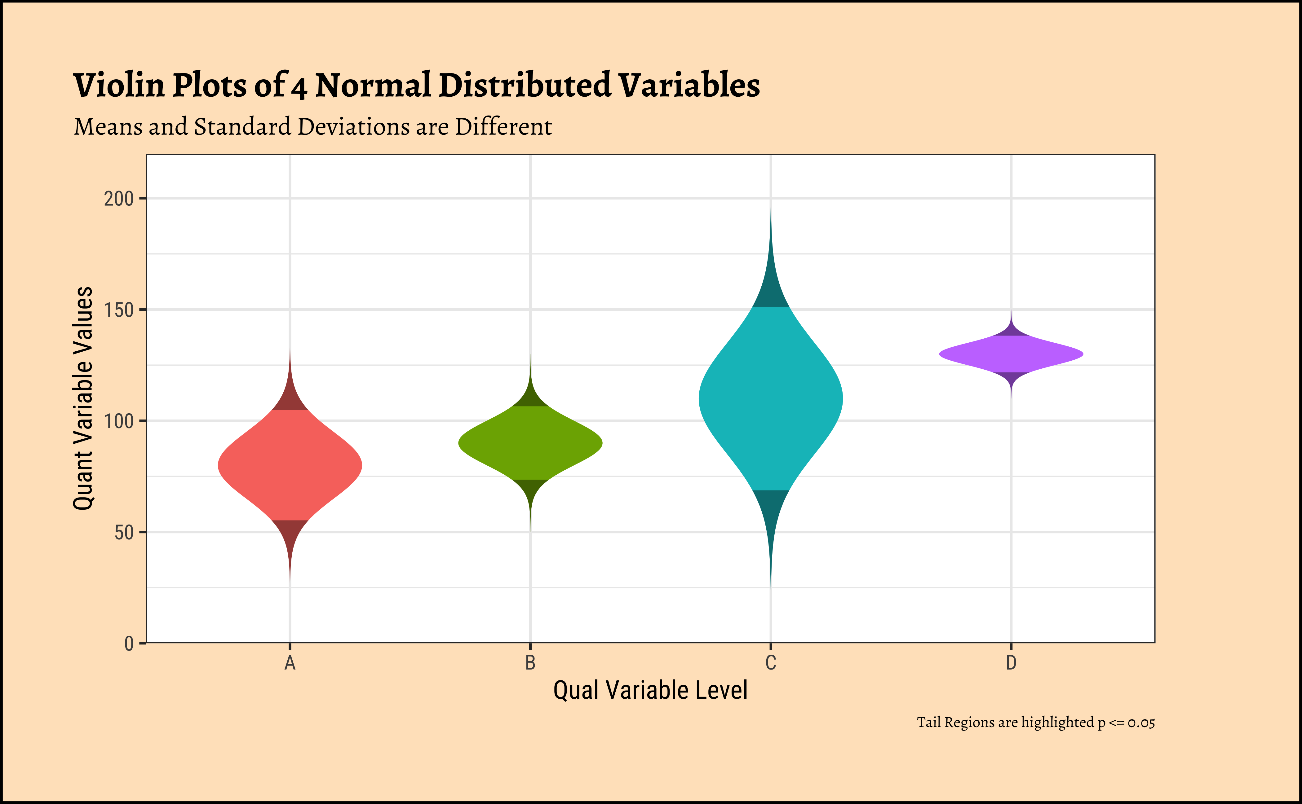 In Figure 2, the plots show (very artificial!) distributions of a single Quant variable across levels of another Qual variable. At each level of the Qual variable along the X-axis, we have a violin plot showing the density.