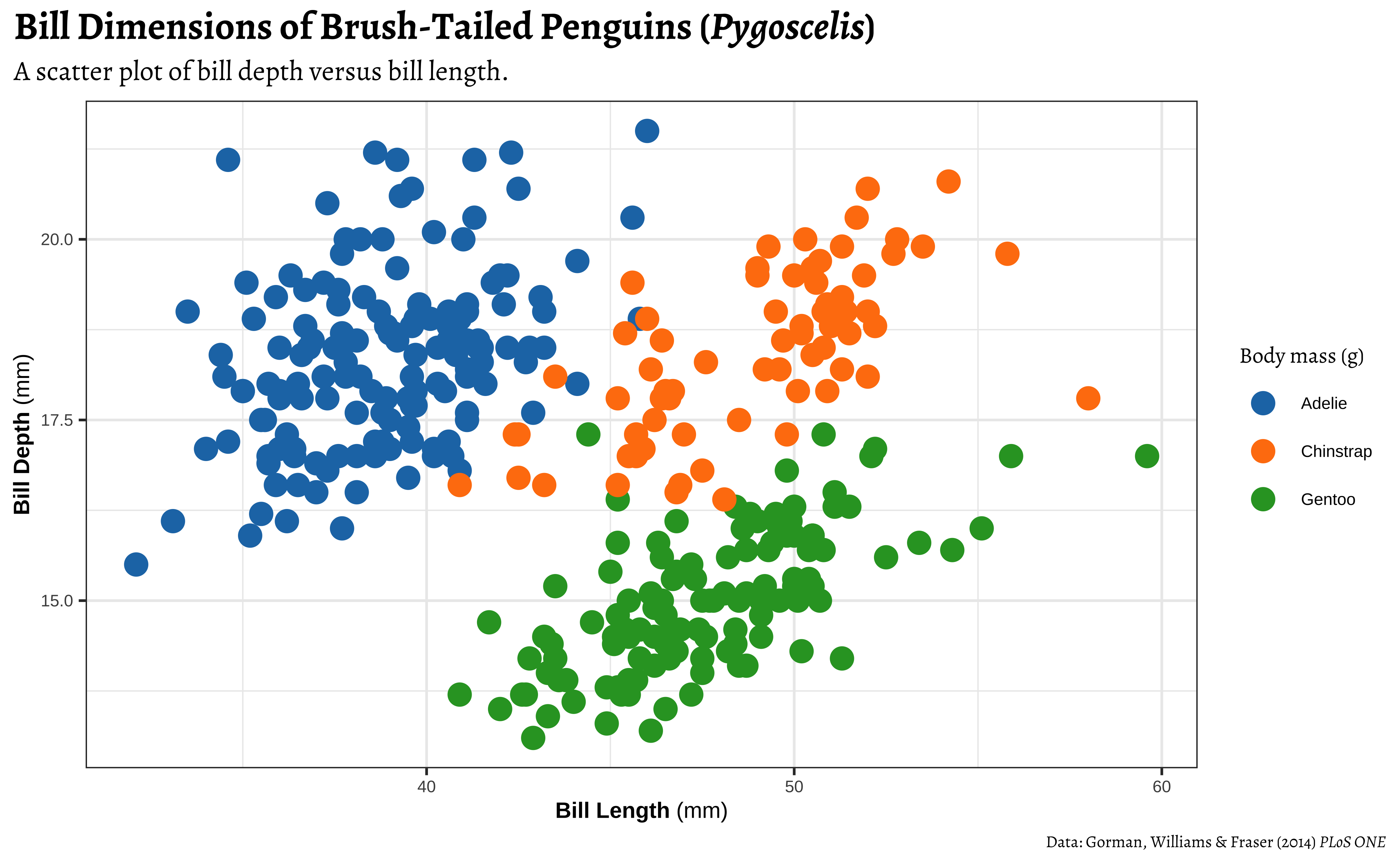 subtitle = "A scatter plot of bill depth versus bill length.",