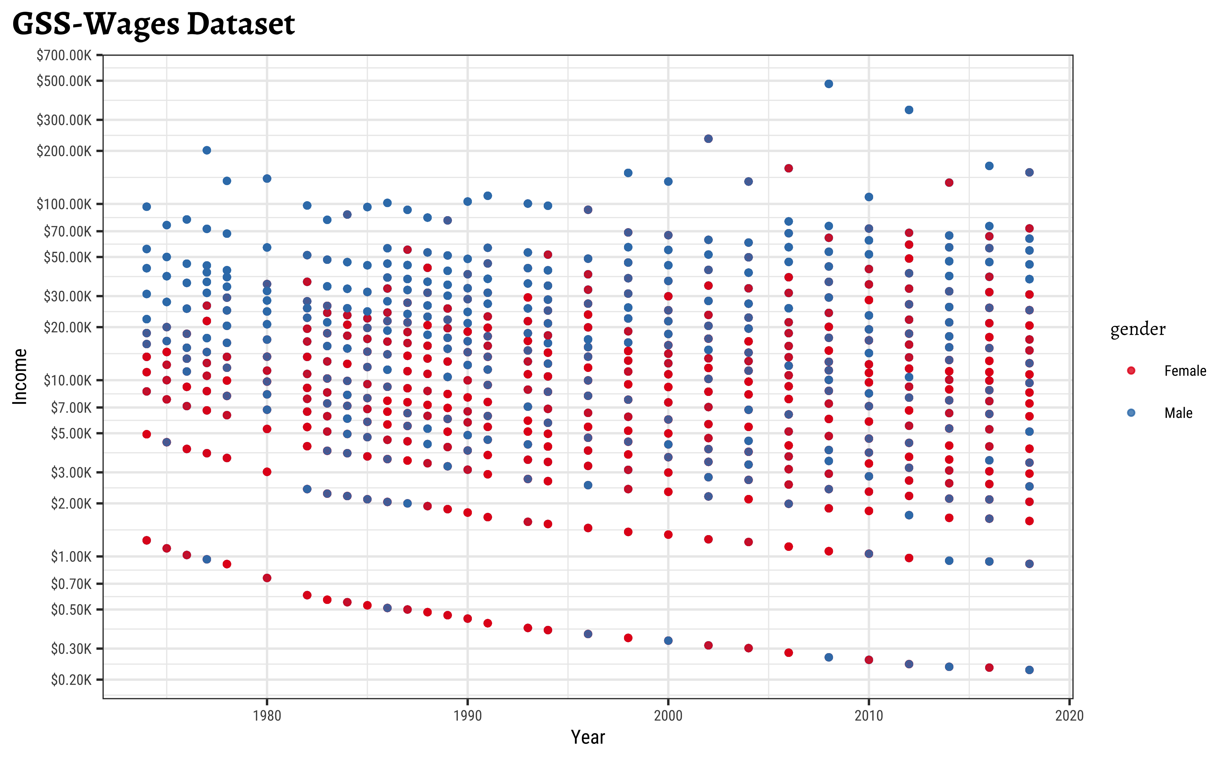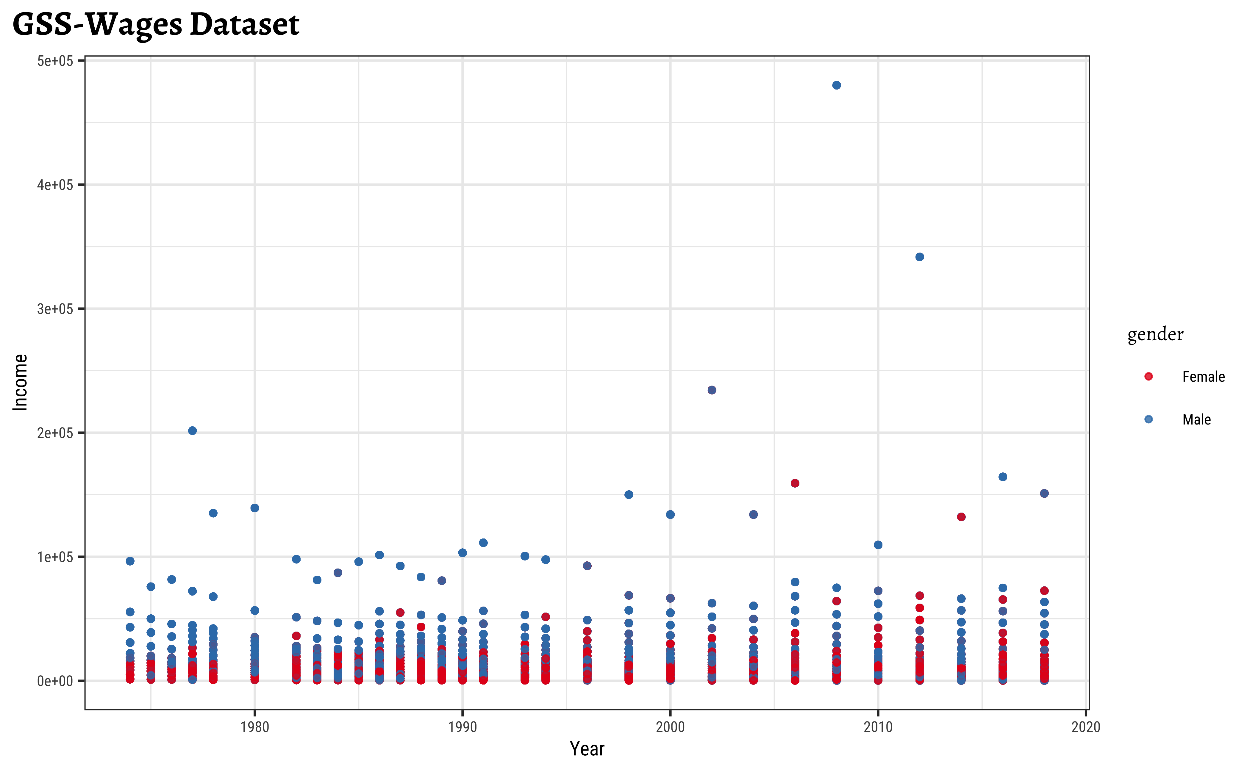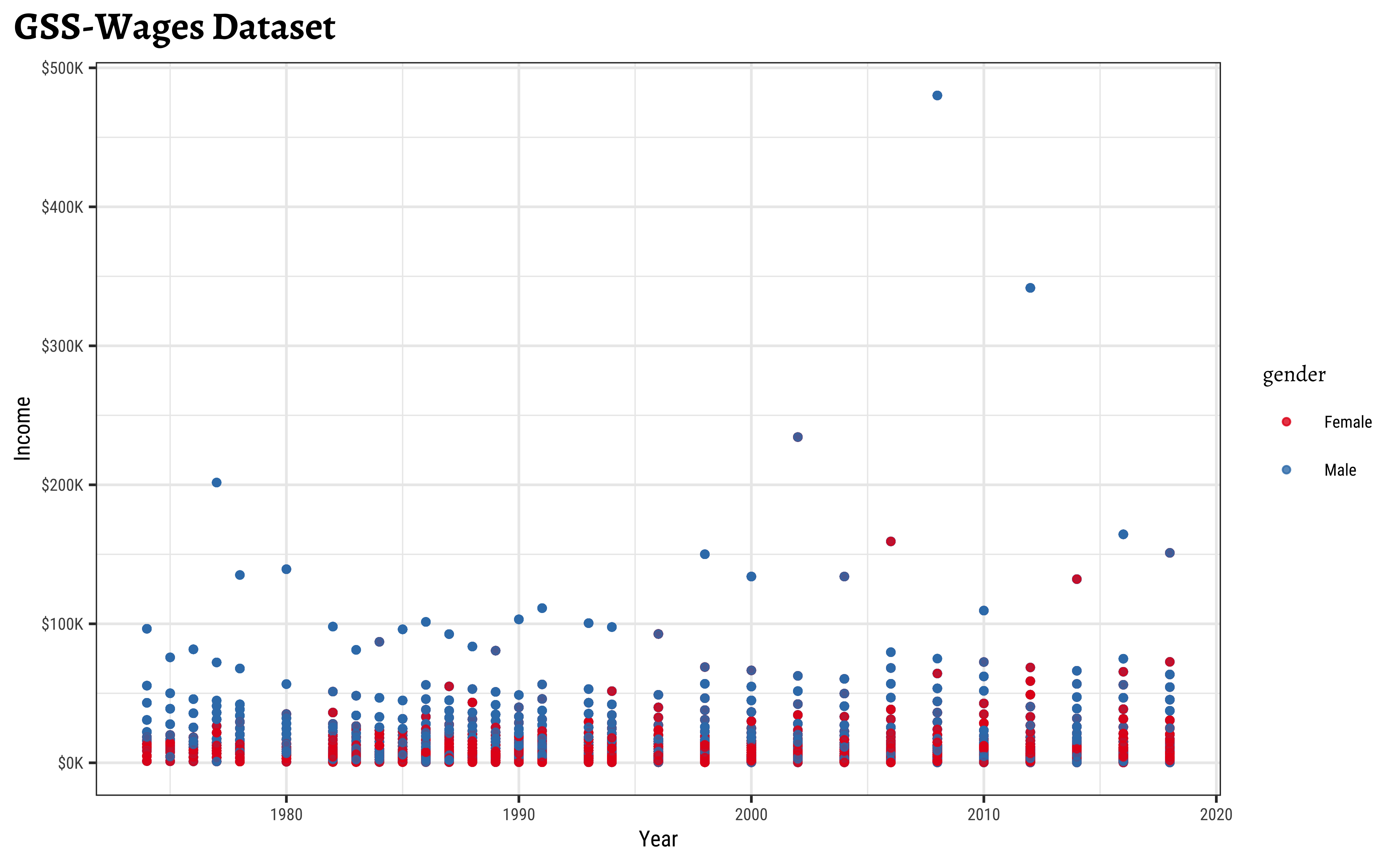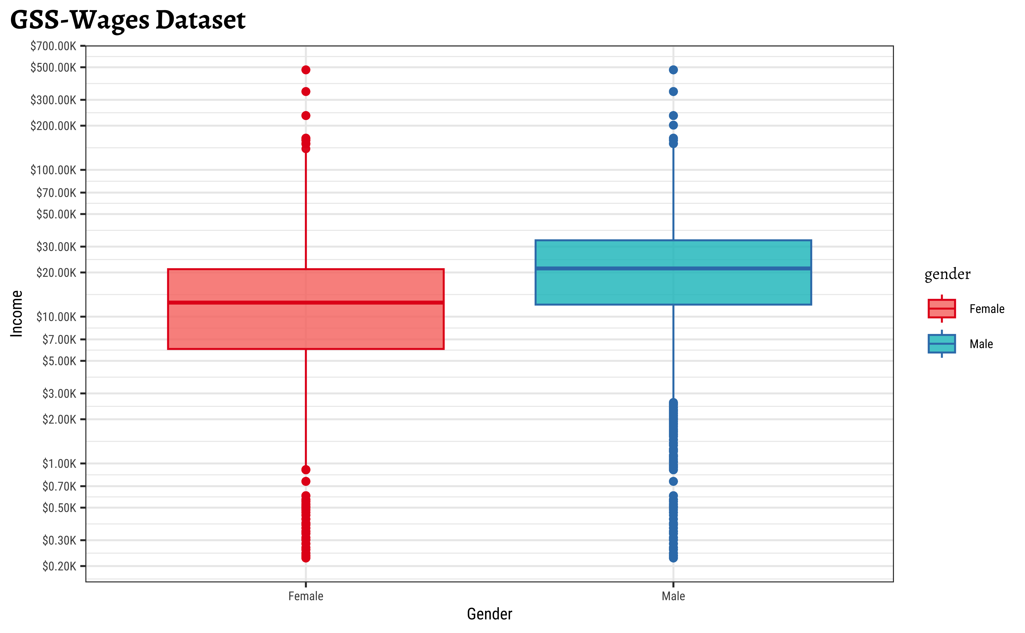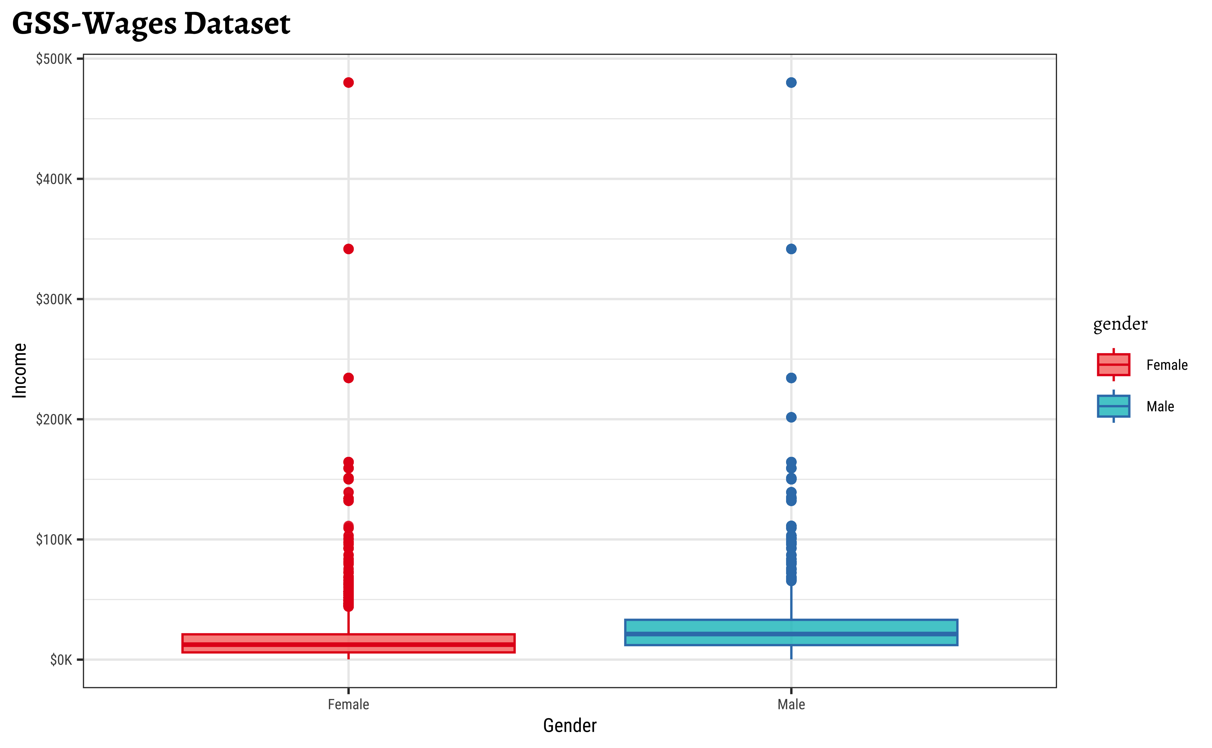 p1<-gf_point( data =gss_wages, realrinc~year, color =~gender, alpha =0.8, size =1)%>%gf_labs(y ="Income", x ="Year", title ="GSS-Wages Dataset")%>%gf_refine(scale_color_brewer(palette ="Set1"))p1p2<-gf_boxplot( data =gss_wages, realrinc~gender, color =~gender, fill =~gender, alpha =0.8, orientation ="x")%>%gf_labs( y ="Income", x ="Gender", title ="GSS-Wages Dataset")%>%gf_refine(scale_color_brewer(palette ="Set1"))p2