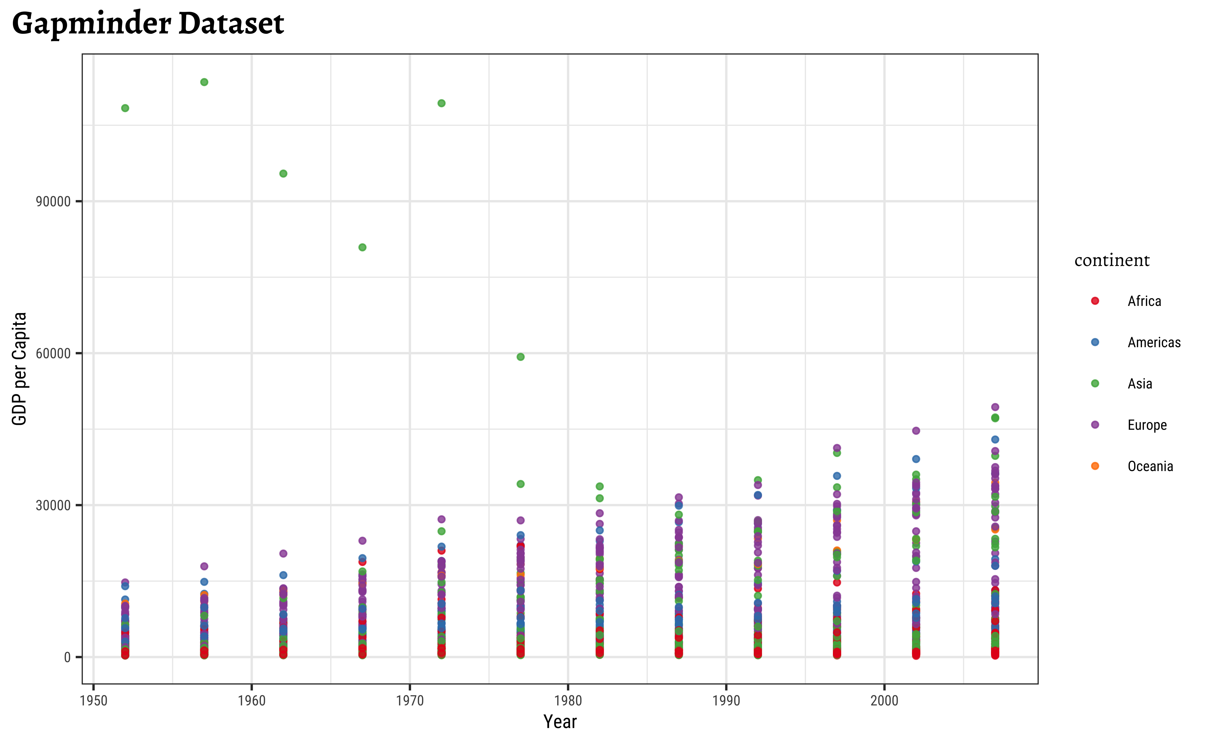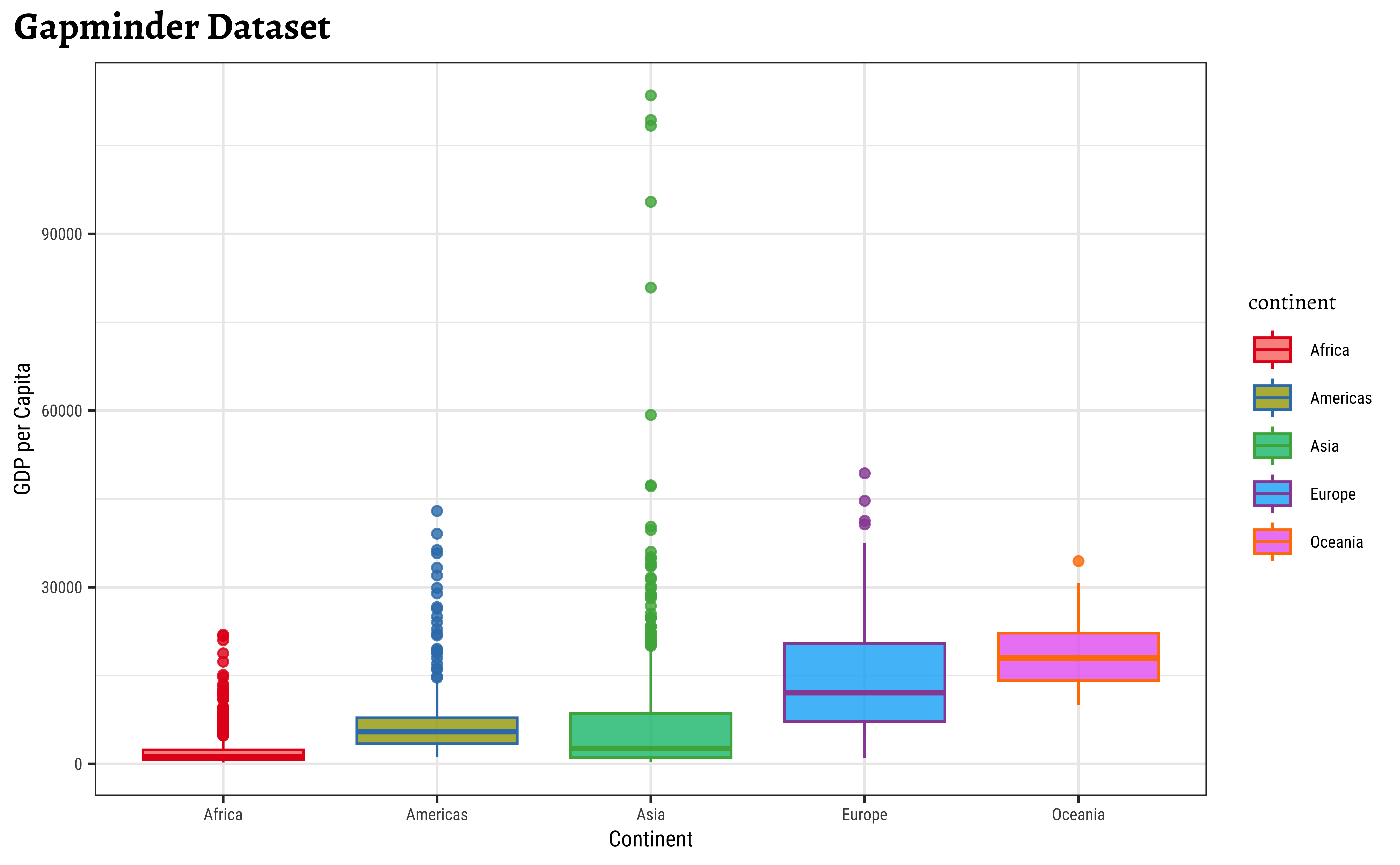 p1<-gf_point( data =gapminder, gdpPercap~year, color =~continent, alpha =0.8, size =1)%>%gf_labs(y ="GDP per Capita", x ="Year", title ="Gapminder Dataset")%>%gf_refine(scale_color_brewer(palette ="Set1"))p1p2<-gf_boxplot( data =gapminder, gdpPercap~continent, color =~continent, fill =~continent, alpha =0.8, orientation ="x")%>%gf_labs(y ="GDP per Capita", x ="Continent", title ="Gapminder Dataset")%>%gf_refine(scale_color_brewer(palette ="Set1"))p2