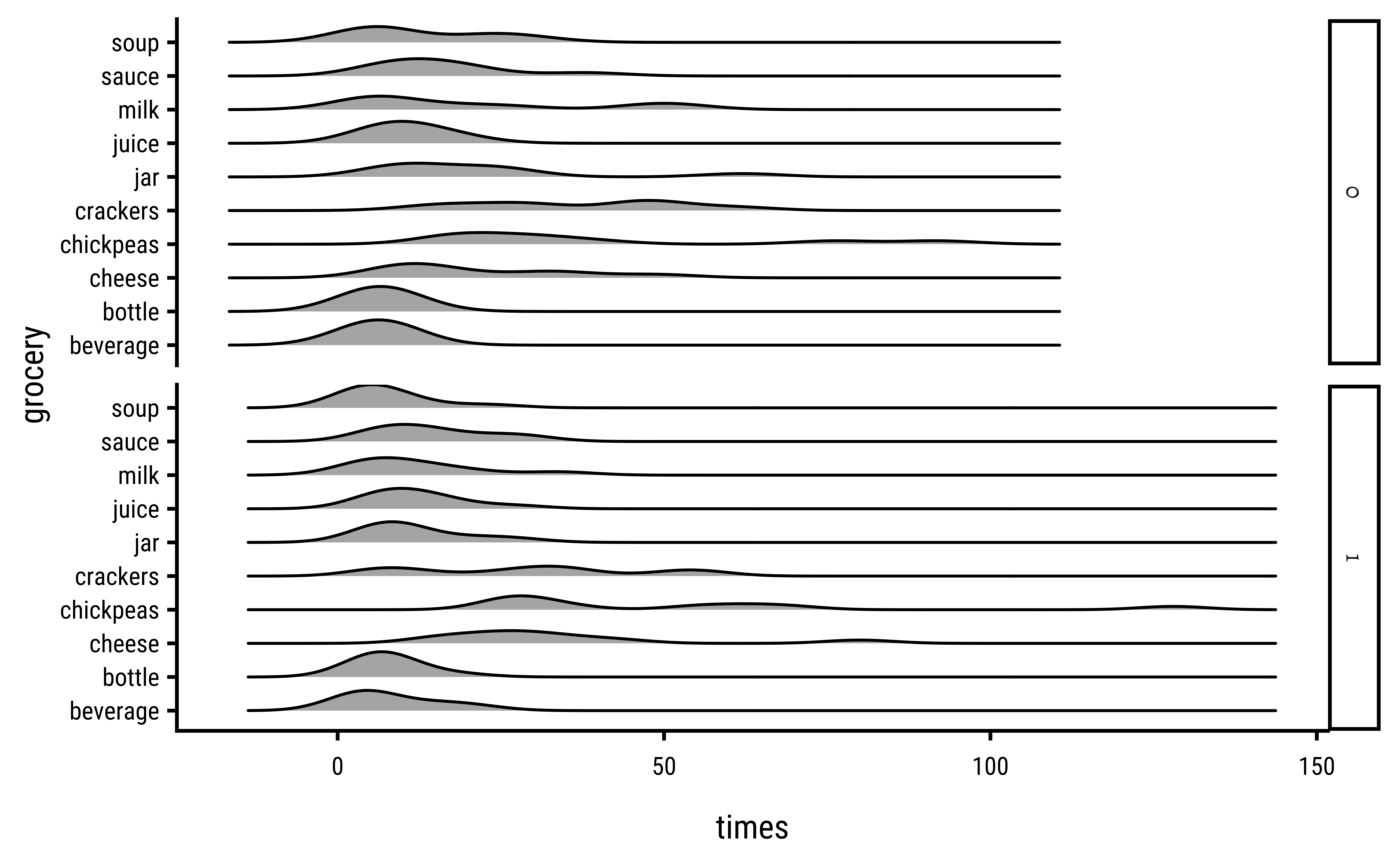 OK, looking better! Now if we plot times, we can colour or facet by grocery.