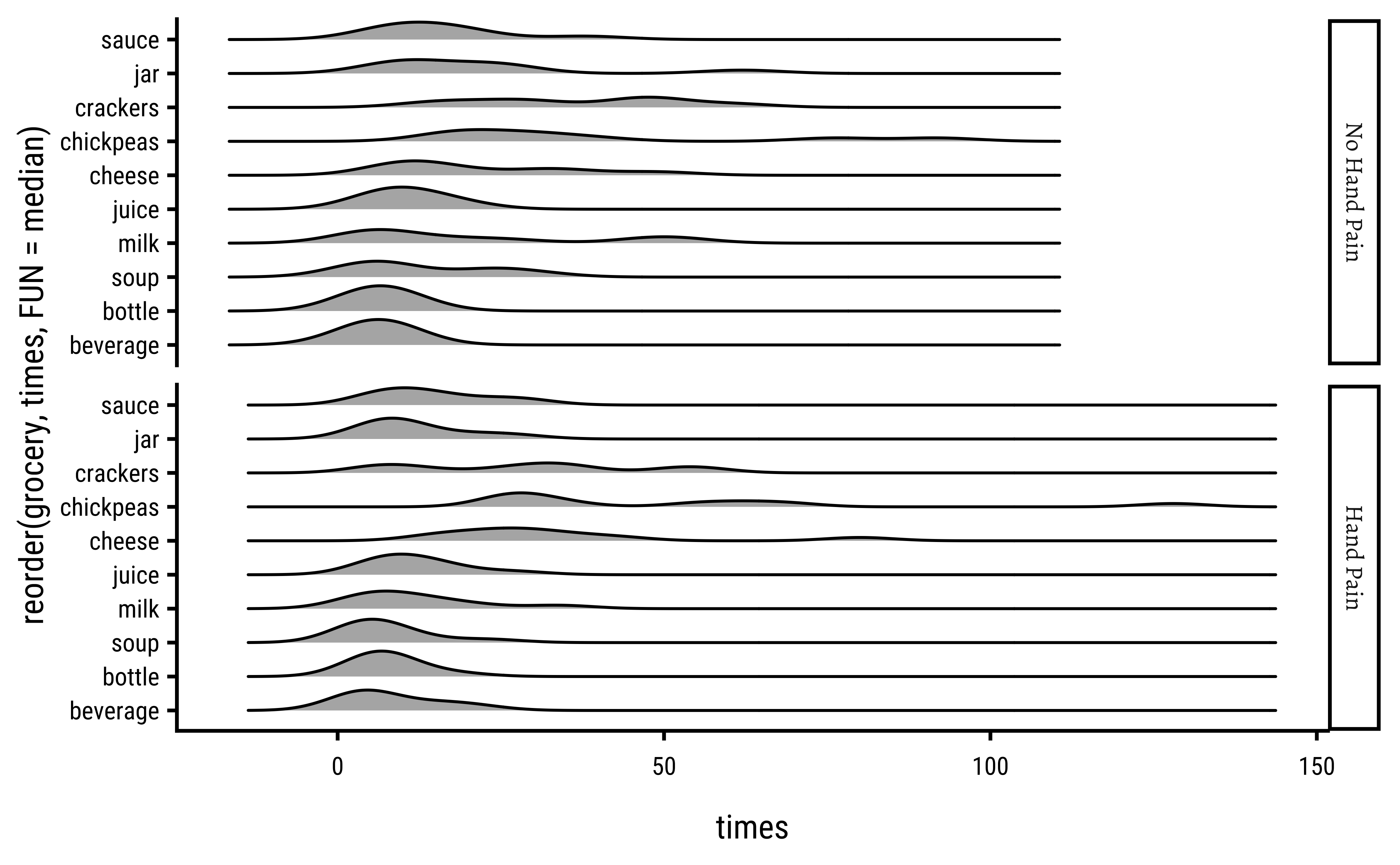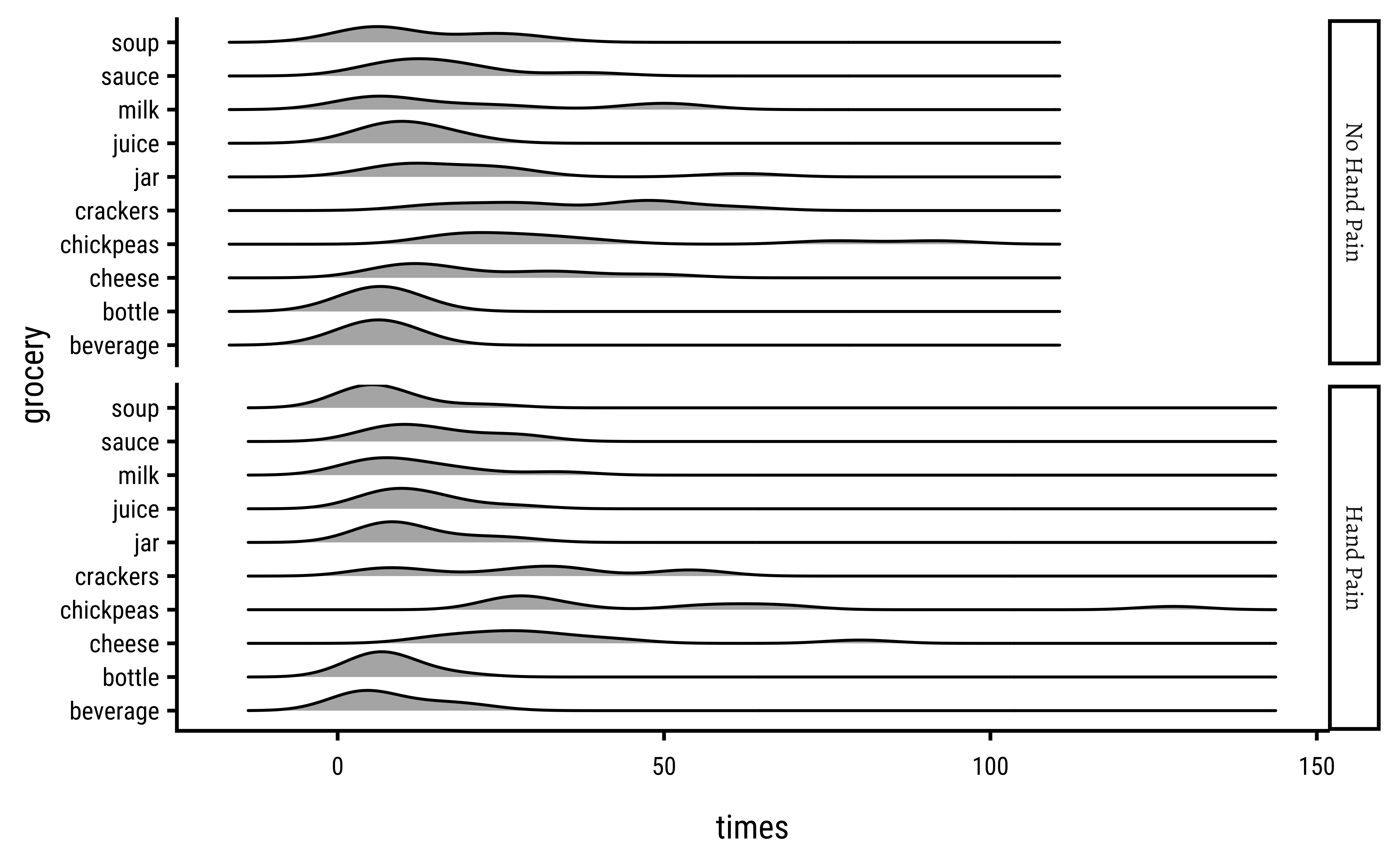 • Time on X; Grocery Item on Y; Density on the ridges; Hand Pain for faceting